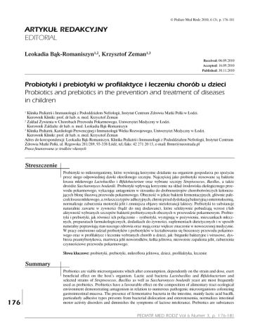 © Pediatr Med Rodz 2010, 6 (3), p. 176-181 artykuł redakcyjny editorial Leokadia Bąk-Romaniszyn1,2, Krzysztof Zeman1,3 Received: 06.09.2010 Accepted: 16.09.2010 Published: 30.11.2010 Probiotyki i prebiotyki w profilaktyce i leczeniu chorób u dzieci Probiotics and prebiotics in the prevention and treatment of diseases in children Klinika Pediatrii i Immunologii z Pododdziałem Nefrologii, Instytut Centrum Zdrowia Matki Polki w Łodzi. Kierownik Kliniki: prof. dr hab. n. med. Krzysztof Zeman 2 Zakład Żywienia w Chorobach Przewodu Pokarmowego, Uniwersytet Medyczny w Łodzi. Kierownik Zakładu: dr hab. n. med. Leokadia Bąk-Romaniszyn 3 Klinika Pediatrii, Kardiologii Prewencyjnej i Immunologii Wieku Rozwojowego, Uniwersytet Medyczny w Łodzi. Kierownik Kliniki: prof. dr hab. n. med. Krzysztof Zeman Adres do korespondencji: Leokadia Bąk-Romaniszyn, Klinika Pediatrii i Immunologii z Pododdziałem Nefrologii, Instytut Centrum Zdrowia Matki Polki, ul. Rzgowska 281/289, 93-338 Łódź, tel./faks: 42 271 20 15, e-mail: [email protected] Praca finansowana ze środków własnych 1 Streszczenie Probiotyki to mikroorganizmy, które wywierają korzystne działanie na organizm gospodarza po spożyciu przez niego odpowiedniej dawki określonego szczepu. Najczęściej jako probiotyki stosowane są bakterie kwasu mlekowego Lactobacillus i Bifidobacterium oraz wybrane szczepy Streptococcus, Bacillus, a także drożdże Saccharomyces boulardii. Probiotyki wpływają korzystnie na skład środowiska ekologicznego przewodu pokarmowego, wykazując antagonizm w stosunku do drobnoustrojów chorobotwórczych kolonizujących błonę śluzową przewodu pokarmowego. Obecność w jelicie bakterii fermentacyjnych, głównie pałeczek kwasu mlekowego, a zwłaszcza typów adhezyjnych, chroni przed dyslokacją bakteryjną i enterotoksemią, normalizuje zaburzenia motoryki jelit i zmniejsza objawy nietolerancji laktozy. Prebiotyki to substancje naturalnie zawarte w żywności (bądź do niej dodawane), które selektywnie pobudzają wzrost i/lub aktywność wybranych szczepów bakterii probiotycznych obecnych w przewodzie pokarmowym. Probiotyki i prebiotyki, jak również ich połączenie – synbiotyki, występują w pożywieniu, mieszankach mlecznych, preparatach farmakologicznych, dodatkach do żywności, suplementach dietetycznych i w sposób naturalny poprawiają stan naszego zdrowia oraz mają coraz większe znaczenie w nowoczesnej medycynie. W pracy omówiono udział probiotyków i prebiotyków w kształtowaniu się biocenozy przewodu pokarmowego oraz w profilaktyce i leczeniu wybranych chorób u dzieci, jak: biegunki bakteryjne i wirusowe, dysbioza poantybiotykowa, martwica jelit noworodków, kolka jelitowa, nieswoiste zapalenia jelit, zaburzenia czynnościowe przewodu pokarmowego. Słowa kluczowe: probiotyki, prebiotyki, mikroflora jelitowa, dzieci, profilaktyka, leczenie Summary 176 Probiotics are viable microorganisms which after consumption, dependently on the strain and dose, exert beneficial effect on the host’s organism. Lactic acid bacteria Lactobacillus and Bifidobacterium and selected strains of Streptococcus, Bacillus as well as Saccharomyces boulardii yeast are most frequently used as probiotics. Probiotics have a favourable effect on the composition of alimentary tract ecological environment demonstrating antagonism in relation to numerous pathogenic microorganisms colonizing gastrointestinal mucosa. The presence of fermentative bacteria in the intestine, mainly lactic acid bacilli, particularly adhesive types prevents from bacterial dislocation and enterotoxemia, normalizes intestinal motor activity disorders and diminishes the symptoms of lactose intolerance. Prebiotics are substances Pediatr Med rodz Vol 6 Numer 3, p. 176-181 artykuł redakcyjny/editorial naturally contained in food (or added to it) which selectively stimulate growth and/or activity of some strains of probiotic bacteria found in the alimentary tract. Probiotics and prebiotics as well as their combination – synbiotics are found in food, milk mixtures, pharmacological preparations, food additives, dietary supplements and they improve in a natural way our health condition and are of greater importance in modern medicine. The study presents the share of probiotics and prebiotics in the formation of alimentary tract biocenosis and their application in the prophylaxis and treatment of selected diseases in children, such as: bacterial and viral diarrhoea, antibiotic-induced disbiosis, necrotizing enterocolitis, intestinal colic, non-specific enteritis, alimentary tract dysfunction. Key words: probiotics, prebiotics, intestinal microflora, children, prevention, treatment P robiotyki (po grecku pro bios – ‘dla życia’) to żywe mikroorganizmy (a nawet ich DNA), które po spożyciu w odpowiedniej dawce wywierają korzystne działanie na organizm gospodarza(1-3). Bakterie probiotyczne charakteryzuje: pochodzenie od człowieka, zdolność do przetrwania w środowisku przewodu pokarmowego z niskim (<3) pH żołądka, kwasami organicznymi i żółciowymi, przeżycie procesów technologicznych oraz brak szkodliwości i udokumentowany korzystny wpływ na zdrowie gospodarza(3). Najczęściej jako probiotyki stosowane są bakterie kwasu mlekowego Lactobacillus i Bifidobacterium oraz wybrane szczepy Streptococcus, Bacillus, a także drożdże z rodzaju Saccharomyces(4). Bakterie z rodzaju Lactobacillus wywierają modulujący wpływ na czynność przewodu pokarmowego dzięki wytwarzanym enzymom – β-glukanom ułatwiającym trawienie i przyswajanie węglowodanów, odgrywają też ważną rolę w procesie fermentacji m.in. polisacharydów w jelicie grubym(5,6). Produkty fermentacji obniżają pH jelit, są źródłem energii dla kolonocytów, stymulują rozwój nabłonka jelitowego, regulują gospodarkę mineralną, pobudzając absorpcję z jelita grubego jonów wapnia, magnezu i żelaza. Bakterie kwasu mlekowego biorą też udział w s