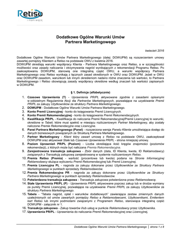 Dodatkowe Ogólne Warunki Umów Partnera Marketingowego kwiecień 2016 Dodatkowe Ogólne Warunki Umów Partnera Marketingowego (dalej: DOWUPM) są rozszerzeniem umowy zawartej pomiędzy Klientem a Retiso na podstawie OWU z kwietnia 2016. DOWUPM określają warunki współpracy Klienta - Partnera Marketingowego oraz Retiso, a w szczególności możliwości oraz zasady naliczania i otrzymywania nagród wynikających z rekomendacji Programu Retiso. Po zaakceptowaniu DOWUPM, stanowią one integralną część OWU, a warunki współpracy Partnera Marketingowego oraz Retiso wynikają z łącznych zasad określonych w OWU oraz DOWUPM. Jeżeli w OWU oraz DOWUPM zasadom, warunkom lub innym określeniom nadano różne znaczenia lub wartości, to Partnera Marketingowego i Retiso obowiązują zasady współpracy określone według znaczeń lub wartości zapisanych w DOWUPM. § 1. Definicje (alfabetycznie) 1. Czasowe Uprawnienia (T) - Uprawnienia PR/PL aktywowane zgodnie z zasadami opisanymi w oddzielnym Regulaminie Akcji dla Partnerów Marketingowych, pozwalające na uzyskiwanie Premii PR/PL za zakupy Użytkowników ze struktury Partnera Marketingowego. 2. DOWUPM - Dodatkowe Ogólne Warunki Umów Partnera Marketingowego. 3. Konto Premii Licencyjnej - konto do księgowania Premii Licencyjnych. 4. Konto Premii Rekomendacyjnej - konto do księgowania Premii Rekomendacyjnych. 5. Kwalifikacja PR/PL - Kwalifikacja do naliczania Premii Rekomendacyjnej/Premii Licencyjnej to warunki, określone w Tabeli, które musi spełnić w miesiącu rozliczeniowym Partner Marketingowy, aby zostały naliczone Premie Rekomendacyjne oraz Licencyjne. 6. Panel Partnera Marketingowego (Panel) - rozszerzona wersja Panelu Klienta umożliwiająca dostęp do danych biznesowych powiązanych ze Strukturą Partnera Marketingowego. 7. Partner Marketingowy - Klient który zawarł umowę z Retiso na podstawie OWU, zaakceptował DOWUPM oraz aktywował Stałe lub Czasowe Uprawnienia PR/PL - strona niniejszej umowy. 8. Poziom Uprawnień PR/PL (Poziom) - Liczba określająca ilość kręgów znajomości (poziomów rekomendacji), z których może być naliczana Premia Rekomendacyjna. 9. Zarejestrowana transakcja zakupowa - Zbiór danych (data, ID Klienta, kwota, ID Reklamodawcy) związanych z Transakcją zakupową zarejestrowaną w systemie rozliczeniowym Retiso. 10. Premia Retiso (Premia) - wartość (procentowa lub kwota) podana na Stronie Informacyjnej Reklamodawcy służąca wyliczeniu Premii Rekomendacyjnej lub Premii Licencyjnej. 11. Premia Licencyjna PL - nagroda za zakupy dokonane przez Użytkowników ze Struktury Partnera Marketingowego w punktach sprzedaży Reklamodawców. 12. Premia Rekomendacyjna PR - nagroda za zakupy dokonane przez Użytkowników ze Struktury Partnera Marketingowego w punktach sprzedaży Reklamodawców. 13. Potwierdzona transakcja zakupowa - Transakcja zakupowa potwierdzona przez Reklamodawcę. 14. Stałe Uprawnienia PR/PL (P) - Uprawnienia PR/PL aktywowane poprzez zakup lub w drodze wymiany za punkty Premii Licencyjnej, pozwalające na uzyskiwanie Premii PR/PL za zakupy Użytkowników ze struktury Partnera Marketingowego. 15. Tabela - “Tabela nagród, opłat i warunków dodatkowych” zawierająca zestaw zmiennych danych uzależnionych od umów zawartych pomiędzy Retiso a Reklamodawcami, Użytkownikami, Emitentem kart Retiso lub innymi podmiotami związanymi z Programem Retiso, stanowiąca integralną część DOWUPM - załącznik nr 1. 16. Transakcja zakupowa - Zakup towarów i/lub usług w punkcie Reklamodawcy przez Użytkownika. 17. Uprawnienia PR/PL - Uprawnienia do naliczania Premii Rekomendacyjnej oraz Licencyjnej. Dodatkowe Ogólne Warunki Umów Partnera Marketingowego │ strona 1 z 8 Rozdział I Partner Marketingowy – ogólne zasady współpracy § 1. Ogólne zasady współpracy Partnera Marketingowego, Reklamodawców oraz Retiso 1. Partner Marketingowy jest Klientem posiadającym rozszerzone możliwości współpracy z Retiso, które 2. 3. 4. 5. 6. 7. 8. pozwalają na większą aktywność w zakresie rekomendacji Programu Retiso oraz odnoszenie korzyści zarówno z tytułu rekomendacji bezpośredniej jak i pośredniej. Rekomendacja Programu Retiso nie jest obowiązkowa. Partner Marketingowy musi posiadać aktywne Uprawnienia PR/PL. W zależności od aktualnie posiadanych Uprawnień PR/PL, Poziomu Uprawnień PR/PL oraz spełnienia warunku Kwalifikacji PR/PL, Partner Marketingowy może otrzymywać od Retiso Premie Rekomendacyjne/Licencyjne za zakupy bezpośrednio i pośrednio rekomendowanych Użytkowników. Retiso umożliwia Partnerowi Marketingowemu korzystanie z Panelu, poprzez który Partner Marketingowy otrzymuje informacje o danych związanych z jego Strukturą oraz ofertami Reklamodawców, a w szczególności o organizowanych przez nich akcjach promocyjnych skierowanych do Użytkowników portalu. Partner Marketingowy działa jako samodzielny podmiot, nie jest upoważniony i nie ma umocowania do reprezentowania Retiso wobec osób trzecich oraz dokonywania jakichkolwiek czynności prawnych i składania oświadczeń woli w imieniu Retiso. Partner Marketingowy może używać w materiałach marketingowych promujących własną działalność nazwę “Niezależny Partner Marketingowy”. Prawa i zobowiązania Partnera Marketingowego wynikające z postanowień niniejszych DOWUPM nie mogą być przeniesione ani przejęte w całości lub w części przez kogokolwiek bez uprzedniej pisemnej zgody Retiso. § 2. Rekomendacja Programu Retiso 1. Partner Marketingowy może zaprosić do Programu maksymalnie 20 (dwadzieścia) bezpośrednich (1. 2. 3. 4. 5. poziom rekomendacji) nowych Użytkowników. Aktualna liczba dostępnych zaproszeń uzależniona jest od posiadanych Uprawnień PR/PL oraz Poziomu Uprawnień PR/PL. Rejestracja kolejnych bezpośrednich Użytkowników – powyżej 20 - możliwa jest wyłącznie za uprzednią zgodą Retiso. Retiso może zwiększyć liczbę dostępnych zaproszeń w przypadku