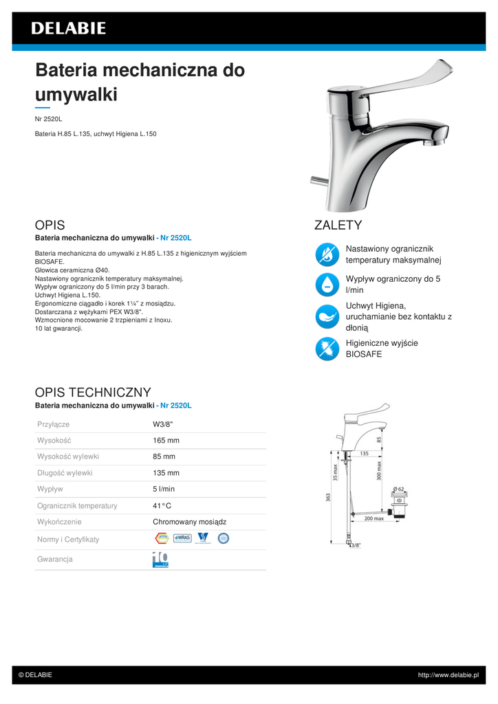Bateria mechaniczna do umywalki Nr 2520L Bateria H.85 L.135, uchwyt Higiena L.150 OPIS ZALETY Bateria mechaniczna do umywalki - Nr 2520L Bateria mechaniczna do umywalki z H.85 L.135 z higienicznym wyjściem BIOSAFE. Głowica ceramiczna Ø40. Nastawiony ogranicznik temperatury maksymalnej. Wypływ ograniczony do 5 l/min przy 3 barach. Uchwyt Higiena L.150. Ergonomiczne ciągadło i korek 1¼² z mosiądzu. Dostarczana z wężykami PEX W3/8". Wzmocnione mocowanie 2 trzpieniami z Inoxu. 10 lat gwarancji. Nastawiony ogranicznik temperatury maksymalnej Wypływ ograniczony do 5 l/min Uchwyt Higiena, uruchamianie bez kontaktu z dłonią Higieniczne wyjście BIOSAFE OPIS TECHNICZNY Bateria mechaniczna do umywalki - Nr 2520L Przyłącze W3/8" Wysokość 165 mm Wysokość wylewki 85 mm Długość wylewki 135 mm Wypływ 5 l/min Ogranicznik temperatury 41°C Wykończenie Chromowany mosiądz Normy i Certyfikaty Gwarancja © DELABIE http://www.delabie.pl