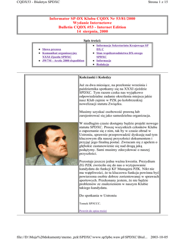 CQDX53 - Biuletyn SPDXC Strona 1 z 15 Informator SP-DX Klubu CQDX Nr 53/81/2000 Wydanie Internetowe Bulletin CQDX #53 - Internet Edition 14 sierpnia, 2000 Spis tre ci: l l l l S owo prezesa Komunikat organizacyjny XXXI Zjazdu SPDXC JW7M - Arctic 2000 dxpedition l l l Informacje Sekretariatu Krajowego SP DX C Stan wsp zawodnictwa DX-owego SPDXC Informacje Redakcja Kole anki i Koledzy Ju za dwa miesi ce, na prze omie wrze nia i pa dziernika spotkamy si na XXXI zje dzie SPDXC. Tym razem czeka nas wyj tkowo odpowiedzialne zadanie okre lenia miejsca jakie nasz Klub zajmie w PZK po ko obrzeskiej nowelizacji statutu Zwi zku. Musimy uzyska osobowo prawn lub zarejestrowa si jako samodzielna organizacja. W nied ugim czasie dost pny b dzie projekt nowego statutu SPDXC. Prosz wszystkich cz onków Klubu o zapoznanie si z nim, tak by w czasie obrad w Ustroniu, sprawnie przeprowadzi dyskusj nad tym kluczowym dla naszej przysz ci dokumentem i przyj jego finaln posta . Zwracam si z apelem o bokie zastanowienie si nad drog jak pod ymy. Sami musimy zdecydowa o naszej przysz ci. Pozostaje jeszcze jedna wa na kwestia. Prezydium ZG PZK zwróci o si do nas o wytypowanie kandydata do funkcji KF Managera PZK. Nikt nie ma w tpliwo ci, e ta kluczowa funkcja powinna by powierzona osobie dobrze zorientowanej w sprawach sportowych. Przekonany jestem, e nie b dzie problemów ze znalezieniem w naszym Klubie takiego kandydata. Do spotkania w Ustroniu Tomek SP5CCC. Powrót do spisu tre ci file://D:\Moje%20dokumenty\memo_pzk\SPDXC\www.sp5pbe.waw.pl\SPDXC\Biul... 2003-10-05 CQDX53 - Biuletyn SPDXC Strona 2 z 15 Komunikat organizacyjny XXXI Zjazdu SPDXC Termin Zjazdu: 29.09 - 1.10.2000 Miejsce Zjazdu: Hotel MAGNOLIA ul. Szpitalna 15 43-450 Ustro telefon: 0 33 8543690 fax: 0 33 8543332 e-mail: [email protected] Hotel usytuowany jest w dzielnicy Zawodzie. Noclegi w pokojach dwu i trzyosobowych z azienk i TV. Koszt Zjazdu 29.09 pi tek kolacja - 10 z Nocleg - 50 z RAZEM 60 z 30.09 sobota niadanie (bufet) - 15 z obiad - 20 z bankiet + ognisko 40 z Nocleg - 50 z RAZEM 125 z 1.10 niedziela niadanie - 15 z obiad - 20 z RAZEM 35 z Koszt ca kowity za 2,5 dnia 220 z Zg oszenia Zg oszenia udzia u w zje dzie nale y kierowa na adres hotelu MAGNOLIA poczt e-mail na adres ([email protected]) lub faksem (0 33 8543332) z zaznaczeniem "Zjazd SPDXC" oraz wyra nie podanym nazwiskiem oraz znakiem uczestnika. Wp aty Wp aty w wysoko ci zale nej od czasu uczestnictwa (nale y poda jakich dni dotyczy wp ata) dokona nale y na konto: P.F.I. Hotel "Magnolia" Bank Spó dzielczy Ustro Nr konta 81290004-90245-27026 Na przekazie nale y wpisa "dotyczy Zjazdu SPDXC". Ze wzgl dów organizacyjnych, wp at nale y dokonywa najpó niej do dnia 20.09.2000 r. Dojazd Dojazd kolej lub autobusem do Katowic i dalej do Ustronia. Rozk ad jazdy poci gów z Katowic do Ustronia: 05.40 , 06.43 (kursuje tylko w soboty i niedziele) , 07.15 , 08.10 (pospieszny, kursuje tylko w soboty file://D:\Moje%20dokumenty\memo_pzk\SPDXC\www.sp5pbe.waw.pl\SPDXC\Biul... 2003-10-05 CQDX53 - Biuletyn SPDXC Strona 3 z 15 i niedziele), 09.23 , 15.50 , 19.29 Uwaga : wysiada nale y na stacji Ustro -Zdrój. Rozk ad jazdy autobusów PKS z Katowic do Ustronia: 07.10 , 08.50 , 11,40 , 13.10 , 15.10 ,17.10, 19.10 Uwaga : wysiada nale y na przystanku Ustro Rynek. Informacje dodatkowe Komunikacja radiowa dla uczestników zjazdu zapewniona b dzie na UKF przez przemiennik SR0SC (145,775 MHz) oraz na cz stotliwo ci 145,550 MHz. Pracowa b dzie stacja organizatora SP0DXC. Na miejscu, w holu g ównym czynna b dzie recepcja organizatorów zjazdu. Wszelkie zapytania zwi zane z uczestnictwem w XXXI Zje dzie SPDXC nale y kierowa do Andrzeja SP9UNX, e-mail ([email protected]). Informacje dotycz ce miejsca zjazdu Ustronia, mo na znale na stronie: http://www.miasto-ustron.pl. Informacje o Zje dzie dost pne s równie na stronie SPDXC: http://www.sp5pbe.waw.pl/SPDXC/, oraz w CQDX Nr 53/2000. Warszawa, 2000.07.21 Powrót do spisu tre ci JW7M - Arctic 2000 dxpedition Teraz mog si ju przyzna , e od pa dziernika 1988 marzy em o tym aby wyjecha chocia na chwil , nawet bez radia na Svalbard. Zawsze pasjonowa a mnie ta okolica wiata a od momentu powrotu ze Svalbardu w nie w pa dzierniku 1988 pragnienie, aby tam wróci chwilami by o naprawd silne. Pierwszy raz na Svalbardzie znalaz em si pod koniec czerwca 1988 w bazie Uniwersytetu im. Marii Curie-Sk odowskiej w Calypsobyen w Belsundzie. Mia em bardzo du o szcz cia znale si pomi dzy lud mi dotkni tymi "virusem polarnym" ju wiele lat wcze niej ni ja, w ród ludzi dla których Svalbard jest drugim domem. Tym razem propozycja wyprawy na JW przysz a nieoczekiwanie. Jednego dnie dosta em e-maile od dwóch przyjació SP5ES i SP5EAQ znaj cych moje sympatie do pó nocnych terenów, o organizowanej wyprawie Arctic 2000. Zg osi em akces jeszcze tego samego dnia. Terje LA3OHA na drugi dzie potwierdzi e-mailem mo liwo mojego uczestnictwa w wyprawie. By em zachwycony. Podczas mojego wyjazdu s bowego do Szwecji wyskoczy em na "weekend" do Norwegii aby pozna osobi cie g ównych animatorów Terjie LA3OHA i Jona LA7IL. Dane mi by o równie pozna LA7ZO, jednego z LA big gunów. Podczas tego spotkania powsta o wiele ustale które, mia y nada jaki porz dek ca ej wyprawie. Dla mnie wyprawa zacz a si na dobre dopiero o godz 12:00 5-tego lipca na Ok ciu. Tak wielkich umów nigdy tam nie widzia em i chocia mia em dwie godziny zapasu to i tak stewardessa szuka a mnie w kolejce do odprawy paszportowej, abym nie opó nia odlotu samolotu do Oslo. Nast pnego dnia na lotnisku w Oslo wszyscy uczestnicy wyprawy spotkali si naprawd po raz pierwszy. Ca a grupa odrobin jeszcze nieufna w stosunku do siebie, spotka a si ok. godz 15:00 w sali odpraw. By o nas w sumie niema o, Ja , Terje LA3OHA z on May i synem Christerem, Jon LA7IL, Dave KF6XA, Jeffrey KG0VL, Sasza S57FYL, Tili S53AC, Hokan SM3EQY, Staffan SM3JGG, Andrea file://D:\Moje%20dokumenty\memo_pzk\SPDXC\www.sp5pbe.waw.pl\SPDXC\Biul... 2003-10-05 CQDX53 - Bi
