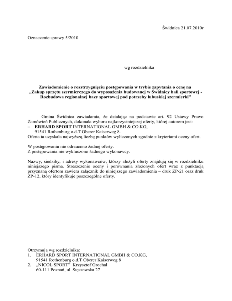Świdnica 21.07.2010r Oznaczenie sprawy 5/2010 wg rozdzielnika Zawiadomienie o rozstrzygnięciu postępowania w trybie zapytania o cenę na „Zakup sprzętu szermierczego do wyposażenia budowanej w Świdnicy hali sportowej Rozbudowa regionalnej bazy sportowej pod potrzeby lubuskiej szermierki” Gmina Świdnica zawiadamia, że działając na podstawie art. 92 Ustawy Prawo Zamówień Publicznych, dokonała wyboru najkorzystniejszej oferty, której autorem jest: − ERHARD SPORT INTERNATIONAL GMBH & CO.KG, 91541 Rothenburg o.d.T Oberer Kaiserweg 8. Oferta ta uzyskała najwyższą liczbę punktów wyliczonych zgodnie z kryteriami oceny ofert. W postępowaniu nie odrzucono żadnej oferty. Z postępowania nie wykluczono żadnego wykonawcy. Nazwy, siedziby, i adresy wykonawców, którzy złożyli oferty znajdują się w rozdzielniku niniejszego pisma. Streszczenie oceny i porównania złożonych ofert wraz z punktacją przyznaną ofertom zawiera załącznik do niniejszego zawiadomienia – druk ZP-21 oraz druk ZP-12, który identyfikuje poszczególne oferty. Otrzymują wg rozdzielnika: 1. ERHARD SPORT INTERNATIONAL GMBH & CO.KG, 91541 Rothenburg o.d.T Oberer Kaiserweg 8 2. „NICOL SPORT” Krzysztof Grochal 60-111 Poznań, ul. Stęszewska 27