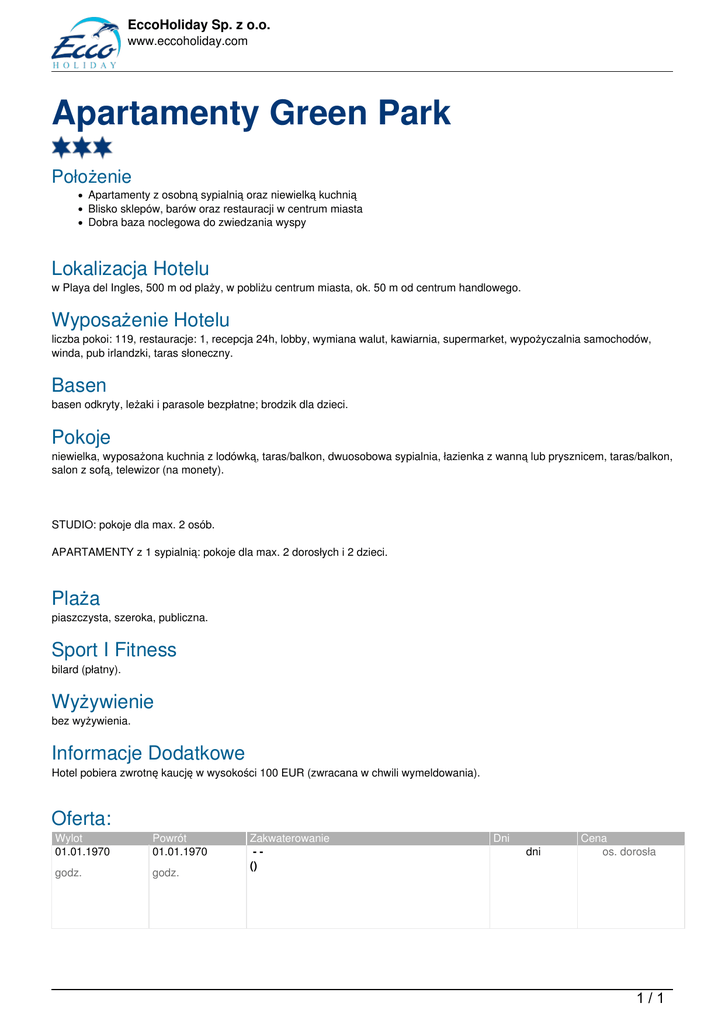 EccoHoliday Sp. z o.o. www.eccoholiday.com Apartamenty Green Park Położenie Apartamenty z osobną sypialnią oraz niewielką kuchnią Blisko sklepów, barów oraz restauracji w centrum miasta Dobra baza noclegowa do zwiedzania wyspy Lokalizacja Hotelu w Playa del Ingles, 500 m od plaży, w pobliżu centrum miasta, ok. 50 m od centrum handlowego. Wyposażenie Hotelu liczba pokoi: 119, restauracje: 1, recepcja 24h, lobby, wymiana walut, kawiarnia, supermarket, wypożyczalnia samochodów, winda, pub irlandzki, taras słoneczny. Basen basen odkryty, leżaki i parasole bezpłatne; brodzik dla dzieci. Pokoje niewielka, wyposażona kuchnia z lodówką, taras/balkon, dwuosobowa sypialnia, łazienka z wanną lub prysznicem, taras/balkon, salon z sofą, telewizor (na monety). STUDIO: pokoje dla max. 2 osób. APARTAMENTY z 1 sypialnią: pokoje dla max. 2 dorosłych i 2 dzieci. Plaża piaszczysta, szeroka, publiczna. Sport I Fitness bilard (płatny). Wyżywienie bez wyżywienia. Informacje Dodatkowe Hotel pobiera zwrotnę kaucję w wysokości 100 EUR (zwracana w chwili wymeldowania). Oferta: Wylot 01.01.1970 Powrót 01.01.1970 godz. godz. Zakwaterowanie -() Dni dni Cena os. dorosła 1/1 Powered by TCPDF (www.tcpdf.org)
