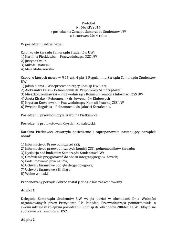 Protokół Nr 56/KP/2014 z posiedzenia Zarządu Samorządu Studentów UW z 4 czerwca 2014 roku W posiedzeniu udział wzięli: Członkowie Zarządu Samorządu Studentów UW: 1) Karolina Pietkiewicz – Przewodnicząca ZSS UW 2) Justyna Czauż 3) Mikołaj Matusik 4) Maja Matuszewska Osoby, o których mowa w § 15 ust. 4 pkt 1 Regulaminu Zarządu Samorządu Studentów UW: 1) Jakub Alama – Wiceprzewodniczący Komisji UW Here 2) Aleksandra Biłas – Pełnomocnik ds. Współpracy Samorządowej 3) Mieszko Czerniawski – Przewodniczący Komisji Promocji i Informacji ZSS UW 4) Aneta Kiszko – Pełnomocnik ds. Juwenaliów Klubowych 5) Krystian Kowalewski – Przewodniczący Komisji Prawnej ZSS UW 6) Ewelina Rogulska – Pełnomocnik ds. Jakości Kształcenia. Posiedzeniu przewodniczyła: Karolina Pietkiewicz. Posiedzenie protokołował: Krystian Kowalewski. Karolina Pietkiewicz otworzyła posiedzenie i zaproponowała następujący porządek obrad: 1) Informacje od Przewodniczącej ZSS; 2) Informacje od przewodniczących komisji ZSS i pełnomocników Zarządu; 3) Dyskusja nad budżetem Samorządu Studentów UW; 4) Omówienie przygotowań do obozu integracyjnego w Łazach; 5) Podsumowanie juwenaliów; 6) Uchwały finansowe podjęte droga obiegową; 7) Uchwały finansowe z III filaru; 8) Wolne wnioski. Proponowany porządek obrad został jednogłośnie zaakceptowany. Ad pkt 1 Delegacja Samorządu Studentów UW wzięła udział w obchodach Dnia Wolności organizowanych przez Prezydenta RP. Ponadto, Przewodnicząca poinformowała o swoim udziale w kolejnym posiedzeniu Komisji ds. obchodów 200-lecia UW. Odbyło się spotkanie ws. remontu w DS2. Ad pkt 2 1)Wiceprzewodniczący Komisji UW Here poinformował o organizowanym turnieju w bubble football. Dodatkowo udało się wycenić przygotowywaną aplikację z promocjami na urządzenia mobilne. Drużyna złożona z członków Komisji startuje w konkursie PZU na najlepszy projekt studencki. 2)Przewodnicząca Komisji ds. Koordynacji Projektów poinformowała o zakończeniu akcji ‘Posprzątaj swoją szafę na wiosnę’ i zaangażowaniu w projekt kilku samorządów jednostkowych. 3)Pełnomocnik ds. jakości kształcenia reprezentowała Samorząd Studentów na konkursie otwartym SzJO. 4)Pełnomocnik ds. Juwenaliów Klubowych przedstawiła budżet rozliczeniowy projektu. Trwają prace nad całościowym rozliczeniem wydarzenia. 5)Przewodniczący Komisji ds. Studenckich poinformował o rozesłaniu ogólnej ankiety do Raportu Studenckiego 2014 do 31886 studentów dziennych i niestacjonarnych wieczorowych. Ponadto przekazał informację o zgłoszeniu zapotrzebowania na miejsca w domach studenta UW przez Zarząd Samorządu Doktorantów. 6) Przewodnicząca Komisji Mobilności Studentów poinformowała o postępach w pracach nad Trójstronnym Forum Młodzieżowym, które będzie się odbywało we wrześniu bieżącego roku w Monachium. Sfinalizowano już plan finansowy wydarzenia oraz przygotowano wstępny program. Aktualnie zespół pracuje nad pozyskaniem dofinansowań z różnych źródeł zewnętrznych, zajmuje się wyszukiwaniem i zapraszaniem prelegentów oraz pracuje nad wnioskami o patronaty, m.in MSZ. 7) Przewodniczący Komisji Promocji i Informacji poinformował o atrakcjach związanych z projektem "BUW dla sów", który odbędzie się już po raz kolejny w gmachu Biblioteki uniwersyteckiej w najbliższym tygodniu. Ponadto trwają przygotowania nad opracowaniem koncepcji tegorocznej Letniej Sceny Akademickiej oraz zaawansowane prace nad strategią harmonogramu projektu "Witaj na UW". 8)Przewodniczący Komisji ds. Przedsiębiorczości poinformował o planach rozbudowy serwisu internetowego Studenckiego Biura Pracy dostępnego przez stronę Samorządu Studentów UW, o szkoleniu z zakresu inwestowania na giełdzie, które odbędzie się w lipcu na Uniwersytecie oraz o spotkaniu dotyczącym ofert pracy dla studentów Wydziału Neofilologii. 9) Przewodniczący Komisji Prawnej przekazał informację o przygotowaniu porozumienia z Uniwersytetem Otwartym. Ad pkt 3 Przewodnicząca zaprezentowała projekt budżetu Samorządu. Członkowie Zarządu i uczestnicy posiedzenia zgłosili uwagi, które zostaną naniesione do dnia kolejnego przed uchwaleniem przez Parlament i przed zaprezentowaniem Komisji Budżetu i Finansów ZSS UW. Ad pkt 4 Zarząd omówił przygotowanie do oficjalnego obozu zerowego Uniwersytetu Warszawskiego. Postanowiono, że Zarząd weźmie udział we współorganizacji Campusu Akademickiego Łazy 2014. Delegowano obowiązki dla poszczególnych osób zaangażowanych. W najbliższych tygodniach zostaną podjęte działania promocyjnoorganizacyjne. Ad pkt 5 Mieszko Czerniawski oraz Maja Matuszewska przedstawili podsumowanie wydarzeń w ramach Juwenaliów UW 2014. W najbliższych tygodniach zostanie uzupełniona relacja zdjęciowo-filmowa w domenach samorządu, a profil Juwenaliów na Facebooku będzie wykorzystywany do promocji wydarzeń w lecie. Szczegółowe sprawozdanie zostanie zamieszczone w sprawozdaniu rocznym ZSS UW. Ad pkt 6 Zarząd podjął drogą obiegową uchwały przyznające dofinansowanie o numerach: III/785/56/KP/2014, I-II/786/56/KP/2014, I-II/789/56/KP/2014, III/787/56/KP/2014, III/788/56/KP/2014. Ad pkt 7 Zarząd podjął uchwały przyznające dofinansowanie z III filaru o numerach: III/790/56/KP/2014, III/791/56/KP/2014, III/792/56/KP/2014. Ad pkt 8 Nie zgłoszono wolnych wniosków. Na tym posiedzenie zakończono. Przewodniczący Komisji Prawnej ZSS UW Przewodnicząca Zarządu Samorządu Studentów UW Krystian Kowalewski Karolina Pietkiewicz Członkowie Zarządu Samorządu Studentów Uniwersytetu Warszawskiego: 1) Justyna Czauż 2) Mikołaj Matusik 3) Maja Matuszewska ........................................................ ………………………………………… …………………………………………. …………………………………………