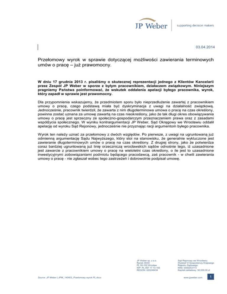 03.04.2014 Przełomowy wyrok w sprawie dotyczącej możliwości zawierania terminowych umów o pracę – już prawomocny. W dniu 17 grudnia 2013 r. pisaliśmy o skutecznej reprezentacji jednego z Klientów Kancelarii przez Zespół JP Weber w sporze z byłym pracownikiem, działaczem związkowym. Niniejszym pragniemy Państwa poinformować, że wskutek oddalenia apelacji byłego pracownika, wyrok, który zapadł w sprawie jest prawomocny. Dla przypomnienia wskazujemy, że przedmiotem sporu było nieprzedłużenie zawartej z pracownikiem umowy o pracę, czego podstawą miała być dyskryminacja z uwagi na działalność związkową. Jednocześnie, pracownik twierdził, że zawarta z nim długoterminowa umowa o pracę na czas określony, powinna zostać uznana za umowę zawartą na czas nieokreślony, jako że tak długi okres obowiązywania umowy o pracę jest sprzeczny ze społeczno-gospodarczym przeznaczeniem prawa oraz z zasadami współżycia społecznego. W wyniku kontrargumentacji JP Weber, Sąd Okręgowy we Wrocławiu oddalił apelację od wyroku Sąd Rejonowy, jednocześnie nie przyznając racji argumentom byłego pracownika. Wyrok ten należy uznać za przełomowy z dwóch względów. Po pierwsze, z uwagi na ugruntowaną już odmienną argumentację Sądu Najwyższego, który stoi na stanowisku, że generalnie wykluczone jest zawieranie długoterminowych umów o pracę na czas określony. Z drugiej strony, jako że potwierdza coraz bardziej ugruntowaną już linię orzeczniczą wrocławskich sądów odnośnie tego, iż uzasadnione jest zawarcie z pracownikiem umowy o pracę na wieloletni czas określony, o ile jest to uzasadnione inwestycyjnymi zobowiązaniami podmiotu będącego pracodawcą, zaś pracownik - w chwili zawierania umowy o pracę - nie zgłaszał wobec tego zastrzeżeń i dobrowolnie podpisał umowę. JP Weber sp. z o.o. Rynek 39/40 PL 50-102 Wrocław NIP: PL 897 17 13 155 REGON: 020248434 Source: JP Weber | JPW_140403_Przelomowy wyrok PL.docx Sąd Rejonowy we Wrocławiu Wydział VI Gospodarczy Krajowego Rejestru Sądowego KRS: 0000253773 Kapitał zakładowy: 50.000,00 zł www.jpweber.com 1 O JP Weber JP Weber od ponad 12 lat wspiera międzynarodowych inwestorów podczas inwestowania w Polsce oraz w bieżącej obsłudze podatkowo-prawnej. Zatrudniamy ponad 60 doradców inwestycyjnych, podatkowych i prawników, którzy obsługują klientów z biur we Wrocławiu i w Warszawie. Ponadto prowadzimy wielojęzyczny outsourcing księgowy, który świadczy usługi mniejszym i średnim firmom na rynku polskim. Każdego dnia przyczyniamy się do pozytywnych zmian w małych i średnich przedsiębiorstwach, które wspólnie z ich właścicielami osiedlaliśmy w Polsce, a także w międzynarodowych koncernach, które od wielu lat darzą nas zaufaniem w zakresie bieżącej obsługi prawnej i podatkowej lub podczas fuzji i przejęć. Na rynku dolnośląskim zaliczamy się do największych firm doradczych pod kątem obrotów i zatrudnienia. Obsługujemy zarówno duże światowe koncerny takie jak LG czy Wedel, jak i globalnych championów niemieckiego sektora MŚP, planujących dalszą ekspansję na terenie Polski. Wspieramy decydentów podczas transakcji oraz w bieżącej obsłudze i stanowimy alternatywę dla dużych grup doradczych, gwarantując indywidualne, ale także kompleksowe podejście do zagadnień na rynku polskim. W celu uzyskania większej ilości informacji o JP Weber i naszych usługach, zapraszamy na stronę www.jpweber.com. Kontakt dla mediów: JP Weber sp. z o.o. Renata Lenert-Sikora, Marketing & Communication Manager Rynek 39/40 50-102 Wrocław Telefon: +48 (71) 36 99 656 Telefon: +48 664 969 626 [email protected] www.jpweber.com Source: JP Weber | JPW_140403_Przelomowy wyrok PL.docx www.jpweber.com 2