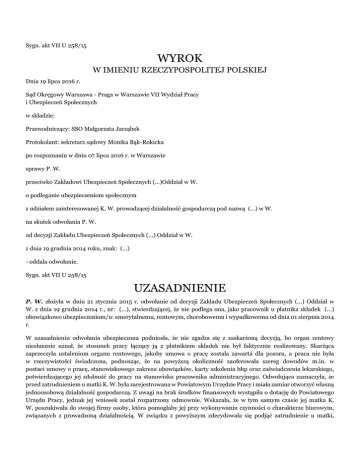 Sygn. akt VII U 258/15 WYROK W IMIENIU RZECZYPOSPOLITEJ POLSKIEJ Dnia 19 lipca 2016 r. Sąd Okręgowy Warszawa - Praga w Warszawie VII Wydział Pracy i Ubezpieczeń Społecznych w składzie: Przewodniczący: SSO Małgorzata Jarząbek Protokolant: sekretarz sądowy Monika Bąk-Rokicka po rozpoznaniu w dniu 07 lipca 2016 r. w Warszawie sprawy P. W. przeciwko Zakładowi Ubezpieczeń Społecznych (...)Oddział w W. o podleganie ubezpieczeniom społecznym z udziałem zainteresowanej K. W. prowadzącej działalność gospodarczą pod nazwą (...) w W. na skutek odwołania P. W. od decyzji Zakładu Ubezpieczeń Społecznych (...) Oddział w W. z dnia 19 grudnia 2014 roku, znak: (...) - oddala odwołanie. Sygn. akt VII U 258/15 UZASADNIENIE P. W. złożyła w dniu 21 stycznia 2015 r. odwołanie od decyzji Zakładu Ubezpieczeń Społecznych (...) Oddział w W. z dnia 19 grudnia 2014 r., nr: (...), stwierdzającej, że nie podlega ona, jako pracownik u płatnika składek (...) obowiązkowo ubezpieczeniom/u: emerytalnemu, rentowym, chorobowemu i wypadkowemu od dnia 01 sierpnia 2014 r. W uzasadnieniu odwołania ubezpieczona podniosła, że nie zgadza się z zaskarżoną decyzją, bo organ rentowy niesłusznie uznał, że stosunek pracy łączący ją z płatnikiem składek nie był faktycznie realizowany. Skarżąca zaprzeczyła ustaleniom organu rentowego, jakoby umowa o pracę została zawarta dla pozoru, a praca nie była w rzeczywistości świadczona, podnosząc, że na powyższą okoliczność zaoferowała szereg dowodów m.in. w postaci umowy o pracę, stanowiskowego zakresu obowiązków, karty szkolenia bhp oraz zaświadczenia lekarskiego, potwierdzającego jej zdolność do pracy na stanowisku pracownika administracyjnego. Odwołująca zaznaczyła, że przed zatrudnieniem u matki K. W. była zarejestrowana w Powiatowym Urzędzie Pracy i miała zamiar otworzyć własną jednoosobową działalność gospodarczą. Z uwagi na brak środków finansowych wystąpiła o dotację do Powiatowego Urzędu Pracy, jednak jej wniosek został rozpatrzony odmownie. Wskazała, że w tym samym czasie jej matka K. W. poszukiwała do swojej firmy osoby, która pomogłaby jej przy wykonywaniu czynności o charakterze biurowym, związanych z prowadzoną działalnością. W związku z powyższym zdecydowała się podjąć zatrudnienie u matki, pomimo tego, że w tym czasie była w 25 tygodniu ciąży. Odwołująca stwierdziła, iż fakt, że płatnikiem składek jest jej matka K. W. nie miał wpływu na podjętą przez nią decyzję, a nadto jej ciąża przebiegała prawidłowo wobec, czego nie było przeciwwskazań do podjęcia przez nią jakiejkolwiek aktywności zawodowej. Wskazała, że jedyną przyczyną zaprzestania świadczenia przez nią pracy był wcześniejszy, niespodziewany i nieplanowany poród. Tym samym – w jej ocenie – niezasadne jest twierdzenie organu rentowego, że zawarta przez strony umowa o pracę była pozorna, gdyż żadna ze stron nie miała zamiaru wykonywać swoich obowiązków wynikających z treści tej umowy. Przeciwnie stwierdziła, że przedmiotowa umowa o pracę została zawarta w celu rzeczywistego świadczenia pracy, jednakże wyłącznie z przyczyn losowych i całkowicie od niej niezależnych nie mogła być realizowana. Nadmieniła, że gdyby nie to zdarzenie, to nadal pracę by kontynuowała. Z tego też względu, decyzja Zakładu Ubezpieczeń Społecznych jest dla niej niezrozumiała i krzywdząca, gdyż przy jej wydawaniu organ rentowy oparł się wyłącznie na domniemaniach i osobistych spekulacjach, kalkulując wydatek, jaki musi ponieść, przyznając pracownikowi prawo do zasiłku macierzyńskiego. Odwołująca zaznaczyła także, że przed podjęciem powyższego zatrudnienia dopełniła wszelkich formalności związanych z zawarciem umowy o pracę. Na tej podstawie ubezpieczona wniosła o zmianę zaskarżonej decyzji i uznanie podlegania obowiązkowemu ubezpieczeniu emerytalnemu, rentowym i wypadkowemu od dnia 01 sierpnia 2014 r. (odwołanie z dnia 21 stycznia 2015 r. k. 2-5 a.s.). W odpowiedzi na odwołanie z dnia 19 lutego 2015 r. Zakład Ubezpieczeń Społecznych (...)Oddział w W. wniósł o jego oddalenie na podstawie art. 47714 § 1 k.p.c. W uzasadnieniu odpowiedzi na odwołanie, Zakład Ubezpieczeń Społecznych podniósł, że P. W. została zgłoszona do ubezpieczeń społecznych od dnia 01 sierpnia 2014 r. z tytułu zatrudnienia u płatnika składek (...) z siedzibą w W. na podstawie umowy o pracę, zawartej w wymiarze pełnego etatu za miesięcznym wynagrodzeniem w wysokości 1.680,00 zł na stanowisku pracownika administracyjnego. Organ rentowy podniósł, że brak jest wiarygodnych dowodów mogących potwierdzić faktyczne świadczenie przez ubezpieczoną pracy na rzecz ww. pracodawcy. W jego ocenie dokumenty przedłożone przez płatnika składek w toku postępowania wyjaśniającego stanowią jedynie środek uwiarygodnienia działania stron, które przez zawartą umowę o pracę dążyły do obejścia przepisów prawa. Przepisy te wymagają jednak spełnienia przesłanek wymienionych w art. 22 Kodeksu pracy, od których zależy możliwość skorzystania z przewidzianych nimi świadczeń na wypadek choroby i macierzyństwa. Zakład Ubezpieczeń Społecznych zaznaczył, że samo zawarcie umowy o pracę nie stwarza tytułu do objęcia ubezpieczeniem społecznym i w związku z tym uzyskania prawa do świadczeń. Jeżeli bowiem czynność prawna zawarcia umowy o pracę została dokonana wyłącznie w celu uzyskania świadczeń pieniężnych z tytułu ochrony ubezpieczeniowej, jaką przepisy o ubezpieczeniach społecznych zapewniają osobie wykonującej pracę na podstawie umowy o pracę, umowę taką należy uznać za nieważną, jako zawartą dla pozoru. Powołując się na utrwalone orzecznictwo Sądu Najwyższego organ rentowy podkreślił, że podleganie ubezpieczeniu społecznemu wynika z prawdziwego zatrudnienia, a nie z samego faktu zawarcia umowy 