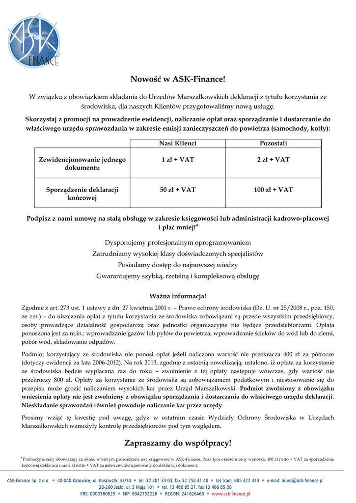 Nowość w ASK-Finance! W związku z obowiązkiem składania do Urzędów Marszałkowskich deklaracji z tytułu korzystania ze środowiska, dla naszych Klientów przygotowaliśmy nową usługę. Skorzystaj z promocji na prowadzenie ewidencji, naliczanie opłat oraz sporządzanie i dostarczanie do właściwego urzędu sprawozdania w zakresie emisji zanieczyszczeń do powietrza (samochody, kotły): Nasi Klienci Pozostali Zewidencjonowanie jednego dokumentu 1 zł + VAT 2 zł + VAT Sporządzenie deklaracji końcowej 50 zł + VAT 100 zł + VAT Podpisz z nami umowę na stałą obsługę w zakresie księgowości lub administracji kadrowo-płacowej i płać mniej! ⃰ Dysponujemy profesjonalnym oprogramowaniem Zatrudniamy wysokiej klasy doświadczonych specjalistów Posiadamy dostęp do najnowszej wiedzy Gwarantujemy szybką, rzetelną i kompleksową obsługę Ważna informacja! Zgodnie z art. 273 ust. 1 ustawy z dn. 27 kwietnia 2001 r. – Prawo ochrony środowiska (Dz. U. nr 25/2008 r., poz. 150, ze zm.) – do uiszczania opłat z tytułu korzystania ze środowiska zobowiązani są przede wszystkim przedsiębiorcy, osoby prowadzące działalność gospodarczą oraz jednostki organizacyjne nie będące przedsiębiorcami. Opłata ponoszona jest za m.in.: wprowadzanie gazów lub pyłów do powietrza, wprowadzanie ścieków do wód lub do ziemi, pobór wód, składowanie odpadów. Podmiot korzystający ze środowiska nie ponosi opłat jeżeli naliczona wartość nie przekracza 400 zł za półrocze (dotyczy ewidencji za lata 2006-2012). Na rok 2013, zgodnie z ostatnią nowelizacją, ustalono, iż opłata za korzystanie ze środowiska będzie wypłacana raz do roku – zwolnienie z tej opłaty następuje wówczas, gdy wartość nie przekroczy 800 zł. Opłaty za korzystanie ze środowiska są zobowiązaniem podatkowym i niestosowanie się do przepisu może grozić naliczaniem wysokich kar przez Urząd Marszałkowski. Podmiot zwolniony z obowiązku wniesienia opłaty nie jest zwolniony z obowiązku sporządzania i dostarczania do właściwego urzędu deklaracji. Nieskładanie sprawozdań również powoduje naliczanie kar przez urzędy. Prosimy wziąć tę kwestię pod uwagę, gdyż w ostatnim czasie Wydziały Ochrony Środowiska w Urzędach Marszałkowskich wzmożyły kontrolę przedsiębiorców pod tym względem. Zapraszamy do współpracy! ⃰ Promocyjne ceny obowiązują za okres, w którym prowadzona jest księgowość w ASK-Finance. Poza tym okresem ceny wynoszą: 100 zł netto + VAT za sporządzenie końcowej deklaracji oraz 2 zł netto + VAT za jeden zewidencjonowany do deklaracji dokument.