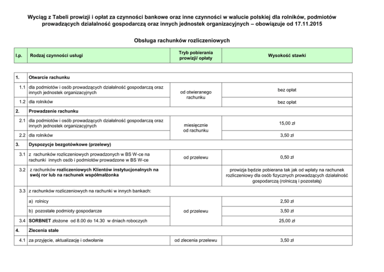 Wyciąg z Tabeli prowizji i opłat za czynności bankowe oraz inne czynności w walucie polskiej dla rolników, podmiotów prowadzących działalność gospodarczą oraz innych jednostek organizacyjnych – obowiązuje od 17.11.2015 Obsługa rachunków rozliczeniowych l.p. Rodzaj czynności usługi 1. Otwarcie rachunku 1.1 dla podmiotów i osób prowadzących działalność gospodarczą oraz innych jednostek organizacyjnych Tryb pobierania prowizji/ opłaty od otwieranego rachunku 1.2 dla rolników 2. bez opłat bez opłat Prowadzenie rachunku 2.1 dla podmiotów i osób prowadzących działalność gospodarczą oraz innych jednostek organizacyjnych 2.2 dla rolników 3. Wysokość stawki miesięcznie od rachunku 15,00 zł od przelewu 0,50 zł 3,50 zł Dyspozycje bezgotówkowe (przelewy) 3.1 z rachunków rozliczeniowych prowadzonych w BS W-ce na rachunki innych osób i podmiotów prowadzone w BS W-ce 3.2 z rachunków rozliczeniowych Klientów instytucjonalnych na swój ror lub na rachunek współmałżonka prowizja będzie pobierana tak jak od wpłaty na rachunek rozliczeniowy dla osób fizycznych prowadzących działalność gospodarczą (rolniczą i pozostałą) 3.3 z rachunków rozliczeniowych na rachunki w innych bankach: 2,50 zł a) rolnicy b) pozostałe podmioty gospodarcze od przelewu 3.4 SORBNET złożone od 8.00 do 14.30 w dniach roboczych 4. 3,50 zł 25,00 zł Zlecenia stałe 4.1 za przyjęcie, aktualizację i odwołanie od zlecenia przelewu 3,50 zł 4.2 realizacja zlecenia stałego w terminie wskazanym przez klienta na rachunek prowadzony w innym banku Uwaga: nie pobiera się dodatkowej opłaty za przelew 2,50 zł 4.3 realizacja zlecenia stałego w terminie wskazanym przez klienta na rachunek prowadzony w BS Wartkowice Uwaga: nie pobiera się dodatkowej opłaty za przelew 0,50 zł 5. Polecenie zapłaty 5.1 za przyjęcie, aktualizację lub odwołanie 5.2 za realizację 5.3 odmowa wykonania polecenia zapłaty z tytułu braku środków na rachunku 6. 3,50 zł 3,50 zł za każdą odmowę 3,50 zł za każdy czek 1,00 zł za każdą dyspozycję 20,00 zł za wyciąg bez opłat Czeki 6.1 wydanie czeku gotówkowego lub rozrachunkowego 6.2 zgłoszenie oraz odwołanie zastrzeżenia o utracie czeków i blankietów 7. od polecenia zapłaty Sporządzenie i wysłanie wyciągu bankowego : 7.1 sporządzenie wyciągu po każdej zmianie salda 7.2 doręczenie wyciągu drogą pocztową 5,00 zł 7.3 powtórne sporządzenie tego samego wyciągu 5,00 zł 7.4 sporządzenie załącznika do wyciągu w formie wydruku z systemu informatycznego od każdego dowodu księgowego 5,00 zł 7.5 odpisu dokumentu pozostającego w archiwum banku w przypadku gdy: a) klient określił datę operacji b) klient nie określił daty operacji 8. 7,00 zł od dokumentu 15,00 zł Wydanie na wniosek klienta 8.1 wydruku historii rachunku za okres poprzedzający bieżący miesiąc za każdy miesiąc 15,00 zł 8.2 zaświadczenia o posiadaniu rachunku i/lub o wysokości salda oraz za zaświadczenie 25,00 zł że rachunek jest lub nie jest wolny od zajęcia 8.3 za wydanie potwierdzenia posiadania rachunku rozliczeniowego za potwierdzenie 10,00 zł za monit 15,00 zł 9. Za sporządzenie i wysłanie wezwania do uregulowania należności z tytułu zaległej prowizji za prowadzenie rachunku 10. Wpłaty gotówkowe na rachunki rozliczeniowe prowadzone w BS Wartkowice 10.1 dla rolników 10.2 dla pozostałych podmiotów gospodarczych 11. 11.2 dla pozostałych podmiotów gospodarczych 13. 0,05 % min. 2,00 zł 0,25% min. 5,00 zł Wypłaty gotówkowe z rachunku rozliczeniowego prowadzonego w BS Wartkowice 11.1 dla rolników 12. od kwoty wpłaty Realizacja tytułu wykonawczego oraz dokumentu mającego moc takiego dokumentu (nie pobiera się dodatkowej opłaty za przelew) od kwoty wypłat za każdą dyspozycję 0,2 % min. 2,00 zł 0,40 % min. 5,00 zł 20,00 zł Zamknięcie rachunku 13.1 Zamknięcie rachunku z powodu wypowiedzenia umowy przez klienta po upływie 12 miesięcy od dnia jego otwarcia 13.2 Zamknięcie rachunku z powodu wypowiedzenia umowy przez klienta przed upływem 12 miesięcy od dnia jego otwarcia 20,00 zł jednorazowo od rachunku 50,00 zł
