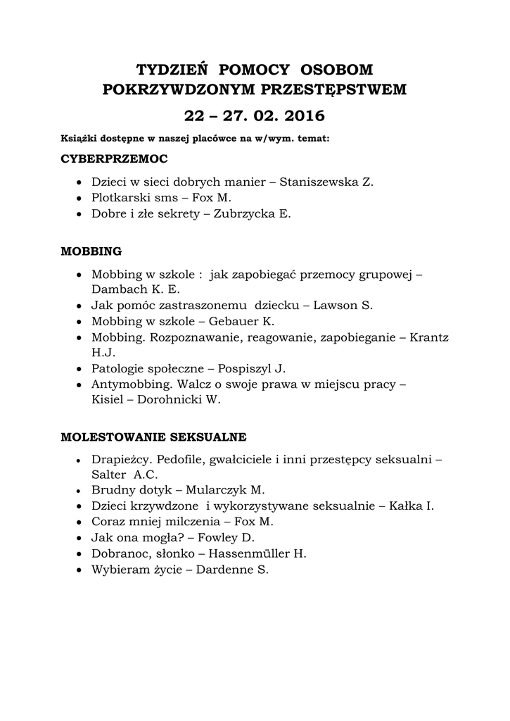 TYDZIEŃ POMOCY OSOBOM POKRZYWDZONYM PRZESTĘPSTWEM 22 – 27. 02. 2016 Książki dostępne w naszej placówce na w/wym. temat: CYBERPRZEMOC Dzieci w sieci dobrych manier – Staniszewska Z. Plotkarski sms – Fox M. Dobre i złe sekrety – Zubrzycka E. MOBBING Mobbing w szkole : jak zapobiegać przemocy grupowej – Dambach K. E. Jak pomóc zastraszonemu dziecku – Lawson S. Mobbing w szkole – Gebauer K. Mobbing. Rozpoznawanie, reagowanie, zapobieganie – Krantz H.J. Patologie społeczne – Pospiszyl J. Antymobbing. Walcz o swoje prawa w miejscu pracy – Kisiel – Dorohnicki W. MOLESTOWANIE SEKSUALNE Drapieżcy. Pedofile, gwałciciele i inni przestępcy seksualni – Salter A.C. Brudny dotyk – Mularczyk M. Dzieci krzywdzone i wykorzystywane seksualnie – Kałka I. Coraz mniej milczenia – Fox M. Jak ona mogła? – Fowley D. Dobranoc, słonko – Hassenmüller H. Wybieram życie – Dardenne S. PRZEMOC DOMOWA Popękane miejsca – Phoenix M. Powstrzymać przemoc domową – Branson B. Za kratami – Maude J. Kato-tata. Nie-pamiętnik c.d. Monidło – Opfer H. Nikt nie chciał słuchać – Kerr J. Płacz niemymi łzami – Peters J. Rodzina Theodore – Theodore W., Horvitz L. A. Dysfunkcjonalność rodziny a resocjalizacja – Sakowicz T. Dzieci krzywdzone i wykorzystywane seksualnie – Kałka I. PRZEMOC W SZKOLE Dręczyciel w klasie – Zubrzycka E. Gnębiciel ze szkolnego boiska – Zarzour K. Jak opanować przemoc w szkole – O’Moore M. A jednak… strzelę! – Zöller E. Dzielna Emilka – Geisler D. PRZEMOC WOBEC KOBIET Oszpecona – Al-Baz R. Fatalne zauroczenie – Schubach K. Zhańbiona – Ahmed S. SEKTY Sekty. Manipulacja psychologiczna – Abgrall J.M. Sekty : ekspansja zła – Ćwierz A. HANDEL LUDŹMI Ela. Dziewczyna, która przeszła piekło – Rücker N. Patologie społeczne – Pospiszyl I.