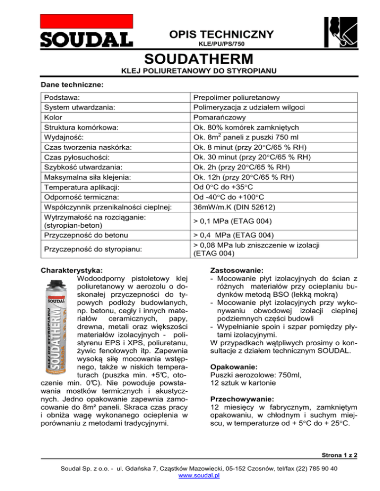OPIS TECHNICZNY KLE/PU/PS/750 SOUDATHERM KLEJ POLIURETANOWY DO STYROPIANU Dane techniczne: Podstawa: System utwardzania: Kolor Struktura komórkowa: Wydajność: Czas tworzenia naskórka: Czas pyłosuchości: Szybkość utwardzania: Maksymalna siła klejenia: Temperatura aplikacji: Odporność termiczna: Współczynnik przenikalności cieplnej: Wytrzymałość na rozciąganie: (styropian-beton) Przyczepność do betonu Przyczepność do styropianu: Charakterystyka: Wodoodporny pistoletowy klej poliuretanowy w aerozolu o doskonałej przyczepności do typowych podłoży budowlanych, np. betonu, cegły i innych materiałów ceramicznych, papy, drewna, metali oraz większości materiałów izolacyjnych - polistyrenu EPS i XPS, poliuretanu, żywic fenolowych itp. Zapewnia wysoką siłę mocowania wstępnego, także w niskich temperaturach (puszka min. +5°C, otoczenie min. 0°C). Nie powoduje powstawania mostków termicznych i akustycznych. Jedno opakowanie zapewnia zamocowanie do 8m² paneli. Skraca czas pracy i obniża wagę wykonanego ocieplenia w porównaniu z metodami tradycyjnymi. Prepolimer poliuretanowy Polimeryzacja z udziałem wilgoci Pomarańczowy Ok. 80% komórek zamkniętych Ok. 8m2 paneli z puszki 750 ml Ok. 8 minut (przy 20°C/65 % RH) Ok. 30 minut (przy 20°C/65 % RH) Ok. 2h (przy 20°C/65 % RH) Ok. 12h (przy 20°C/65 % RH) Od 0°C do +35°C Od -40°C do +100°C 36mW/m.K (DIN 52612) > 0,1 MPa (ETAG 004) > 0,4 MPa (ETAG 004) > 0,08 MPa lub zniszczenie w izolacji (ETAG 004) Zastosowanie: - Mocowanie płyt izolacyjnych do ścian z różnych materiałów przy ocieplaniu budynków metodą BSO (lekką mokrą) - Mocowanie płyt izolacyjnych przy wykonywaniu obwodowej izolacji cieplnej podziemnych części budowli - Wypełnianie spoin i szpar pomiędzy płytami izolacyjnymi. W przypadkach wątpliwych prosimy o konsultacje z działem technicznym SOUDAL. Opakowanie: Puszki aerozolowe: 750ml, 12 sztuk w kartonie Przechowywanie: 12 miesięcy w fabrycznym, zamkniętym opakowaniu, w chłodnym i suchym miejscu, w temperaturze od + 5°C do + 25°C. Strona 1 z 2 Soudal Sp. z o.o. - ul. Gdańska 7, Cząstków Mazowiecki, 05-152 Czosnów, tel/fax (22) 785 90 40 www.soudal.pl OPIS TECHNICZNY KLE/PU/PS/750 Normy i certyfikaty: Produkt wytwarzany przez firmę SOUDAL zgodnie z systemem ISO 9001. Posiada następujące certyfikaty i dopuszczenia do obrotu: - Aprobata ITB AT-15-7808/2008 - Tested according to ETAG - instruction 004, Test Report 07-033, IFBT Leipzig Sposób użycia: - Nie stosować podczas deszczu i silnego wiatru - Wszystkie podłoża muszą być równe, czyste, wolne od tłuszczu i luźnych zanieczyszczeń (kurz, grudki zaprawy, stare szczeliwa, itp.) - Bezpośrednio przed aplikacją kleju zwilżyć podłoże - Zabezpieczyć przed ewentualnym zabrudzeniem elementy stolarki i obróbek blacharskich - Dokładnie wymieszać zawartość puszki przez energiczne potrząsanie (ok. 30 sekund). Puszka powinna mieć temperaturę pokojową (w razie potrzeby zanurzyć puszkę w letniej wodzie) - Nakręcić puszkę na pistolet i wyregulować dyszę aplikacyjną. Wylot pistoletu trzymać w odległości 1-2 cm od powierzchni. - Nałożyć bezpośrednio na powierzchnię płyty styropianowej ścieżkę kleju o średnicy 3 cm po całym obwodzie płyty w odległości ok. 5 cm od krawędzi oraz w części środkowej zygzakiem w kształcie litery W. - Po około 1 min. przyłożyć panel do ściany, lekko docisnąć i ustalić jego osta- teczne położenie w przeciągu max. 8 min. (przy +20°C i 65% RH). Przy wy ższej temperaturze i wilgotności czas korygowania skraca się, przy niższej wydłuża. Odczekanie kilku minut przed przyłożeniem paneli do ściany, umożliwi wstępne rozprężenie się kleju i ułatwi późniejsze korygowanie położenia - Otwory i spoiny między panelami zapełniać tym samym klejem (podczas utwardzania spienia się i wypełnia puste przestrzenie) - Rodzaj i liczbę łączników mechanicznych określa projekt techniczny ocieplenia budynku (jeśli jest konieczny) - Nadmiar kleju usuwać mechanicznie po utwardzeniu, świeże zabrudzenia - Płynem czyszczącym do pianki Soudal. Zalecenia BHP: Przy użyciu pianki przestrzegać zwykłych zasad higieny pracy: - nie wdychać gazu/rozpylonej cieczy, - nosić odpowiednią odzież ochronną, odpowiednie rękawice ochronne i okulary lub ochronę twarzy, - w przypadku awarii lub jeżeli źle się poczujesz, niezwłocznie zasięgnij porady lekarza - jeżeli to możliwe, pokaż etykietę, - stosować wyłącznie w dobrze wentylowanych pomieszczeniach, - w przypadku zatrucia drogą oddechową wyprowadzić lub wynieść poszkodowanego na świeże powietrze i zapewnić warunki do odpoczynku, - chronić przed dziećmi. Uwaga: Wskazówki zawarte w tym dokumencie są wynikami naszych doświadczeń i praktyki. Ze względu na różnorodność materiałów i podłoży oraz wielorakość możliwych zastosowań, które pozostają poza naszą kontrolą, nie możemy przyjmować jakiejkolwiek odpowiedzialności za otrzymane rezultaty. We wszystkich przypadkach zaleca się przeprowadzenie próby. Strona 2 z 2 Soudal Sp. z o.o. - ul. Gdańska 7, Cząstków Mazowiecki, 05-152 Czosnów, tel./fax (22) 785 90 40 www.soudal.pl