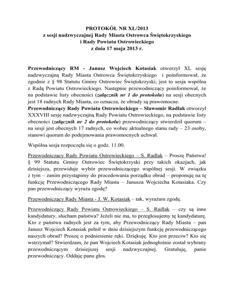 PROTOKÓŁ NR XL/2013 z sesji nadzwyczajnej Rady Miasta Ostrowca Świętokrzyskiego i Rady Powiatu Ostrowieckiego z dnia 17 maja 2013 r. Przewodniczący RM - Janusz Wojciech Kotasiak otworzył XL sesję nadzwyczajną Rady Miasta Ostrowca Świętokrzyskiego i poinformował, że zgodnie z § 98 Statutu Gminy Ostrowiec Świętokrzyski, jest to sesja wspólna z Radą Powiatu Ostrowieckiego. Następnie przewodniczący poinformował, że na podstawie listy obecności (załącznik nr 1 do protokołu) na sesji obecnych jest 18 radnych Rady Miasta, co oznacza, że obrady są prawomocne. Przewodniczący Rady Powiatu Ostrowieckiego – Sławomir Radlak otworzył XXXVIII sesję nadzwyczajną Rady Powiatu Ostrowieckiego, na podstawie listy obecności (załącznik nr 2 do protokołu) przewodniczący stwierdził quorum – na sesji jest obecnych 17 radnych, co wobec aktualnego stanu rady – 23 osoby, stanowi quorum do podejmowania prawomocnych uchwał. Wspólna sesja rozpoczęła się o godz. 11.00. Przewodniczący Rady Powiatu Ostrowieckiego – S. Radlak – Proszę Państwa! § 99 Statutu Gminy Ostrowiec Świętokrzyski przy takich okazjach, jak dzisiejsza, przewiduje wybór przewodniczącego wspólnej sesji. W związku z tym – zanim przystąpimy do procedowania porządku obrad – proponuję na tę funkcję Przewodniczącego Rady Miasta – Janusza Wojciecha Kotasiaka. Czy pan przewodniczący wyraża zgodę? Przewodniczący Rady Miasta - J. W. Kotasiak – tak, wyrażam zgodę. Przewodniczący Rady Powiatu Ostrowieckiego – S. Radlak – czy są inne kandydatury, słucham państwa? Jeżeli nie ma, to przegłosujemy tę kandydaturę. Kto z państwa radnych jest za tym, aby Przewodniczący Rady Miasta – pan Janusz Wojciech Kotasiak pełnił w dniu dzisiejszym funkcję przewodniczącego naszych obrad? Proszę o podniesienie ręki. Dziękuję. Kto jest przeciw? Kto się wstrzymał? Stwierdzam, że pan Wojciech Kotasiak jednogłośnie został wybrany przewodniczącym dzisiejszej sesji nadzwyczajnej. Gratuluję, panie przewodniczący. Oddaję panu głos. Ad. I/Przedstawienie porządku obrad: Przewodniczący Rady Miasta - J. W. Kotasiak – Szanowni Państwo! Przechodzimy zatem do realizacji porządku naszej sesji. Pierwszym punktem jest przyjęcie przez państwa radnych porządku dzisiejszej sesji, na który składają się: 2. 3. 4. 5. 6. Wystąpienie Prezydenta Miasta Ostrowca Świętokrzyskiego. Wystąpienie Przewodniczącego Rady Miasta. Wystąpienie Starosty Ostrowieckiego. Wystąpienie Prezesa Celsa Huta Ostrowiec. Wystąpienie Prezesa Stowarzyszenia Inżynierów i Techników Przemysłu Hutniczego. 7. Wręczenie pamiątkowych medali dla zasłużonych hutników. 8. Wystąpienia gości. 9. Podjęcie przez Radę Miasta Ostrowca Świętokrzyskiego uchwały w sprawie projektu pn. „Centrum Tradycji Hutnictwa – Cywilizacja Żelaza nad Kamienną”. Kto jest za przyjęciem porządku obrad? Kto jest przeciw? Kto się wstrzymał? Stwierdzam, że porządek dzisiejszej sesji został jednogłośnie przyjęty. Zatem przechodzimy do realizacji porządku obrad, punkt II – „Wystąpienie Prezydenta Miasta Ostrowca Świętokrzyskiego”. Ale przedtem chciałbym powitać gości honorowych, zaproszonych na dzisiejszą sesję. Następnie Przewodniczący Rady Miasta – J.W. Kotasiak powitał gości zaproszonych na sesję (lista gości – załącznik nr 3 do protokołu). W sesji udział wzięli: 1. 2. 3. 4. 5. 6. 7. 8. Ikrom Nazarow – Ambasador Republiki Uzbekistanu w Polsce Jarosław Górczyński - Poseł na Sejm RP Jarosław Rusiecki - Poseł na Sejm RP Zbigniew Pacelt - Poseł na Sejm RP Grzegorz Świercz – Wicemarszałek Województwa Świętokrzyskiego Józef Grabowski - Radny Sejmiku Wojewódzkiego Lech Janiszewski - Radny Sejmiku Wojewódzkiego Joanna Francuz - Przedstawicielka Posła do Parlamentu Europejskiego – Jacka Włosowicza 2 9. Jose Vilaseca - Dyrektor Generalny Celsa Huta Ostrowiec 10. prof. dr hab. inż. Janusz Szpytko, Prezes Stowarzyszenia Inżynierów i Techników Przemysłu Hutniczego w Polsce 11. Jerzy Jasiuk - Dyrektor Muzeum Techniki 12. Daniel Czernek – przedstawiciel Świętokrzyskiego Wojewódzkiego Konserwatora Zabytków 13. Stanisław Wodyński – Wiceprezydent Staropolskiej Izby PrzemysłowoHandlowej 14. prof. dr hab. inż. Stanisław Adamczak – Rektor Politechniki Świętokrzyskiej 15. dr hab. inż. Mirosław Karbowniczek, Prorektor ds. Ogólnych, Akademii Górniczo-Hutnicza im. Stanisława Staszica 16. Grzegorz Lipowski - Wiceprezes Zarządu Federacji Stowarzyszeń Naukowo-Technicznych Naczelnej Organizacji Technicznej 17. Urszula Wrońska – Dyrektor Cukrowni „Częstocice” 18. Zdzisław Kałamaga – Starosta Ostrowiecki 19. Eligiusz Mich – Wicestarosta Ostrowiecki 20. doc. dr Tadeusz Grudniewski – Rektor Wyższej Szkoły Biznesu i Przedsiębiorczości w Ostrowcu Świętokrzyskim 21. ks. prałat Jan Sarwa 22. Jarosław Wilczyński – Prezydent Miasta Ostrowca Świętokrzyskiego 23. Paweł Górniak – Wiceprezydent Miasta Ostrowca Świętokrzyskiego Nieobecni radni Rady Miasta Ostrowca Świętokrzyskiego: Elżbieta Helicka, Małgorzata Krysa-Kowal, Wojciech Mazur, Stanisław Sulik. Nieobecni radni Rady Powiatu Ostrowieckiego: Danuta Barańska, Małgorzata Gagat, Jarosław Kuba, Teresa Piwnik, Ryszard Proksa. Ad. II/Wystąpienie Prezydenta Miasta Ostrowca Świętokrzyskiego: Przewodniczący Rady Miasta – J. W. Kotasiak – Przechodzimy zatem do punktu następnego, czyli proszę o wystąpienie Prezydenta Miasta Ostrowca Świętokrzyskiego. Oddaję głos Prezydentowi Miasta Ostrowca Świętokrzyskiego – Panu Jarosławowi Wilczyńskiemu. Prezydent Miasta – J. Wilczyński – Panie Ambasadorze! Panowie Posłowie! Panowie Marszałkowie! Szanowni Państwo Radni! Drodzy goście! Spotykamy się dzisiaj w szczególnym dniu dla naszego miasta, w dniu, w którym 3 wspominamy 200 lat – praktycznie połowa historii naszego miasta jest związana z hutnictwem. 