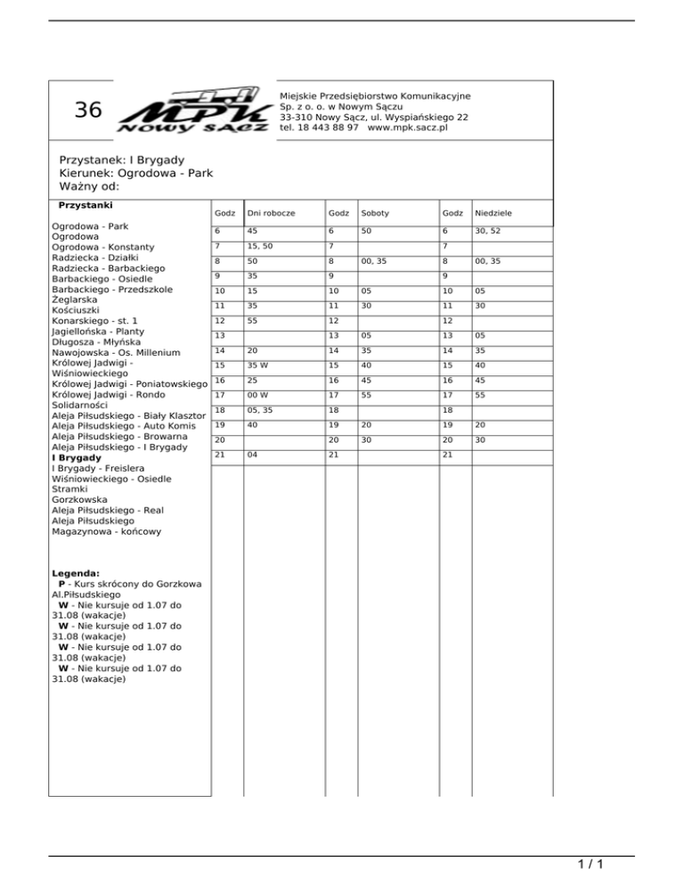 Miejskie Przedsiębiorstwo Komunikacyjne Sp. z o. o. w Nowym Sączu 33-310 Nowy Sącz, ul. Wyspiańskiego 22 tel. 18 443 88 97 www.mpk.sacz.pl 36 Przystanek: I Brygady Kierunek: Ogrodowa - Park Ważny od: Przystanki Ogrodowa - Park Ogrodowa Ogrodowa - Konstanty Radziecka - Działki Radziecka - Barbackiego Barbackiego - Osiedle Barbackiego - Przedszkole Żeglarska Kościuszki Konarskiego - st. 1 Jagiellońska - Planty Długosza - Młyńska Nawojowska - Os. Millenium Królowej Jadwigi Wiśniowieckiego Królowej Jadwigi - Poniatowskiego Królowej Jadwigi - Rondo Solidarności Aleja Piłsudskiego - Biały Klasztor Aleja Piłsudskiego - Auto Komis Aleja Piłsudskiego - Browarna Aleja Piłsudskiego - I Brygady I Brygady I Brygady - Freislera Wiśniowieckiego - Osiedle Stramki Gorzkowska Aleja Piłsudskiego - Real Aleja Piłsudskiego Magazynowa - końcowy Godz Dni robocze Godz Soboty Godz Niedziele 6 45 6 50 6 30, 52 7 15, 50 7 8 50 8 9 35 9 10 15 10 05 10 05 11 35 11 30 11 30 12 55 12 13 7 00, 35 8 00, 35 9 12 13 05 13 05 14 20 14 35 14 35 15 35 W 15 40 15 40 16 25 16 45 16 45 17 00 W 17 55 17 55 18 05, 35 18 19 40 19 20 19 20 20 30 20 30 20 21 04 21 18 21 Legenda: P - Kurs skrócony do Gorzkowa Al.Piłsudskiego W - Nie kursuje od 1.07 do 31.08 (wakacje) W - Nie kursuje od 1.07 do 31.08 (wakacje) W - Nie kursuje od 1.07 do 31.08 (wakacje) W - Nie kursuje od 1.07 do 31.08 (wakacje) 1/1 Powered by TCPDF (www.tcpdf.org)