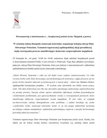 Warszawa, 26 listopada 2014 r. Porozmawiaj z notariuszem o… bezpiecznej jesieni życia. Majątek a prawo W ostatnią sobotę listopada samorząd notarialny organizuje kolejną edycję Dnia Otwartego Notariatu. Tematem tegorocznej ogólnopolskiej akcji poradniczej będą rozwiązania prawne umożliwiające skuteczne rozporządzanie majątkiem 29 listopada br., od godz. 10.00 do 16.00, notariusze będą udzielać bezpłatnych porad w dziewiętnastu miastach Polski w tym również w Puławach. Tego dnia odbędzie się kolejna, piąta już, edycja Dnia Otwartego Notariatu, który jest jednym z najważniejszych i najbardziej spektakularnych działań społecznych samorządu notarialnego. „Dzień Otwarty Notariatu z roku na rok budzi coraz większe zainteresowanie. Co roku wzrasta liczba osób, które korzystają z porad dyżurujących notariuszy, ciągle poszerza się też grono liczba rejentów aktywnie uczestniczących w naszej akcji – mówi not. Barbara Nintza, ogólnopolski koordynator projektu. – W zeszłym roku odwiedziło nas blisko osiem tysięcy osób. Tak duża frekwencja jest dla nas dowodem ogromnego społecznego zapotrzebowania na porady prawne. Naszym celem, oprócz udzielania informacji osobom przychodzącym z konkretnymi problemami, jest upowszechnianie wiedzy o rozwiązaniach prawnych, które umożliwiają efektywne rozporządzanie swoim majątkiem. W tym roku, ze względu na obserwowane zmiany demograficzne oraz problemy, z jakimi borykają się osoby w podeszłym wieku, samorząd notarialny uznał, że są oni grupą najbardziej narażoną na różnego rodzaju manipulacje, najbardziej potrzebującą wsparcia i porady bezstronnego prawnika jakim jest notariusz.” Tematem tegorocznego Dnia Otwartego Notariatu jest bezpieczna jesień życia. Każdy, kto zbliża się do końca swojej kariery zawodowej wcześniej czy później stanie przed koniecznością podjęcia decyzji, w jaki sposób dysponować zgromadzonym majątkiem, tak aby zapewnić sobie oczekiwany poziom życia. Nie są decyzje łatwe, zawsze wymagają starannego przemyślenia i wiedzy o tym, jakie możliwości dysponowania majątkiem stwarza polskie prawodawstwo. Zapotrzebowanie na profesjonalne porady w tym zakresie potwierdzają notariusze, którzy w swojej codziennej praktyce pomagają rozstrzygać takie dylematy. Zdaniem notariuszy najwięcej pytań, które zastana zadane podczas tegorocznego DON-u będzie dotyczyło umów renty, dożywocia oraz różnego rodzaju darowizn. Honorowy patronat nad tegoroczną edycja Dnia Otwartego notariatu objął Prezydent Rzeczpospolitej Polskiej. Patroni medialni to Dziennik Gazeta Prawna oraz radio RMF FM. *** Dzień Otwarty Notariatu, organizowany od roku 2010, jest jedną z najważniejszych inicjatyw samorządu notarialnego. Powtarzana cyklicznie akcja edukacyjna pozwala osobom zainteresowanym uzyskać poradę i praktyczne informacje w ważnych dla każdego obywatela obszarach prawa. Organizatorzy akcji przyjęli założenie, zgodnie z którym, każdego roku porady dotyczą jednego konkretnego tematu. W roku 2010 były to spadki i dziedziczenie, w 2011 – bezpieczeństwo majątku rodziny, w 2012 – nieruchomości i księgi wieczyste, a w 2013 – przekazanie majątku w rodzinie. Nie ogranicza to jednak listy tematów udzielanych porad, ponieważ notariusze odpowiadają na pytania dotyczące wszystkich spraw, które można załatwić w kancelarii notarialnej. Hasło tegorocznego Dnia Otwartego brzmi: „Porozmawiaj z notariuszem o bezpiecznej jesieni życia. Majątek a prawo”. W sobotę, 29 listopada, od godz. 10.00 do 16.00, notariusze będą udzielać bezpłatnych porad w dziewiętnastu miastach Polski. Lokalizacje tegorocznego Dnia Otwartego Notariatu: • • • • • Olsztyn, budynek NOT, pl. Konsulatu Polskiego 1 Białystok, budynek NOT, ul. Marii Skłodowskiej - Curie 2 Gdańsk, Instytut Kultury Miejskiej, ul. Długi Targ 39/40 Toruń, Klub Osiedlowy „Zodiak”, ul. Wyszyńskiego 6 Bydgoszcz, I Liceum Ogólnokształcące, ul. Plac Wolności 9 • Bielsko-Biała, Książnica Beskidzka, ul. Słowackiego 17 A • Częstochowa, Muzeum Częstochowskie/Ratusz, al. Najświętszej Marii Panny 45 • Katowice, obiekt Wydziału Teologicznego Uniwersytetu Śląskiego IV piętro, ul. Jordana 18 • Gliwice, Sąd Rejonowy w Gliwicach, ul. Powstańców Warszawy 23 • Kraków, budynek Radia Kraków, al. J. Słowackiego 22 • Puławy, Urząd Miejski, ul. Lubelska 5 • Lublin, Wojewódzka Biblioteka Publiczna, ul. Narutowicza 4 • Łódź, Centrum Szkoleniowo-Konferencyjne Uniwersytetu Łódzkiego, ul. Kopcińskiego 16/18 • Poznań, IV Liceum Ogólnokształcące, ul. Swojska 6 • Gorzów Wielkopolski, Wojewódzka i Miejska Biblioteka Publiczna, ul. Kosynierów Gdyńskich • Szczecin, budynek „Buchalter”, al. Wojska Polskiego 83 • Przemyśl, hotel Accademia, ul. Wybrzeże Marszałka J. Piłsudskiego 4 • Warszawa, Pałac Prymasowski, ul. Senatorska 13/15 • Wrocław, budynek Starej Giełdy, Plac Solny 16