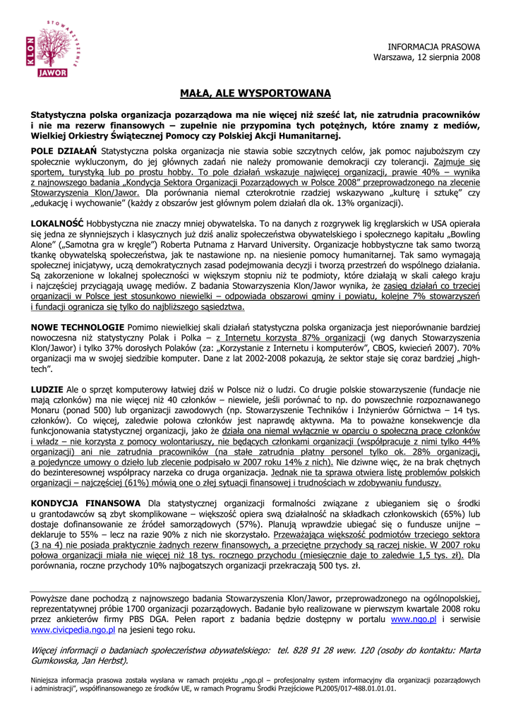 INFORMACJA PRASOWA Warszawa, 12 sierpnia 2008 MAŁA, ALE WYSPORTOWANA Statystyczna polska organizacja pozarządowa ma nie więcej niŜ sześć lat, nie zatrudnia pracowników i nie ma rezerw finansowych – zupełnie nie przypomina tych potęŜnych, które znamy z mediów, Wielkiej Orkiestry Świątecznej Pomocy czy Polskiej Akcji Humanitarnej. POLE DZIAŁAŃ Statystyczna polska organizacja nie stawia sobie szczytnych celów, jak pomoc najuboŜszym czy społecznie wykluczonym, do jej głównych zadań nie naleŜy promowanie demokracji czy tolerancji. Zajmuje się sportem, turystyką lub po prostu hobby. To pole działań wskazuje najwięcej organizacji, prawie 40% – wynika z najnowszego badania „Kondycja Sektora Organizacji Pozarządowych w Polsce 2008” przeprowadzonego na zlecenie Stowarzyszenia Klon/Jawor. Dla porównania niemal czterokrotnie rzadziej wskazywano „kulturę i sztukę” czy „edukację i wychowanie” (kaŜdy z obszarów jest głównym polem działań dla ok. 13% organizacji). LOKALNOŚĆ Hobbystyczna nie znaczy mniej obywatelska. To na danych z rozgrywek lig kręglarskich w USA opierała się jedna ze słynniejszych i klasycznych juŜ dziś analiz społeczeństwa obywatelskiego i społecznego kapitału „Bowling Alone” („Samotna gra w kręgle”) Roberta Putnama z Harvard University. Organizacje hobbystyczne tak samo tworzą tkankę obywatelską społeczeństwa, jak te nastawione np. na niesienie pomocy humanitarnej. Tak samo wymagają społecznej inicjatywy, uczą demokratycznych zasad podejmowania decyzji i tworzą przestrzeń do wspólnego działania. Są zakorzenione w lokalnej społeczności w większym stopniu niŜ te podmioty, które działają w skali całego kraju i najczęściej przyciągają uwagę mediów. Z badania Stowarzyszenia Klon/Jawor wynika, Ŝe zasięg działań co trzeciej organizacji w Polsce jest stosunkowo niewielki – odpowiada obszarowi gminy i powiatu, kolejne 7% stowarzyszeń i fundacji ogranicza się tylko do najbliŜszego sąsiedztwa. NOWE TECHNOLOGIE Pomimo niewielkiej skali działań statystyczna polska organizacja jest nieporównanie bardziej nowoczesna niŜ statystyczny Polak i Polka – z Internetu korzysta 87% organizacji (wg danych Stowarzyszenia Klon/Jawor) i tylko 37% dorosłych Polaków (za: „Korzystanie z Internetu i komputerów”, CBOS, kwiecień 2007). 70% organizacji ma w swojej siedzibie komputer. Dane z lat 2002-2008 pokazują, Ŝe sektor staje się coraz bardziej „hightech”. LUDZIE Ale o sprzęt komputerowy łatwiej dziś w Polsce niŜ o ludzi. Co drugie polskie stowarzyszenie (fundacje nie mają członków) ma nie więcej niŜ 40 członków – niewiele, jeśli porównać to np. do powszechnie rozpoznawanego Monaru (ponad 500) lub organizacji zawodowych (np. Stowarzyszenie Techników i InŜynierów Górnictwa – 14 tys. członków). Co więcej, zaledwie połowa członków jest naprawdę aktywna. Ma to powaŜne konsekwencje dla funkcjonowania statystycznej organizacji, jako Ŝe działa ona niemal wyłącznie w oparciu o społeczną pracę członków i władz – nie korzysta z pomocy wolontariuszy, nie będących członkami organizacji (współpracuje z nimi tylko 44% organizacji) ani nie zatrudnia pracowników (na stałe zatrudnia płatny personel tylko ok. 28% organizacji, a pojedyncze umowy o dzieło lub zlecenie podpisało w 2007 roku 14% z nich). Nie dziwne więc, Ŝe na brak chętnych do bezinteresownej współpracy narzeka co druga organizacja. Jednak nie ta sprawa otwiera listę problemów polskich organizacji – najczęściej (61%) mówią one o złej sytuacji finansowej i trudnościach w zdobywaniu funduszy. KONDYCJA FINANSOWA Dla statystycznej organizacji formalności związane z ubieganiem się o środki u grantodawców są zbyt skomplikowane – większość opiera swą działalność na składkach członkowskich (65%) lub dostaje dofinansowanie ze źródeł samorządowych (57%). Planują wprawdzie ubiegać się o fundusze unijne – deklaruje to 55% – lecz na razie 90% z nich nie skorzystało. PrzewaŜająca większość podmiotów trzeciego sektora (3 na 4) nie posiada praktycznie Ŝadnych rezerw finansowych, a przeciętne przychody są raczej niskie. W 2007 roku połowa organizacji miała nie więcej niŜ 18 tys. rocznego przychodu (miesięcznie daje to zaledwie 1,5 tys. zł). Dla porównania, roczne przychody 10% najbogatszych organizacji przekraczają 500 tys. zł. PowyŜsze dane pochodzą z najnowszego badania Stowarzyszenia Klon/Jawor, przeprowadzonego na ogólnopolskiej, reprezentatywnej próbie 1700 organizacji pozarządowych. Badanie było realizowane w pierwszym kwartale 2008 roku przez ankieterów firmy PBS DGA. Pełen raport z badania będzie dostępny w portalu www.ngo.pl i serwisie www.civicpedia.ngo.pl na jesieni tego roku. Więcej informacji o badaniach społeczeństwa obywatelskiego: tel. 828 91 28 wew. 120 (osoby do kontaktu: Marta Gumkowska, Jan Herbst). Niniejsza informacja prasowa została wysłana w ramach projektu „ngo.pl – profesjonalny system informacyjny dla organizacji pozarządowych i administracji”, współfinansowanego ze środków UE, w ramach Programu Środki Przejściowe PL2005/017-488.01.01.01.