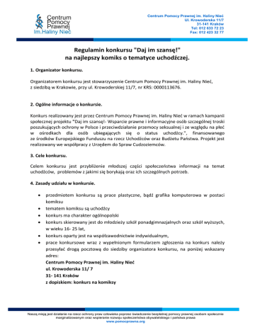 Centrum Pomocy Prawnej im. Haliny Nieć Ul. Krowoderska 11/7 31-141 Kraków Tel: 012 633 72 23 Fax: 012 423 32 77 Regulamin konkursu "Daj im szansę!" na najlepszy komiks o tematyce uchodźczej. 1. Organizator konkursu. Organizatorem konkursu jest stowarzyszenie Centrum Pomocy Prawnej im. Haliny Nieć, z siedzibą w Krakowie, przy ul. Krowoderskiej 11/7, nr KRS: 0000113676. 2. Ogólne informacje o konkursie. Konkurs realizowany jest przez Centrum Pomocy Prawnej im. Haliny Nieć w ramach kampanii społecznej projektu "Daj im szansę!- Wsparcie prawne i informacyjne osób szczególnej troski poszukujących ochrony w Polsce i przeciwdziałanie przemocy seksualnej i ze względu na płeć w ośrodkach dla osób ubiegających się o status uchodźcy.", finansowanego ze środków Europejskiego Funduszu na rzecz Uchodźców oraz Budżetu Państwa. Projekt jest realizowany we współpracy z Urzędem do Spraw Cudzoziemców. 3. Cele konkursu. Celem konkursu jest przybliżenie młodszej części społeczeństwa informacji na temat uchodźców, problemów z jakimi się borykają oraz ich szczególnych potrzeb. 4. Zasady udziału w konkursie. przedmiotem konkursu są prace plastyczne, bądź grafika komputerowa w postaci komiksu tematem komiksu są uchodźcy konkurs ma charakter ogólnopolski konkurs skierowany jest do młodzieży szkół ponadgimnazjalnych oraz szkół wyższych, w wieku 16- 25 lat, konkurs oparty jest na współzawodnictwie indywidualnym, prace konkursowe wraz z wypełnionym formularzem zgłoszenia na konkurs należy przesyłać drogą pocztową do siedziby organizatora konkursu, na poniżej wskazany adres: Centrum Pomocy Prawnej im. Haliny Nieć ul. Krowoderska 11/ 7 31- 141 Kraków z dopiskiem: konkurs na komiksy Naszą misją jest działanie na rzecz ochrony praw człowieka poprzez świadczenie bezpłatnej pomocy prawnej osobom społecznie marginalizowanym oraz wspieranie rozwoju społeczeństwa obywatelskiego i państwa prawa www.pomocprawna.org Centrum Pomocy Prawnej im. Haliny Nieć Ul. Krowoderska 11/7 31-141 Kraków Tel: 012 633 72 23 Fax: 012 423 32 77 w przypadku prac w formie grafiki komputerowej należy je wysyłać wraz z wypełnionym formularzem zgłoszenia na konkurs na adres mailowy [email protected] formularz zgłoszenia na konkurs można pobrać ze strony www.pomocprawna.org, stanowi on także załącznik do niniejszego regulaminu prace konkursowe zostaną ocenione przez komisję w dwóch kategoriach: I) uczniowie szkół ponadgimnazjalnych 2) studenci szkół wyższych 5. Nagrody. Najwyżej ocenione prace zostaną zaprezentowane podczas wystawy pokonkursowej w maju 2014 r. w Krakowie oraz na plakatach, które będą rozesłane do szkół, uczelni i innych instytucji. Autor najlepszego komiksu w każdej z kategorii wiekowych zostanie dodatkowo nagrodzony Tabletem Graficznym Wacom Intuos MANGA A6. 6. Harmonogram konkursu. termin nadsyłania prac upływa 05.05.2014 r. ogłoszenie wyników nastąpi 30.05.2014 r. wystawa pokonkursowa będzie miała miejsce w czerwcu 2014 r. 7. Komisja oceniająca prace konkursowe. Nadesłane komiksy zostaną ocenione przez komisję składającą się z trzech osób: przedstawicieli organizacji działających na rzecz uchodźców i przedstawiciela świata sztuki. 8. Postanowienia końcowe. Szczegółowe informacje o konkursie wraz z pakietem wiedzy o uchodźcach dostępne są w następujących miejscach: strona internetowa www.pomocprawna.org profil organizatora w portalu Facebook www.facebook.com/pomocprawna.org pod adresem mailowym: [email protected] Organizator zastrzega sobie możliwość przedłużenia trwania konkursu i zmian w regulaminie. Naszą misją jest działanie na rzecz ochrony praw człowieka poprzez świadczenie bezpłatnej pomocy prawnej osobom społecznie marginalizowanym oraz wspieranie rozwoju społeczeństwa obywatelskiego i państwa prawa www.pomocprawna.org