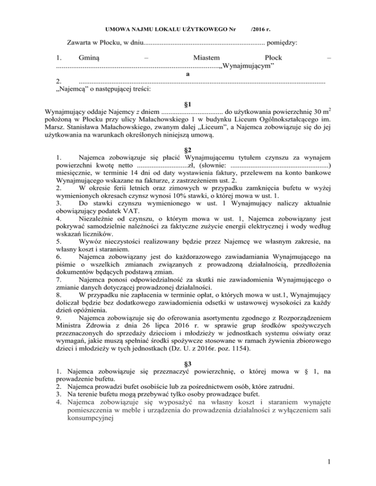 UMOWA NAJMU LOKALU UŻYTKOWEGO Nr /2016 r. Zawarta w Płocku, w dniu................................................................... pomiędzy: 1. Gminą – Miastem Płock – ......................................................................................„Wynajmującym” a 2. ........................................................................................................................................ „Najemcą” o następującej treści: §1 Wynajmujący oddaje Najemcy z dniem .................................. do użytkowania powierzchnię 30 m2 położoną w Płocku przy ulicy Małachowskiego 1 w budynku Liceum Ogólnokształcącego im. Marsz. Stanisława Małachowskiego, zwanym dalej „Liceum”, a Najemca zobowiązuje się do jej użytkowania na warunkach określonych niniejszą umową. §2 1. Najemca zobowiązuje się płacić Wynajmującemu tytułem czynszu za wynajem powierzchni kwotę netto ............................zł, (słownie: ......................................................) miesięcznie, w terminie 14 dni od daty wystawienia faktury, przelewem na konto bankowe Wynajmującego wskazane na fakturze, z zastrzeżeniem ust. 2. 2. W okresie ferii letnich oraz zimowych w przypadku zamknięcia bufetu w wyżej wymienionych okresach czynsz wynosi 10% stawki, o której mowa w ust. 1. 3. Do stawki czynszu wymienionego w ust. l Wynajmujący naliczy aktualnie obowiązujący podatek VAT. 4. Niezależnie od czynszu, o którym mowa w ust. 1, Najemca zobowiązany jest pokrywać samodzielnie należności za faktyczne zużycie energii elektrycznej i wody według wskazań liczników. 5. Wywóz nieczystości realizowany będzie przez Najemcę we własnym zakresie, na własny koszt i staraniem. 6. Najemca zobowiązany jest do każdorazowego zawiadamiania Wynajmującego na piśmie o wszelkich zmianach związanych z prowadzoną działalnością, przedłożenia dokumentów będących podstawą zmian. 7. Najemca ponosi odpowiedzialność za skutki nie zawiadomienia Wynajmującego o zmianie danych dotyczącej prowadzonej działalności. 8. W przypadku nie zapłacenia w terminie opłat, o których mowa w ust.1, Wynajmujący doliczał będzie bez dodatkowego zawiadomienia odsetki w ustawowej wysokości za każdy dzień opóźnienia. 9. Najemca zobowiązuje się do oferowania asortymentu zgodnego z Rozporządzeniem Ministra Zdrowia z dnia 26 lipca 2016 r. w sprawie grup środków spożywczych przeznaczonych do sprzedaży dzieciom i młodzieży w jednostkach systemu oświaty oraz wymagań, jakie muszą spełniać środki spożywcze stosowane w ramach żywienia zbiorowego dzieci i młodzieży w tych jednostkach (Dz. U. z 2016r. poz. 1154). §3 1. Najemca zobowiązuje się przeznaczyć powierzchnię, o której mowa w § 1, na prowadzenie bufetu. 2. Najemca prowadzi bufet osobiście lub za pośrednictwem osób, które zatrudni. 3. Na terenie bufetu mogą przebywać tylko osoby prowadzące bufet. 4. Najemca zobowiązuje się wyposażyć na własny koszt i staraniem wynajęte pomieszczenia w meble i urządzenia do prowadzenia działalności z wyłączeniem sali konsumpcyjnej 1 §4 1. Najemca prowadzi bufet zgodnie z wymogami przepisów sanitarnych. Odpowiada za czystość i estetykę wszystkich pomieszczeń bufetowych ( w tym sprzątanie pomieszczenia konsumpcyjnego ) 2. Najemca jest zobowiązany do utrzymania w trakcie używania przez niego powierzchni warunków zapewniających przestrzeganie przepisów bhp i p-poż. Najemca zobowiązuje się do zapoznania z Instrukcją Bezpieczeństwa Pożarowego dla budynku Liceum oraz do przestrzegania jej zapisów. 3. W przypadku naruszenia powyższego obowiązku Najemca zobowiązany będzie do pokrycia Wynajmującemu szkód będących wynikiem zaniedbania Najemcy. 4. Najemca obowiązany jest uiszczać podatek od nieruchomości za wynajętą powierzchnię wg obowiązujących stawek. §5 1. Najemca prowadzi bufet od poniedziałku do piątku w godzinach od 7:30 do 15:00. 2. Czas otwarcia i zamknięcia, o którym mowa w ust. 1, może być zmodyfikowany po uzgodnieniu z Dyrektorem Liceum. 3. Dopuszcza się korzystanie z bufetu przez inne osoby niż uczniowie i pracownicy Liceum na zasadach komercyjnych poza godzinami otwarcia, o których mowa w ust. 1, po wcześniejszym uzyskaniu zgody Dyrektora Liceum. 4. Bez zgody Wynajmującego, Najemca nie może dokonywać żadnych zmian technicznych dotyczących rozwiązań budowlanych i instalacyjnych w wynajmowanym lokalu. 5. Dyrektor Liceum zastrzega sobie prawo do ingerencji w asortyment oferowany do sprzedaży §6 1. Stoliki i krzesła będące na wyposażeniu sali konsumpcyjnej stanowią własność Liceum i będą one udostępniane na potrzeby prowadzenia bufetu. 2. Sala konsumpcyjna pełni jednocześnie rolę świetlicy szkolnej i nie jest przedmiotem najmu. Umowę zawarto na czas określony od ......... §7 do .......... §8 Umowa może być wypowiedziana przez każdą ze stron z 1 miesięcznym okresem wypowiedzenia na koniec miesiąca kalendarzowego bez podania przyczyn. §9 1. W sprawach nie uregulowanych niniejszą umową mają zastosowanie przepisy Kodeksu Cywilnego i ustawy o wychowaniu w trzeźwości i przeciwdziałaniu alkoholizmowi. 2. Wszelkie zmiany niniejszej umowy wymagają formy pisemnej pod rygorem nieważności. 3. Umowę sporządzono w 2 jednobrzmiących egzemplarzach, jeden dla Najemcy, drugi dla Wynajmującego. 4. W przypadku rozwiązania umowy najmu przed upływem jej zakończenia najemca lub zakończenia terminu jej obowiązywania, najemca zobowiązuje się do przywrócenia stanu pierwotnego najmowanej powierzchni według stanu na dzień przed podpisaniem umowy najmu, zwrócić wszystkie posiadane klucze, oraz uiścić opłaty za wykorzystywane media do dnia rozwiązania lub wygaśnięcia umowy §10 Ewentualne spory powstałe na tle umowy rozstrzygane będą przez Sąd właściwy dla siedziby Wynajmującego Wynajmujący Najemca 2