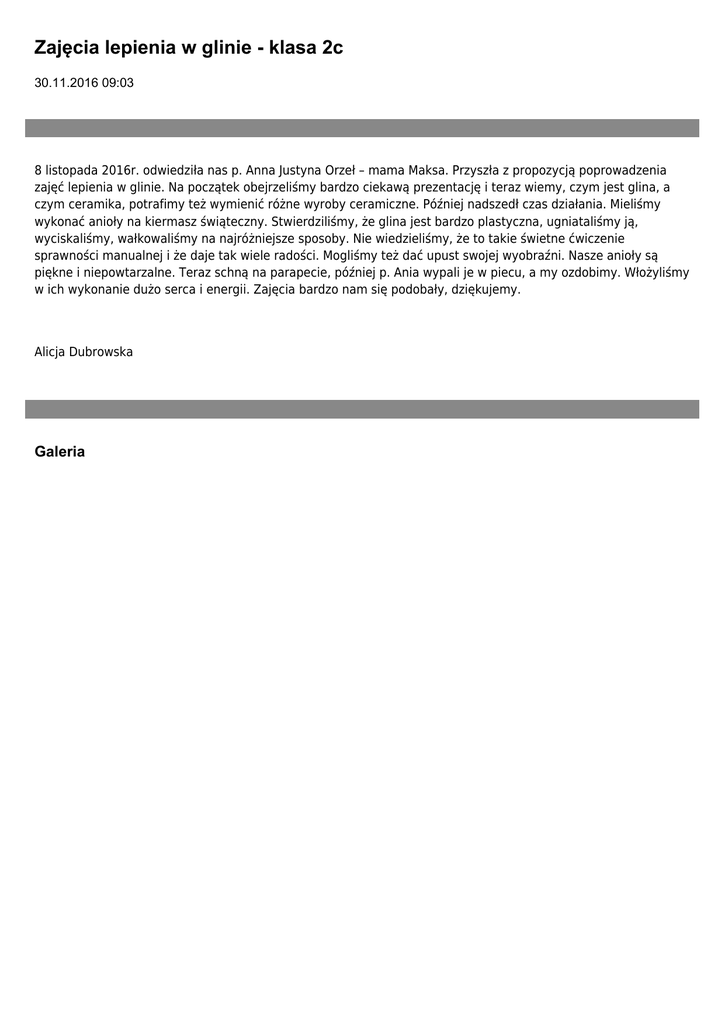 Zajęcia lepienia w glinie - klasa 2c 30.11.2016 09:03 8 listopada 2016r. odwiedziła nas p. Anna Justyna Orzeł – mama Maksa. Przyszła z propozycją poprowadzenia zajęć lepienia w glinie. Na początek obejrzeliśmy bardzo ciekawą prezentację i teraz wiemy, czym jest glina, a czym ceramika, potrafimy też wymienić różne wyroby ceramiczne. Później nadszedł czas działania. Mieliśmy wykonać anioły na kiermasz świąteczny. Stwierdziliśmy, że glina jest bardzo plastyczna, ugniataliśmy ją, wyciskaliśmy, wałkowaliśmy na najróżniejsze sposoby. Nie wiedzieliśmy, że to takie świetne ćwiczenie sprawności manualnej i że daje tak wiele radości. Mogliśmy też dać upust swojej wyobraźni. Nasze anioły są piękne i niepowtarzalne. Teraz schną na parapecie, później p. Ania wypali je w piecu, a my ozdobimy. Włożyliśmy w ich wykonanie dużo serca i energii. Zajęcia bardzo nam się podobały, dziękujemy. Alicja Dubrowska Galeria