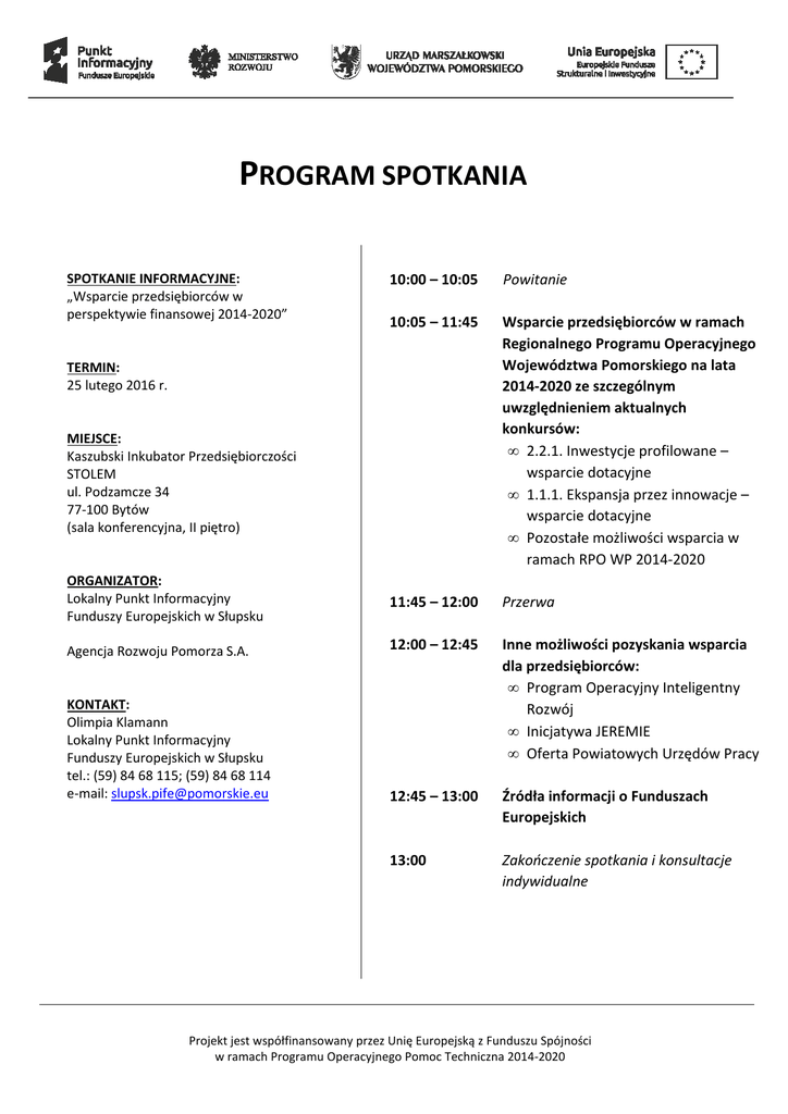 PROGRAM SPOTKANIA SPOTKANIE INFORMACYJNE: „Wsparcie przedsiębiorców w perspektywie finansowej 2014-2020” 10:00 – 10:05 Powitanie 10:05 – 11:45 Wsparcie przedsiębiorców w ramach Regionalnego Programu Operacyjnego Województwa Pomorskiego na lata 2014-2020 ze szczególnym uwzględnieniem aktualnych konkursów: • 2.2.1. Inwestycje profilowane – wsparcie dotacyjne • 1.1.1. Ekspansja przez innowacje – wsparcie dotacyjne • Pozostałe możliwości wsparcia w ramach RPO WP 2014-2020 11:45 – 12:00 Przerwa Agencja Rozwoju Pomorza S.A. 12:00 – 12:45 KONTAKT: Olimpia Klamann Lokalny Punkt Informacyjny Funduszy Europejskich w Słupsku tel.: (59) 84 68 115; (59) 84 68 114 e-mail: [email protected] Inne możliwości pozyskania wsparcia dla przedsiębiorców: • Program Operacyjny Inteligentny Rozwój • Inicjatywa JEREMIE • Oferta Powiatowych Urzędów Pracy 12:45 – 13:00 Źródła informacji o Funduszach Europejskich 13:00 Zakończenie spotkania i konsultacje indywidualne TERMIN: 25 lutego 2016 r. MIEJSCE: Kaszubski Inkubator Przedsiębiorczości STOLEM ul. Podzamcze 34 77-100 Bytów (sala konferencyjna, II piętro) ORGANIZATOR: Lokalny Punkt Informacyjny Funduszy Europejskich w Słupsku Projekt jest współfinansowany przez Unię Europejską z Funduszu Spójności w ramach Programu Operacyjnego Pomoc Techniczna 2014-2020