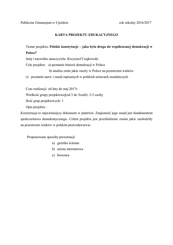 Publiczne Gimnazjum w Ujeździe rok szkolny 2016/2017 KARTA PROJEKTU EDUKACYJNEGO Temat projektu: Polskie konstytucje – jaka była droga do współczesnej demokracji w Polsce? Imię i nazwisko nauczyciela Krzysztof Czajkowski Cele projektu: a) poznanie historii demokracji w Polsce b) analiza zmin jakie zaszły w Polsce na przestrzeni wieków c) poznanie nazw i zasad zapisanych w polskich ustawach zasadniczych Czas realizacji: od luty do maj 2017r. Wielkość grupy projektowej(od 3 do 5osób) :3-5 osoby Ilość grup projektowych: 1 Opis projektu : Konstytucja to najważniejszy dokument w państwie. Znajomość jego zasad jest fundamentem społeczeństwa demokratycznego. Celem projektu jest prześledzenie zmian jakie zachodziły na przestrzeni wieków w polskim prawodawstwie. Proponowane sposoby prezentacji: a) gazetka ścienna b) strona internetowa c) broszura