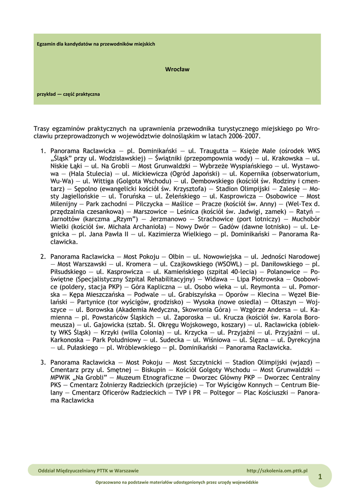 Egzamin dla kandydatów na przewodników miejskich Wrocław przykład — część praktyczna Trasy egzaminów praktycznych na uprawnienia przewodnika turystycznego miejskiego po Wrocławiu przeprowadzonych w województwie dolnośląskim w latach 2006–2007. 1. Panorama Racławicka — pl. Dominikański — ul. Traugutta — Księże Małe (ośrodek WKS „Śląsk” przy ul. Wodzisławskiej) — Świątniki (przepompownia wody) — ul. Krakowska — ul. Niskie Łąki — ul. Na Grobli — Most Grunwaldzki — Wybrzeże Wyspiańskiego — ul. Wystawowa — (Hala Stulecia) — ul. Mickiewicza (Ogród Japoński) — ul. Kopernika (obserwatorium, Wu-Wa) — ul. Wittiga (Golgota Wschodu) — ul. Dembowskiego (kościół św. Rodziny i cmentarz) — Sępolno (ewangelicki kościół św. Krzysztofa) — Stadion Olimpijski — Zalesię — Mosty Jagiellońskie — ul. Toruńska — ul. Żeleńskiego — ul. Kasprowicza — Osobowice — Most Milenijny — Park zachodni — Pilczycka — Maślice — Pracze (kościół św. Anny) — (Wel-Tex d. przędzalnia czesankowa) — Marszowice — Leśnica (kościół św. Jadwigi, zamek) — Ratyń — Jarnołtów (karczma „Rzym”) — Jerzmanowo — Strachowice (port lotniczy) — Muchobór Wielki (kościół św. Michała Archanioła) — Nowy Dwór — Gadów (dawne lotnisko) — ul. Legnicka — pl. Jana Pawła II — ul. Kazimierza Wielkiego — pl. Dominikański — Panorama Racławicka. 2. Panorama Racławicka — Most Pokoju — Ołbin — ul. Nowowiejska — ul. Jedności Narodowej — Most Warszawski — ul. Kromera — ul. Czajkowskiego (WSOWL) — pl. Daniłowskiego — pl. Piłsudskiego — ul. Kasprowicza — ul. Kamieńskiego (szpital 40-lecia) — Polanowice — Poświętne (Specjalistyczny Szpital Rehabilitacyjny) — Widawa — Lipa Piotrowska — Osobowice (poldery, stacja PKP) — Góra Kapliczna — ul. Osobo wieka — ul. Reymonta — ul. Pomorska — Kępa Mieszczańska — Podwale — ul. Grabiszyńska — Oporów — Klecina — Węzeł Bielański — Partynice (tor wyścigów, grodzisko) — Wysoka (nowe osiedla) — Ołtaszyn — Wojszyce — ul. Borowska (Akademia Medyczna, Skowronia Góra) — Wzgórze Andersa — ul. Kamienna — pl. Powstańców Śląskich — ul. Zaporoska — ul. Krucza (kościół św. Karola Boromeusza) — ul. Gajowicka (sztab. Śl. Okręgu Wojskowego, koszary) — ul. Racławicka (obiekty WKS Śląsk) — Krzyki (willa Colonia) — ul. Krzycka — ul. Przyjaźni — ul. Przyjaźni — ul. Karkonoska — Park Południowy — ul. Sudecka — ul. Wiśniowa — ul. Ślęzna — ul. Dyrekcyjna — ul. Pułaskiego — pl. Wróblewskiego — pl. Dominikański — Panorama Racławicka. 3. Panorama Racławicka — Most Pokoju — Most Szczytnicki — Stadion Olimpijski (wjazd) — Cmentarz przy ul. Smętnej — Biskupin — Kościół Golgoty Wschodu — Most Grunwaldzki — MPWiK „Na Grobli” — Muzeum Etnograficzne — Dworzec Główny PKP — Dworzec Centralny PKS — Cmentarz Żołnierzy Radzieckich (przejście) — Tor Wyścigów Konnych — Centrum Bielany — Cmentarz Oficerów Radzieckich — TVP i PR — Poltegor — Plac Kościuszki — Panorama Racławicka Oddział Międzyuczelniany PTTK w Warszawie http://szkolenia.om.pttk.pl Opracowano na podstawie materiałów udostępnionych przez urzędy wojewódzkie 1 przykład Egzamin dla kandydatów na przewodników miejskich — Wrocław 4. Panorama Racławicka — pl. Dominikański — Kołłątaja — Ślęzna — Armii Krajowej Hubska — Pułaskiego — Traugutta — pl. Zgody — Krakowska — Księże Małe — ośrodek wks śląsk przy ul. Wodzisławskiej — Krakowska — Niskie Łąki — Most Oławski pl. Wróblewskiego — Most Grunwaldzki — Wybrzeże Wyspiańskiego — Most Zwierzyniecki — ul. Wróblewskiego — ul. Wyścigowa — Mickiewicza — Kopernika — Wittiga — Golgota Wschodu — Zielonego Dębu — Dembowskiego — Partyzantów Sępolno — Cm. Świętej Rodziny — Stadion Olimpijski (Mickiewicza) — Stadion Olimpijski (Paderewskiego) — Moniuszki — Chopina — Kąpielisko Morskie Oko — Kochanowskiego — Brucknera — Krzywoustego — Psie Pole Rynek — Kiełczowska Cmentarz Komunalny — Kiełczowska Zespół Szkół I Schronisko Młodzieżowe — Bierułtowska — Jana III Sobieskiego — Irkucka — Okulickiego — Widawska — Pałac Kornów — Pawłowicka — Stadion K.S. Lotnik — ul. Przedwiośnie — Irkucka — Jana III Sobieskiego — Korona — Krzywoustego — Sołtysowice — Przesmyckiego — Uniwersytet Wrocławski — pl. Daniłowskiego — Pl. Piłsudskiego — Kasprowicza — Żmigrodzka — Kamieńskiego — Szpital 40-Lecia — Kamieńskiego — Bałtycka — Osobowicka — Most 1000-lecia — Wejherowska — ORBITa — Popowicka — Pilczycka — Motel — Lotnicza — Gadów — estakada — Strzegomska — Mińska — Muchobór Włk — Stanisławowska — Krzemieniecka — Ostrowskiego — Grabiszyn/Oporów Cm. Żołnierzy Polskich — Grabiszyńska — Hallera — Wiśniowa — Borowska — Cm. Żołnierzy Radzieckich Na Skowroniej Górze — Borowska Akademia Medyczna — Parafialna — Zwycięska — Partynice — Karkonoska — Park Pd. — Powstańców Sl. — Piłsudskiego — pl. Legionów — pl. Orląt — Podwale — pl. Jana Pawła II — Kępa Mieszczańska — Dubois — Drobnera — pl. Bema — Poniatowskiego — Jedności Narodowej — Nowowiejska — Ołbin — Kardynała Wyszyńskiego — Most Pokoju — Panorama Racławicka. 5. Panorama Racławicka — Most Pokoju — Ołbin — Most Warszawski — Centrum „Korona” — PTSM na Psim Polu — Sołtysowice (obóz pracy) — Karłowice IPN — Most Osobowicki — Pomnik Sybiraków — Mosty Pomorskie — Gmach Nowej Giełdy — Oporów — Centrum „Auchan” — Partynice — Cmentarz Oficerów Radzieckich — Novotel — Park Południowy — Cmentarz Żydowski przy ul. Ślężnej — Dworzec PKS i PKP — Wzgórze
