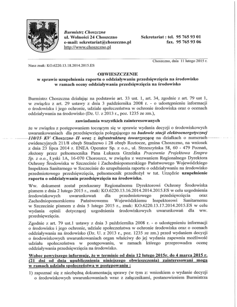 Burmistrz Choszczna ul. Wolności 24 Choszczno e-mail: [email protected] http://www.choszczno.pl Sekretariat: tel. 95 765 93 01 fax. 95 765 93 06 Choszczno, dnia 11 lutego 2015 r. Nasz znak: KO.6220.13.18.2014.2015.ES OBWIESZCZENIE w sprawie uzupełnienia raportu o oddziaływaniu przedsięwzięcia na środowisko w ramach oceny oddziaływania przedsięwzięcia na środowisko Burmistrz Choszczna działając na podstawie art. 33 ust. 1, art. 34, zgodnie z art. 79 ust 1, w związku z art. 29 ustawy z dnia 3 października 2008 r. - o udostępnieniu informacji o środowisku i jego ochronie, udziale społeczeństwa w ochronie środowiska oraz o ocenach oddziaływania na środowisko (Dz. U . z 2013 r., poz. 1235 ze zm.), zawiadamia wszystkich zainteresowanych że w związku z postępowaniem toczącym się w sprawie wydania decyzji o środowiskowych uwarunkowaniach dla przedsięwzięcia polegającego na budowie stacji elektroenergetycznej 110/15 KV Choszczno II wraz z infrastrukturą towarzyszącą na-działkach o numerach ewidencyjnych 211/8 obręb Stradzewo i 28 obręb Roztocze, gmina Choszczno, na wniosek z dnia 23 lipca 2014 r. E N E A Operator Sp. z o.o., ul. Strzeszyńska 58, 60 - 479 Poznań, złożony przez pełnomocnika Pana Łukasza Grzelaka Pracownia Projektowa Enspro Sp. z o.o., Łyski 1A, 16-070 Choroszcz, w związku z wezwaniem Regionalnego Dyrektora Ochrony Środowiska w Szczecinie i Zachodniopomorskiego Państwowego Wojewódzkiego Inspektora Sanitarnego w Szczecinie do uzupełnienia raportu o oddziaływaniu na środowisko przedmiotowego przedsięwzięcia, pełnomocnik przedłożył w tut. Urzędzie uzupełnienie raportu o oddziaływaniu przedsięwzięcia na środowisko. Ww. dokument został przekazany Regionalnemu Dyrektorowi Ochrony Środowiska pismem z dnia 2 lutego 2015 r., znak: KO.6220.13.16.2014.2014.2015.ES w celu uzgodnienia środowiskowych uwarunkowań dla przedmiotowego przedsięwzięcia oraz Zachodniopomorskiemu Państwowemu Wojewódzkiemu Inspektorowi Sanitarnemu w Szczecinie pismem z dnia 5 lutego 2015 r., znak: KO.6220.13.17.2014.2015.ES w celu wydania opinii dotyczącej uzgodnienia środowiskowych uwarunkowań dla ww. przedsięwzięcia. Zgodnie z art. 79 ust.l ustawy z dnia 3 października 2008 r. - o udostępnieniu informacji o środowisku i jego ochronie, udziale społeczeństwa w ochronie środowiska oraz o ocenach oddziaływania na środowisko (Dz. U . z 2013 r., poz. 1235 ze zm.) przed wydaniem decyzji o środowiskowych uwarunkowaniach organ właściwy do jej wydania zapewnia możliwość udziału społeczeństwa w postępowaniu, w ramach którego przeprowadza ocenę oddziaływania przedsięwzięcia na środowisko. Wobec powyższego informuję, że w terminie od dnia 12 lutego 2015r. do 4 marca 2015 r. (21 dni od dnia upublicznienia niniejszego obwieszczenia) zainteresowani mogą w ramach udziału społeczeństwa w postępowaniu : 1) zapoznać się z niezbędną dokumentacją sprawy (w tym z: wnioskiem o wydanie decyzji o środowiskowych uwarunkowaniach wraz z załącznikami, postanowieniem Burmistrza Choszczna, raportem o oddziaływaniu planowanego przedsięwzięcia na środowisko) w siedzibie Urzędu Miejskiego w Choszcznie, przy ul. Wolności 24, w Wydziale ds. Komunalnych i Ochrony Środowiska (pok.06), w godzinach przyjmowania interesantów tj.: - poniedziałek- piątek w godz.: 7 3 0 - 1530, - czwartek w godz.: 7 3 0 - 18 00 w temiinie określonym w niniejszym obwieszczeniu. 2) składać uwagi i wnioski w przedmiotowej sprawie: w formie pisemnej na adres: Urząd Miejski w Choszcznie, ul. Wolności 24, 73-200 Choszczno, ustnie do protokołu w godzinach przyjmowania interesantów, za pomocą środków komunikacji elektronicznej bez konieczności opatrywania ich bezpiecznym podpisem elektronicznym, na adres: [email protected]. Zarówno pisma jak i wiadomości e-mail należy podpisać pełnym imieniem i Nazwiskiem oraz podać dokładny adres zamieszkania. Uwagi lub wnioski złożone po upływie terminu pozostawione zostaną bez rozpatrzenia. 3) Organem właściwym do dokonania uzgodnienia jest Regionalny Dyrektor Ochrony Środowiska w Szczecinie oraz do wydania opinii w przedmiotowej sprawie jest Zachodniopomorski Państwowy Wojewódzki Inspektor Sanitarny w Szczecinie. Organem właściwym do rozpatrzenia uwag i wniosków, jak i do wydania decyzji o środowiskowych uwarunkowaniach dla ww. przedsięwzięcia jest Burmistrz Choszczna. Niniejsze obwieszczenie zostaje podane do publicznej wiadomości przez zamieszczenie na stronie Biuletynu Informacji Publicznej Urzędu Miejskiego w Choszcznie: www.bip.choszczno.pl oraz zamieszczone na tablicy informacyjnej tut. Urzędu oraz tablicy ogłoszeń w sołectwach właściwych ze względu na przedmiot postępowania: Sołectwo Stradzewo, Sołectwo Witoszyn.