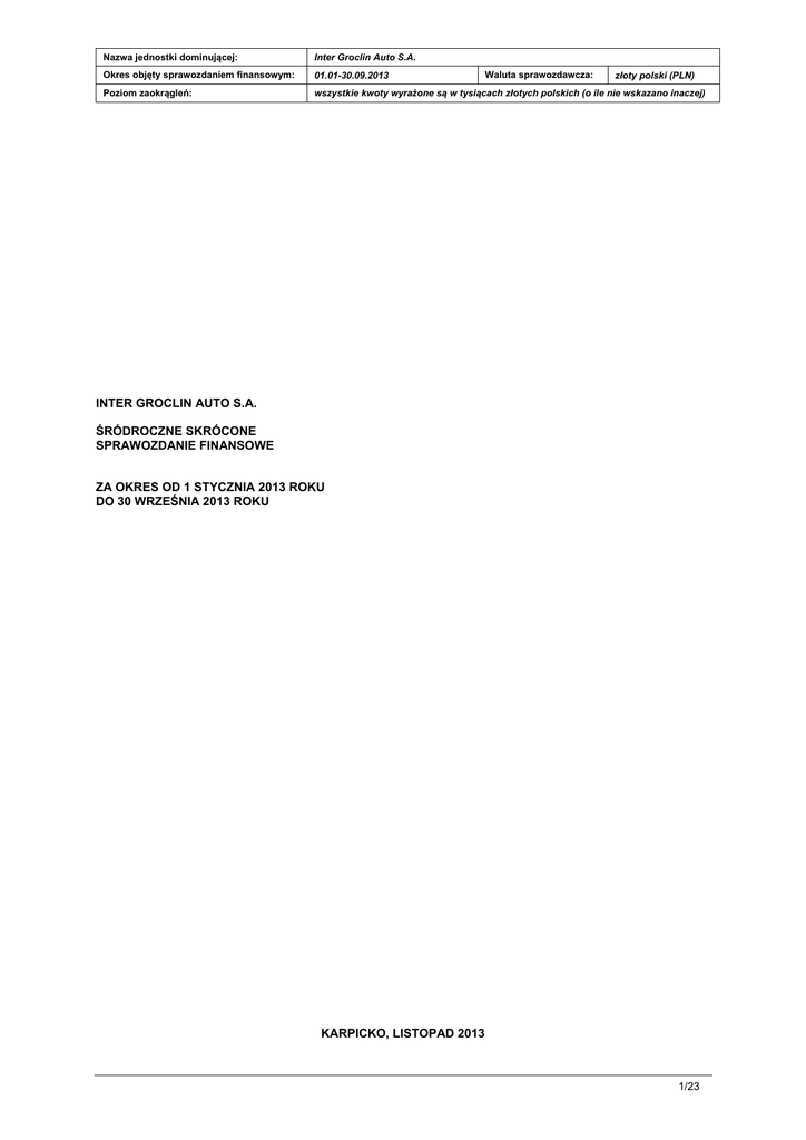 Nazwa jednostki dominującej: Inter Groclin Auto S.A. Okres objęty sprawozdaniem finansowym: 01.01-30.09.2013 Poziom zaokrągleń: wszystkie kwoty wyrażone są w tysiącach złotych polskich (o ile nie wskazano inaczej) Waluta sprawozdawcza: złoty polski (PLN) INTER GROCLIN AUTO S.A. ŚRÓDROCZNE SKRÓCONE SPRAWOZDANIE FINANSOWE ZA OKRES OD 1 STYCZNIA 2013 ROKU DO 30 WRZEŚNIA 2013 ROKU KARPICKO, LISTOPAD 2013 1/23 Nazwa jednostki dominującej: Inter Groclin Auto S.A. Okres objęty sprawozdaniem finansowym: 01.01-30.09.2013 Poziom zaokrągleń: wszystkie kwoty wyrażone są w tysiącach złotych polskich (o ile nie wskazano inaczej) Waluta sprawozdawcza: złoty polski (PLN) SPIS TREŚCI: I. SRÓDROCZNE SPRAWOZDANIE FINANSOWE JEDNOSTKI DOMINUJĄCEJ .................................................................... 3 1. SPRAWOZDANIA FINANSOWE JEDNOSTKI DOMINUJĄCEJ INTER GROCLIN AUTO S.A. ............................................... 3 1.1. SPRAWOZDANIE Z CAŁKOWITYCH DOCHODÓW INTER GROCLIN AUTO ZA OKRES OD 01.01.2013 R. DO 30.06.2013 R. ............................................................................................................................................................................. 3 1.2. SPRAWOZDANIE Z SYTUACJI FINANSOWEJ INTER GROCLIN AUTO SPORZĄDZONE NA DZIEŃ 30.06.2013 R. 4 1.3. SPRAWOZDANIE Z PRZEPŁYWÓW PIENIĘŻNYCH INTER GROCLIN AUTO ZA OKRES OD 01.01.2013 R. DO 30.06.2013 R. ............................................................................................................................................................................. 5 1.4. ZESTAWIENIE ZMIAN W KAPITALE WŁASNYM INTER GROCLIN AUTO ZA OKRES OD 01.01.2013 R. DO 30.06.2013 R. ............................................................................................................................................................................. 6 1.5. WYKAZANIE RÓŻNIC POMIĘDZY SPRAWOZDANIAMI OPUBLIKOWANYM WE WCZEŚNIEJSZYCH RAPORTACH A PREZENTOWANYMI W NINIEJSZYM RAPORCIE. ................................................................................................................ 7 DODATKOWE INFORMACJE I OBJAŚNIENIA DO ŚRÓDROCZNEGO SPRAWOZDANIA FINANSOWEGO JEDNOSTKI DOMINUJĄCEJ INTER GROCLIN AUTO S.A. ............................................................................................................................ 7 2. PODSTAWA SPORZĄDZENIA ŚRÓDROCZNEGO SKRÓCONEGO SPRAWOZDANIA FINANSOWEGO ............................ 7 ŚRÓDROCZNE SKRÓCONE SPRAWOZDANIE FINANSOWE NIE OBEJMUJE WSZYSTKICH INFORMACJI ORAZ UJAWNIEŃ WYMAGANYCH W ROCZNYM SPRAWOZDANIU FINANSOWYM I NALEŻY JE CZYTAĆ ŁĄCZNIE ZE SPRAWOZDANIEM FINANSOWYM SPÓŁKI ZA ROK ZAKOŃCZONY 31 GRUDNIA 2012 ROKU. ........................................... 7 3. SEGMENTY OPERACYJNE ................................................................................................................................................... 7 4. NABYCIE UDZIAŁÓW W JEDNOSTKACH ZALEŻNYCH ....................................................................................................... 7 5. PRZYCHODY ZE SPRZEDAŻY .............................................................................................................................................. 8 6. PRZYCHODY I KOSZTY OPERACYJNE ................................................................................................................................ 8 7. PRZYCHODY I KOSZTY FINANSOWE .................................................................................................................................. 9 8. KOSZTY WEDŁUG RODZAJU................................................................................................................................................ 9 9. ŚRODKI PIENIĘŻNE I ICH EKWIWALENTY ......................................................................................................................... 10 10. PODATEK DOCHODOWY ORAZ ODROCZONY PODATEK DOCHODOWY ............................................................ 10 11. INFORMACJE NA TEMAT PODMIOTÓW POWIĄZANYCH ....................................................................................... 11 12. WARTOŚCI NIEMATERIALNE ................................................................................................................................... 12 13. RZECZOWE AKTYWA TRWAŁE ............................................................................................................................... 13 14. NIERUCHOMOŚCI INWESTYCYJNE ........................................................................................................................ 15 15. POZOSTAŁE DŁUGOTERMINOWE AKTYWA FINANSOWE..................................................................................... 15 16. ZARZĄDZANIE RYZYKIEM W INTER GROCLIN AUTO S.A...................................................................................... 16 17. ZAPASY ..................................................................................................................................................................... 18 18. NALEŻNOŚCI I ZOBOWIĄZANIA ............................................................................................................................... 18 19. KREDYTY .................................................................................................................................................................. 19 20. KAPITAŁ PODSTAWOWY ......................................................................................................................................... 20 21. REZERWY ................................................................................................................................................................. 22 22. POZYCJE WARUNKOWE ....................................................................................................................................