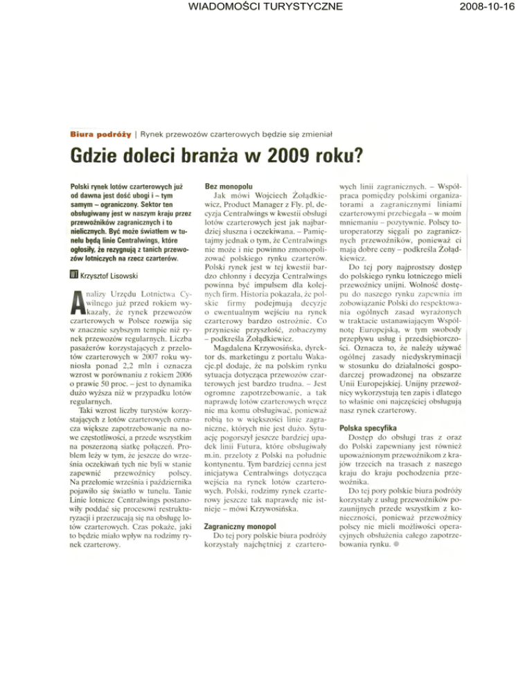 WIADOMO¦CI TURYSTYCZNE 2008-10-16 Biura podróży | Rynek przewozów czarterowych będzie się zmieniał Gdzie doleci branża w 2009 roku? Polski rynek lotów czarterowych już od dawna jest dość ubogi i - tym samym - ograniczony. Sektor ten obsługiwany jest w naszym kraju przez przewoźników zagranicznych i to nielicznych. Być może światłem w tu nelu będą linie Centralwings, które ogłosiły, że rezygnują z tanich przewo zów lotniczych na rzecz czarterów. H i Krzysztof Lisowski nalizy Urzędu Lotnictwa Cy wilnego już przed rokiem wy kazały, że rynek przewozów czarterowych w Polsce rozwija się w znacznie szybszym tempie niż ry nek przewozów regularnych. Liczba pasażerów korzystających z przelo tów czarterowych w 2007 roku wy niosła ponad 2,2 mln i oznacza wzrost w porównaniu z rokiem 2006 o prawie 50 proc. -jest to dynamika dużo wyższa niż w przypadku lotów regularnych. A Taki wzrost liczby turystów korzy stających z lotów czarterowych ozna cza większe zapotrzebowanie na no we częstotliwości, a przede wszystkim na poszerzoną siatkę połączeń. Pro blem leży w tym, że jeszcze do wrze śnia oczekiwań tych nie byli w stanie zapewnić przewoźnicy polscy. Na przełomie września i października pojawiło się światło w tunelu. Tanie Linie lotnicze Centralwings postano wiły poddać się procesowi restruktu ryzacji i przerzucają się na obsługę lo tów czarterowych. Czas pokaże, jaki to będzie miało wpływ na rodzimy ry nek czarterowy. Bez monopolu Jak mówi Wojciech Żołądkiewicz, Product Manager z Fly. pl, de cyzja Centralwings w kwestii obsługi lotów czarterowych jest jak najbar dziej słuszna i oczekiwana. - Pamię tajmy jednak o tym, że Centralwings nie może i nie powinno zmonopoli zować polskiego rynku czarterów. Polski rynek jest w tej kwestii bar dzo chłonny i decyzja Centralwings powinna być impulsem dla kolej nych firm. Historia pokazała, że pol skie firmy podejmują decyzje o ewentualnym wejściu na rynek czarterowy bardzo ostrożnie. Co przyniesie przyszłość, zobaczymy - podkreśla Żołądkiewicz. Magdalena Krzywosińska, dyrek tor ds. marketingu z portalu Waka cje.pl dodaje, że na polskim rynku sytuacja dotycząca przewozów czar terowych jest bardzo trudna. - Jest ogromne zapotrzebowanie, a tak naprawdę lotów czarterowych wręcz nie ma komu obsługiwać, ponieważ robią to w większości linie zagra niczne, których nie jest dużo. Sytu ację pogorszył jeszcze bardziej upa dek linii Futura, które obsługiwały m.in. przeloty z Polski na południc kontynentu. Tym bardziej cenna jest inicjatywa Centralwings dotycząca wejścia na rynek lotów czartero wych. Polski, rodzimy rynek czarte rowy jeszcze tak naprawdę nie ist nieje - mówi Krzywosińska. Zagraniczny monopol Do tej pory polskie biura podróży korzystały najchętniej z czartero wych linii zagranicznych. - Współ praca pomiędzy polskimi organiza torami a zagranicznymi liniami czarterowymi przebiegała - w moim mniemaniu - pozytywnie. Polscy touroperatorzy sięgali po zagranicz nych przewoźników, ponieważ ci mają dobre ceny - podkreśla Żołąd kiewicz. Do tej pory najprostszy dostęp do polskiego rynku lotniczego mieli przewoźnicy unijni. Wolność dostę pu do naszego rynku zapewnia im zobowiązanie Polski do respektowa nia ogólnych zasad wyrażonych w traktacie ustanawiającym Wspól notę Europejską, w tym swobody przepływu usług i przedsiębiorczo ści. Oznacza to, że należy używać ogólnej zasady niedyskryminacji w stosunku do działalności gospo darczej prowadzonej na obszarze Unii Europejskiej. Unijny przewoź nicy wykorzystują ten zapis i dlatego to właśnie oni najczęściej obsługują nasz rynek czarterowy. Polska specyfika Dostęp do obsługi tras z oraz do Polski zapewniany jest również upoważnionym przewoźnikom z kra jów trzecich na trasach z naszego kraju do kraju pochodzenia prze woźnika. Do tej pory polskie biura podróży korzystały z usług przewoźników pozaunijnych przede wszystkim z ko nieczności, ponieważ przewoźnicy polscy nie mieli możliwości opera cyjnych obsłużenia całego zapotrze bowania rynku. «
