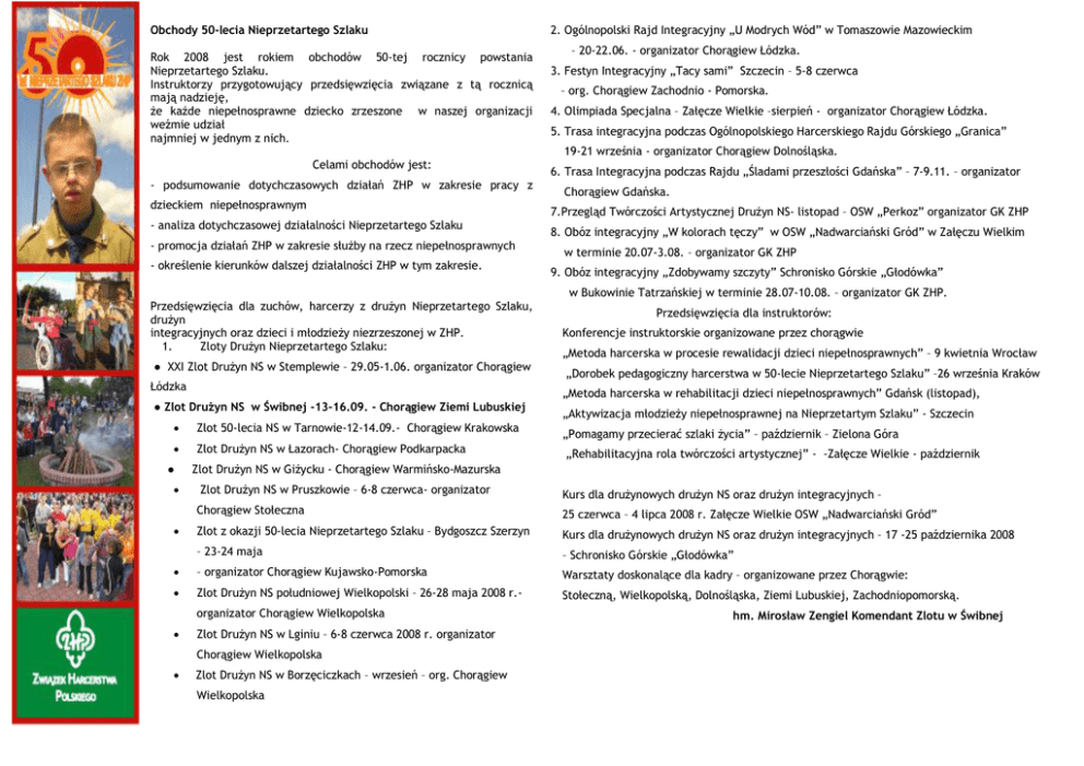 Obchody 50-lecia Nieprzetartego Szlaku Rok 2008 jest rokiem obchodów 50-tej rocznicy powstania Nieprzetartego Szlaku. Instruktorzy przygotowujący przedsięwzięcia związane z tą rocznicą mają nadzieję, że każde niepełnosprawne dziecko zrzeszone w naszej organizacji weźmie udział najmniej w jednym z nich. 2. Ogólnopolski Rajd Integracyjny „U Modrych Wód” w Tomaszowie Mazowieckim – 20-22.06. - organizator Chorągiew Łódzka. 3. Festyn Integracyjny „Tacy sami” Szczecin – 5-8 czerwca – org. Chorągiew Zachodnio - Pomorska. 4. Olimpiada Specjalna – Załęcze Wielkie –sierpień - organizator Chorągiew Łódzka. 5. Trasa integracyjna podczas Ogólnopolskiego Harcerskiego Rajdu Górskiego „Granica” 19-21 września - organizator Chorągiew Dolnośląska. Celami obchodów jest: - podsumowanie dotychczasowych działań ZHP w zakresie pracy z dzieckiem niepełnosprawnym - analiza dotychczasowej działalności Nieprzetartego Szlaku - promocja działań ZHP w zakresie służby na rzecz niepełnosprawnych - określenie kierunków dalszej działalności ZHP w tym zakresie. 6. Trasa Integracyjna podczas Rajdu „Śladami przeszłości Gdańska” – 7-9.11. – organizator Chorągiew Gdańska. 7.Przegląd Twórczości Artystycznej Drużyn NS- listopad – OSW „Perkoz” organizator GK ZHP 8. Obóz integracyjny „W kolorach tęczy” w OSW „Nadwarciański Gród” w Załęczu Wielkim w terminie 20.07-3.08. – organizator GK ZHP 9. Obóz integracyjny „Zdobywamy szczyty” Schronisko Górskie „Głodówka” w Bukowinie Tatrzańskiej w terminie 28.07-10.08. – organizator GK ZHP. Przedsięwzięcia dla zuchów, harcerzy z drużyn Nieprzetartego Szlaku, drużyn integracyjnych oraz dzieci i młodzieży niezrzeszonej w ZHP. 1. Zloty Drużyn Nieprzetartego Szlaku: ● XXI Zlot Drużyn NS w Stemplewie – 29.05-1.06. organizator Chorągiew Łódzka Konferencje instruktorskie organizowane przez chorągwie „Metoda harcerska w procesie rewalidacji dzieci niepełnosprawnych” – 9 kwietnia Wrocław „Dorobek pedagogiczny harcerstwa w 50-lecie Nieprzetartego Szlaku” –26 września Kraków „Metoda harcerska w rehabilitacji dzieci niepełnosprawnych” Gdańsk (listopad), ● Zlot Drużyn NS w Świbnej -13-16.09. - Chorągiew Ziemi Lubuskiej Zlot 50-lecia NS w Tarnowie-12-14.09.- Chorągiew Krakowska Zlot Drużyn NS w Łazorach- Chorągiew Podkarpacka ● Przedsięwzięcia dla instruktorów: „Aktywizacja młodzieży niepełnosprawnej na Nieprzetartym Szlaku” - Szczecin „Pomagamy przecierać szlaki życia” – październik – Zielona Góra „Rehabilitacyjna rola twórczości artystycznej” - -Załęcze Wielkie - październik Zlot Drużyn NS w Giżycku - Chorągiew Warmińsko-Mazurska Zlot Drużyn NS w Pruszkowie – 6-8 czerwca- organizator Kurs dla drużynowych drużyn NS oraz drużyn integracyjnych – Chorągiew Stołeczna 25 czerwca – 4 lipca 2008 r. Załęcze Wielkie OSW „Nadwarciański Gród” Zlot z okazji 50-lecia Nieprzetartego Szlaku – Bydgoszcz Szerzyn Kurs dla drużynowych drużyn NS oraz drużyn integracyjnych – 17 -25 października 2008 – 23-24 maja – Schronisko Górskie „Głodówka” – organizator Chorągiew Kujawsko-Pomorska Warsztaty doskonalące dla kadry – organizowane przez Chorągwie: Zlot Drużyn NS południowej Wielkopolski – 26-28 maja 2008 r.- Stołeczną, Wielkopolską, Dolnośląska, Ziemi Lubuskiej, Zachodniopomorską. organizator Chorągiew Wielkopolska Zlot Drużyn NS w Lginiu – 6-8 czerwca 2008 r. organizator Chorągiew Wielkopolska Zlot Drużyn NS w Borzęciczkach – wrzesień – org. Chorągiew Wielkopolska hm. Mirosław Zengiel Komendant Zlotu w Świbnej Uwagi organizacyjne: - REGULAMIN ZLOTU DRUŻYN HARCERSKICH „NIEPRZETARTEGO SZLAKU” ŚWIBNA *2008 zuchy będą nocować w budynku – campingach (zależnie od ilości – jest 110 miejsc, dla harcerzy zbudujemy miasteczko zlotowe). - zapewniony transport autokarowy na trasie Żary - Świbna ok. 14 km (prosimy o zgłaszanie takiej potrzeby do komendanta Zlotu pod nr. tel.: 604-776-559 lub [email protected] ), - 1. zgłoszenia należy nadsyłać na załączonym druku do: 5 września 2008 na adres: Hufiec Żary ZHP Ul. Rynek 17 68-200 Żary z dopiskiem „Zlot NS” lub [email protected] - koszt jednego uczestnika wynosi: 35 zł (opiekunowie nie płacą) - wpłaty należy dokonać na nr konta: Bank Zachodni oddział Żary: 03 1090 2561 0000 0006 4207 3065 do 10.09.2008 z dopiskiem: ZLOT NS + nazwa drużyny Adres miejsca zlotu: Ośrodek Harcerski „Leśny Dwór” Świbna gm. Jasień W sprawie dojazdu prosimy o kontakt z Komendantem Zlotu Uczestnikami Zlotu są patrole (może być kilka z jednej drużyny) 4 - 8 osobowe członków ZHP „NS” wytypowanych przez drużyny, szczepy lub Ośrodki. 2. W czasie trwania Zlotu obowiązuje strój organizacyjny ZHP. 3. Drużyna wychodząca poza teren obozowiska zobowiązana jest do zabrania ze sobą apteczki polowej. 4. Uczestnicy Zlotu zobowiązani są do przestrzegania ustalonych regulaminów szczegółowych i zarządzeń organizacyjnych. 5. Każdy uczestnik Zlotu ma prawo zgłaszania próśb i zażaleń na apelach. 6. Za bezpieczeństwo dzieci podczas Zlotu odpowiadają bezpośrednio opiekunowie instruktorzy drużyn. 7. Za porządek w czasie trwania Zlotu odpowiada oboźny i opiekunowie drużyn. 8. W czasie trwania Zlotu czynny będzie punkt sanitarny. 9. Każdego uczestnika Zlotu obowiązuje przestrzeganie ciszy nocnej. 10. Instytucja delegująca (Ośrodek, Szkoła, Hufiec, Drużyna) pokrywa koszty uczestnictwa w Zlocie. PAMIĘTAJMY O EKWIPUNKU UCZESTNIKA: 1. Apteczka polowa. 2. Przybory toaletowe. 3. Chlebak, np. na suchy prowiant na drogę lub trasę w czasie Zlotu. 4. Latarka. 5. Obuwie sportowe i turystyczne. 6. Strój gimnastyczny i kąpielowy (ręcznik, klapki). 7. Okrycie przeciwdeszczowe. 8. Ciepła odzież. 9. Śpiwór - obowiązkowo! 10. Mile widziany instrument muzyczny i aparat fotografic