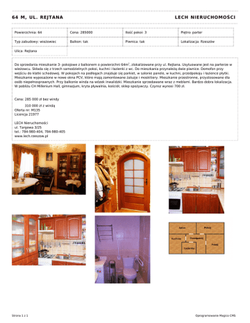 64 M, UL. REJTANA LECH NIERUCHOMOŚCI Powierzchnia: 64 Cena: 285000 Ilość pokoi: 3 Piętro: parter Typ zabudowy: wieżowiec Balkon: tak Piwnica: tak Lokalizacja: Rzeszów Ulica: Rejtana Do sprzedania mieszkanie 3- pokojowe z balkonem o powierzchni 64m2, zlokalizowane przy ul. Rejtana. Usytuowane jest na parterze w wieżowcu. Składa się z trzech samodzielnych pokoi, kuchni i łazienki z wc. Do mieszkania przynależą dwie piwnice. Domofon przy wejściu do klatki schodowej. W pokojach na podłogach znajduje się parkiet, w salonie panele, w kuchni, przedpokoju i łazience płytki. Mieszkanie wyposażone w nowe okna PCV, które mają zamontowane żaluzje i moskitiery. Mieszkanie przestronne, przystosowane dla osób niepełnosprawnych. Przy balkonie winda na wózek inwalidzki. Mieszkanie sprzedawane wraz z meblami. Bardzo dobra lokalizacja. W pobliżu CH Millenium Hall, gimnazjum, kryta pływalnia, kościół, sklep spożywczy. Czynsz wynosi 700 zł. Cena: 285 000 zł bez windy 310 000 zł z windą Oferta nr: M135 Licencja 21977 LECH Nieruchomości ul. Targowa 3/25 tel.: 784-980-404, 784-980-405 www.lech.rzeszow.pl Strona 1 z 1 Oprogramowanie Magico CMS
