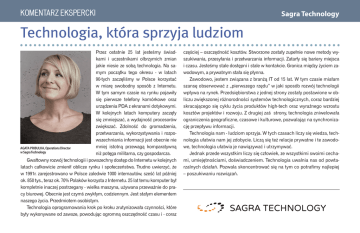 KOMENTARZ EKSPERCKI Sagra Technology Technologia, która sprzyja ludziom Przez ostatnie 25 lat jesteśmy świadkami i uczestnikami olbrzymich zmian jakie niesie ze sobą technologia. Na samym początku tego okresu - w latach 90-tych zaczęliśmy w Polsce korzystać w miarę swobodny sposób z Internetu. W tym samym czasie na rynku pojawiły się pierwsze telefony komórkowe oraz urządzenia PDA z ekranami dotykowymi. W kolejnych latach komputery zaczęły się zmniejszać, a wydajność procesorów zwiększać. Zdolność do gromadzenia, przetwarzania, wykorzystywania i rozpowszechniania informacji jest obecnie nie mniej istotną przewagą komparatywną AGATA PRIBULKA, Operations Director w Sagra Technology niż potęga militarna, czy gospodarcza. Gwałtowny rozwój technologii i powszechny dostęp do Internetu w kolejnych latach całkowicie zmienił oblicze rynku i społeczeństwa. Trudno uwierzyć, że w 1991r. zarejestrowano w Polsce zaledwie 1000 internautów, sześć lat później ok. 850 tys., teraz ok. 70% Polaków korzysta z Internetu. 25 lat temu komputer był kompletnie inaczej postrzegany - wielka maszyna, używana przeważnie do pracy biurowej. Obecnie jest czymś zwykłym, codziennym. Jest stałym elementem naszego życia. Przedmiotem osobistym. Technologia oprogramowania krok po kroku zrutynizowała czynności, które były wykonywane od zawsze, powodując ogromną oszczędność czasu i - coraz częściej – oszczędność kosztów. Stworzone zostały zupełnie nowe metody wyszukiwania, przesyłania i przetwarzania informacji. Zatarły się bariery miejsca i czasu. Jesteśmy stale dostępni i stale w kontakcie. Granica między życiem zawodowym, a prywatnym stała się płynna. Zawodowo, jestem związana z branżą IT od 15 lat. W tym czasie miałam szansę obserwować z „pierwszego rzędu” w jaki sposób rozwój technologii wpływa na rynek. Przedsiębiorstwa z jednej strony zostały postawione w obliczu zwiększonej różnorodności systemów technologicznych, coraz bardziej skracającego się cyklu życia produktów high-tech oraz wyraźnego wzrostu kosztów projektów i rozwoju. Z drugiej zaś strony, technologia zniwelowała ograniczenia geograficzne, czasowe i kulturowe, pozwalając na synchronizację przepływu informacji. Technologia nam - ludziom sprzyja. W tych czasach liczy się wiedza, technologia ułatwia nam jej zdobycie. Liczą się też relacje prywatne i te zawodowe, technologia ułatwia je nawiązywać i utrzymywać. Jednak przede wszystkim liczy się człowiek, ze wszystkimi swoimi cechami, umiejętnościami, doświadczeniem. Technologia uwalnia nas od powtarzalnych działań. Pozwala skoncentrować się na tym co potrafimy najlepiej – poszukiwaniu rozwiązań.