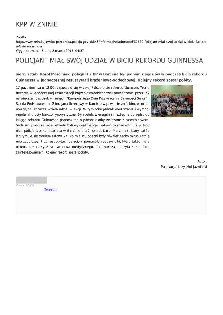 KPP W ŻNINIE Źródło: http://www.znin.kujawsko-pomorska.policja.gov.pl/k45/informacj/wiadomosci/69680,Policjant-mial-swoj-udzial-w-biciu-Rekord u-Guinnessa.html Wygenerowano: Środa, 8 marca 2017, 06:37 POLICJANT MIAŁ SWÓJ UDZIAŁ W BICIU REKORDU GUINNESSA sierż. sztab. Karol Marciniak, policjant z KP w Barcinie był jednym z sędziów w podczas bicia rekordu Guinnessa w jednoczesnej resuscytacji krążeniowo-oddechowej. Kolejny rekord został pobity. 17 października o 12.00 rozpoczęło się w całej Polsce bicie rekordu Guinness World Records w jednoczesnej resuscytacji krążeniowo-oddechowej prowadzonej przez jak największą ilość osób w ramach “Europejskiego Dnia Przywracania Czynności Serca” . Szkoła Podstawowa nr 2 im. Jana Brzechwy w Barcinie w powiecie żnińskim, wzorem ubiegłych lat także wzięła udział w akcji. W tym roku jednak obostrzenia i wymogi regulaminu były bardzo rygorystyczne. By spełnić wymagania niezbędne do wpisu do księgo rekordu Guinnessa poproszono o pomoc osoby związane z ratownictwem. Sędziami podczas bicia rekordu byli wykwalifikowani ratownicy medyczni , a w śród nich policjant z Komisariatu w Barcinie sierż. sztab. Karol Marciniak, który także legitymuje się tytułem ratownika. Na miejscu obecni były również osoby skrupulatnie mierzący czas. Przy resuscytacji dzieciom pomagały nauczycielki, które także mają ukończone kursy z ratownictwa medycznego. Ta impreza cieszyła się dużym zainteresowaniem. Kolejny rekord został pobity. Autor: Publikacja: Krzysztof Jaźwiński Ocena: 5/5 (3) Tweetnij