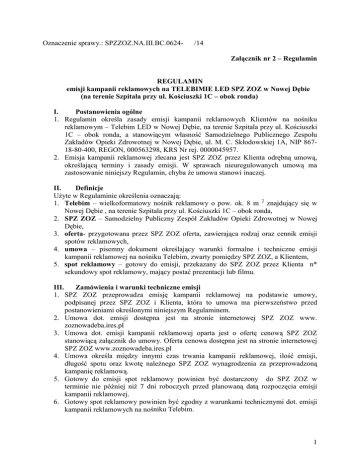 Oznaczenie sprawy.: SPZZOZ.NA.III.BC.0624- /14 Załącznik nr 2 – Regulamin REGULAMIN emisji kampanii reklamowych na TELEBIMIE LED SPZ ZOZ w Nowej Dębie (na terenie Szpitala przy ul. Kościuszki 1C – obok ronda) I. Postanowienia ogólne 1. Regulamin określa zasady emisji kampanii reklamowych Klientów na nośniku reklamowym – Telebim LED w Nowej Dębie, na terenie Szpitala przy ul. Kościuszki 1C – obok ronda, a stanowiącym własność Samodzielnego Publicznego Zespołu Zakładów Opieki Zdrowotnej w Nowej Dębie, ul. M. C. Skłodowskiej 1A, NIP 86718-80-400, REGON, 000563298, KRS Nr rej. 0000045957. 2. Emisja kampanii reklamowej zlecana jest SPZ ZOZ przez Klienta odrębną umową, określającą terminy i zasady emisji. W sprawach nieuregulowanych umową ma zastosowanie niniejszy Regulamin, chyba że umowa stanowi inaczej. II. Definicje Użyte w Regulaminie określenia oznaczają: 1. Telebim – wielkoformatowy nośnik reklamowy o pow. ok. 8 m 2 znajdujący się w Nowej Dębie , na terenie Szpitala przy ul. Kościuszki 1C – obok ronda, 2. SPZ ZOZ – Samodzielny Publiczny Zespół Zakładów Opieki Zdrowotnej w Nowej Dębie, 3. oferta- przygotowana przez SPZ ZOZ oferta, zawierająca rodzaj oraz cennik emisji spotów reklamowych, 4. umowa – pisemny dokument określający warunki formalne i techniczne emisji kampanii reklamowej na nośniku Telebim, zwarty pomiędzy SPZ ZOZ, a Klientem, 5. spot reklamowy – gotowy do emisji, przekazany do SPZ ZOZ przez Klienta n* sekundowy spot reklamowy, mający postać prezentacji lub filmu. III. Zamówienia i warunki techniczne emisji 1. SPZ ZOZ przeprowadza emisję kampanii reklamowej na podstawie umowy, podpisanej przez SPZ ZOZ i Klienta, która to umowa ma pierwszeństwo przed postanowieniami określonymi niniejszym Regulaminem. 2. Umowa dot. emisji dostępna jest na stronie internetowej SPZ ZOZ www. zoznowadeba.ires.pl 3. Umowa dot. emisji kampanii reklamowej oparta jest o ofertę cenową SPZ ZOZ stanowiącą załącznik do umowy. Oferta cenowa dostępna jest na stronie internetowej SPZ ZOZ www.zoznowadeba.ires.pl 4. Umowa określa między innymi czas trwania kampanii reklamowej, ilość emisji, długość spotu oraz kwotę należnego SPZ ZOZ wynagrodzenia za przeprowadzoną kampanię reklamową. 5. Gotowy do emisji spot reklamowy powinien być dostarczony do SPZ ZOZ w terminie nie później niż 7 dni roboczych przed planowaną datą rozpoczęcia emisji kampanii reklamowej. 6. Gotowy spot reklamowy powinien być zgodny z warunkami technicznymi dot. emisji kampanii reklamowych na nośniku Telebim. 1 7. Warunki techniczne oraz wytyczne dot. planowania kampanii znajdują się na stronie internetowej SPZ ZOZ www.zoznowadeba.ires.pl 8. Podpisując umowę Klient oświadcza, że przysługują mu wszystkie prawa autorskie do wykorzystanych w spocie reklamowym znaków graficznych, zdjęć, haseł reklamowych, znaków towarowych, wzorów zdobniczych i itp. 9. Klient oświadcza, że działa w imieniu firmy/jednostki której kampania reklamowa dotyczy oraz posiada odpowiednie uprawnienia do składania zamówienia na kampanię reklamową. 10. Klient oświadcza, że zlecana emisja kampanii reklamowej jest zgodna z obowiązującymi przepisami prawa i nie narusza praw autorskich oraz innych praw osób trzecich. 11. SPZ ZOZ nie ponosi odpowiedzialności za treść spotów reklamowych emitowanych na Telebimie, w szczególności nie ponosi odpowiedzialności za naruszenie praw określonych w pkt. 8.9.10. 12. Klient zobowiązuje się, że w momencie wystąpienia z roszczeniami w stosunku do SPZ ZOZ przez osoby trzecie z tytułu naruszenia ich praw przez wykorzystanie spotu reklamowego przekazanego przez klienta – wstąpi do sprawy w miejsce SPZ ZOZ. Jeżeli w toku tego postępowania procesowego SPZ ZOZ poniesie jakiekolwiek koszty, w tym w szczególności koszty doradztwa prawnego, koszty postępowania sądowego lub koszty zastępstwa procesowego oraz zasądzonych lub ustalonych drogą ugody odszkodowań – wówczas Klient zwróci SPZ ZOZ na jej pierwsze żądanie wszystkie te koszty i inne koszty związane z procesem. IV. Warunki i terminy płatności 1. Za przeprowadzoną kampanię reklamową SPOZ ZOZ obciąży Klienta fakturą VAT na kwotę określoną umową o emisję kampanii reklamowej. 2. Płatności faktury określonej w pkt. 1 Klient dokonuje na rachunek bankowy wskazany w fakturze, w terminie 7 dni roboczych, liczonych od pierwszego dnia trwania kampanii reklamowej, chyba że umowa stanowi inaczej. 3. W przypadku rezygnacji Klienta z kampanii reklamowej określonej umową Klient płaci karę umowną w wysokości 20 % wartości brutto całej umowy, niezależnie od wynagrodzenia za kampanię przeliczonego proporcjonalnie do czasu jej faktycznej realizacji. 4. W przypadku wcześniejszego zapłacenia wynagrodzenia za emisję kampanii reklamowej – kara umowna podlega potrąceniu z tego wynagrodzenia. 5. W przypadku nie dokonania w terminie płatności wynagrodzenia, SPZ ZOZ nalicza odsetki ustawowe oraz zastrzega prawo przerwania emisji kampanii reklamowej ze skutkiem natychmiastowym. 6. Klient upoważnia SPZ ZOZ do wystawienia faktury VAT bez podpisu Klienta. 7. SPZ ZOZ zastrzega sobie prawo odmowy lub wstrzymania emisji kampanii reklamowej w chwili: a) gdy zachodzi uzasadnione podejrzenie, iż nie są zachowane postanowienia niniejszego Regulaminu b) gdy stwierdzi, że treść jest sprzeczna z normami etycznymi, dobrymi obyczajami, niezgodna z przepisami prawa lub narusza prawa osób trzecich. c) gdy treść lub forma kampanii reklamowej jest sprzeczna z interesem SPZ ZOZ. d) gdy spot reklamowy jest złej jakości technicznej, uniemożliwiającej jego emisję. 2 8. Klient oświadcza, że nie będzie dochodził roszczeń odszkodowawczych lub zadośćuczynienia z tytułów określonych w pkt. 7 niniejszego Regulaminu. 9. SPZ ZOZ zastrzega sobie prawo przerw w emisji spotu reklamowego, reklamowego w szczególności w przypadku ujemnego wpływu