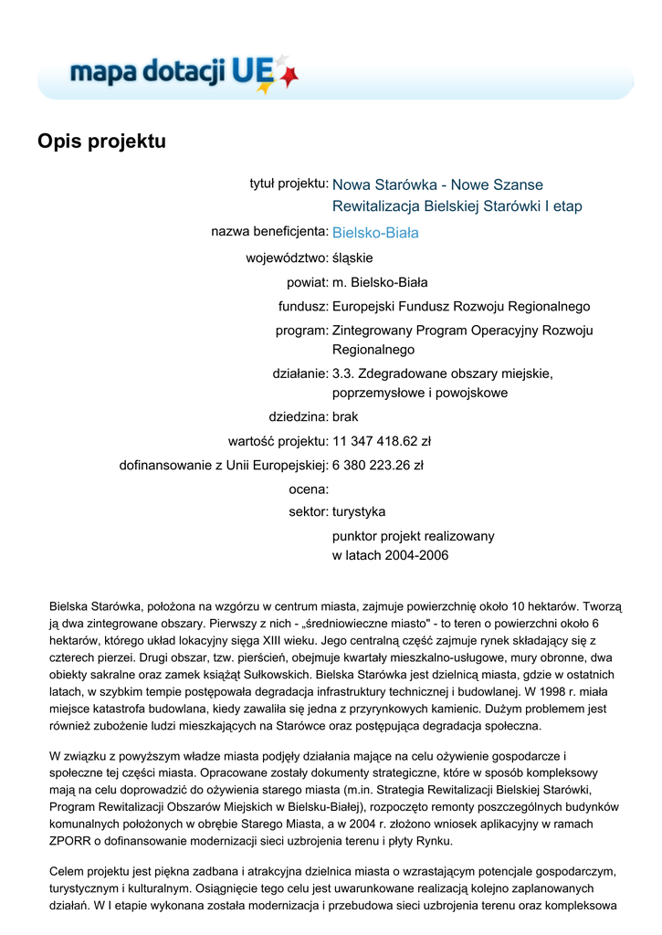 Opis projektu tytuł projektu: Nowa Starówka - Nowe Szanse Rewitalizacja Bielskiej Starówki I etap nazwa beneficjenta: Bielsko-Biała województwo: śląskie powiat: m. Bielsko-Biała fundusz: Europejski Fundusz Rozwoju Regionalnego program: Zintegrowany Program Operacyjny Rozwoju Regionalnego działanie: 3.3. Zdegradowane obszary miejskie, poprzemysłowe i powojskowe dziedzina: brak wartość projektu: 11 347 418.62 zł dofinansowanie z Unii Europejskiej: 6 380 223.26 zł ocena: sektor: turystyka punktor projekt realizowany w latach 2004-2006 Bielska Starówka, położona na wzgórzu w centrum miasta, zajmuje powierzchnię około 10 hektarów. Tworzą ją dwa zintegrowane obszary. Pierwszy z nich - „średniowieczne miasto" - to teren o powierzchni około 6 hektarów, którego układ lokacyjny sięga XIII wieku. Jego centralną część zajmuje rynek składający się z czterech pierzei. Drugi obszar, tzw. pierścień, obejmuje kwartały mieszkalno-usługowe, mury obronne, dwa obiekty sakralne oraz zamek książąt Sułkowskich. Bielska Starówka jest dzielnicą miasta, gdzie w ostatnich latach, w szybkim tempie postępowała degradacja infrastruktury technicznej i budowlanej. W 1998 r. miała miejsce katastrofa budowlana, kiedy zawaliła się jedna z przyrynkowych kamienic. Dużym problemem jest również zubożenie ludzi mieszkających na Starówce oraz postępująca degradacja społeczna. W związku z powyższym władze miasta podjęły działania mające na celu ożywienie gospodarcze i społeczne tej części miasta. Opracowane zostały dokumenty strategiczne, które w sposób kompleksowy mają na celu doprowadzić do ożywienia starego miasta (m.in. Strategia Rewitalizacji Bielskiej Starówki, Program Rewitalizacji Obszarów Miejskich w Bielsku-Białej), rozpoczęto remonty poszczególnych budynków komunalnych położonych w obrębie Starego Miasta, a w 2004 r. złożono wniosek aplikacyjny w ramach ZPORR o dofinansowanie modernizacji sieci uzbrojenia terenu i płyty Rynku. Celem projektu jest piękna zadbana i atrakcyjna dzielnica miasta o wzrastającym potencjale gospodarczym, turystycznym i kulturalnym. Osiągnięcie tego celu jest uwarunkowane realizacją kolejno zaplanowanych działań. W I etapie wykonana została modernizacja i przebudowa sieci uzbrojenia terenu oraz kompleksowa przebudowa płyty Rynku (zakres przedmiotowy złożonego wniosku aplikacyjnego). W zakresie sieci uzbrojenia terenu zmodernizowano sieć wodociągową, kanalizacyjną i sanitarną, sieci cieplne, energetyczne, gazowe, teletechniczne oraz nawierzchnia drogowa. Z punktu widzenia mieszkańców całego miasta, jak również potencjalnych inwestorów i prywatnych właścicieli przyrynkowych kamienic, istotną sprawą jest kompleksowy remont Płyty Rynku. Rewitalizacja Bielskiej Starówki to powrót do historycznych korzeni, do przywrócenia wyglądu sprzed wielu lat połączonego z nową funkcją. W ramach realizacji projektu na Rynku pojawiła się między innymi archeologiczna ekspozycja „Wagi Miejskiej", wybudowany został zespół fontanny z figurą Neptuna, zabytkową studnią, zegarem i ciekiem wodnym, zrekonstruowano także pomnik Św. Jana Nepomucena. Rekonstrukcja starych, zabytkowych pomników, jak również zastosowanie elementów stylowych tj., specjalne ławki oraz iluminacyjne oświetlenie punktowe Płyty, są interesującą wizytówką „nowego-starego miasta". Należy również wspomnieć w tym miejscu, iż miasto pozyskało fundusze na remont miejskich kamienic nie tylko ze środków ERDF, ale również ze środków rządowo-samorządowych. Te wszystkie działania razem są bardzo silnym bodźcem dla prywatnych właścicieli niektórych kamienic przyrynkowych. Zauważalne jest również zainteresowanie wśród potencjalnych inwestorów tą częścią miasta. Rewitalizacja bowiem to proces zmierzający do odbudowy nie tylko zaniedbanych budynków, ale również do ożywienia społecznego i gospodarczego zaniedbanych dzielnic. Atutami projektu są: Bardzo złożony montaż finansowy (wkład własny, wkład gestorów sieci, kredyt z BGK, UE), Współpraca z podmiotami prywatnymi zaangażowanymi w realizację projektu (gestorzy poszczególnych sieci uzbrojenia terenu), Solidne podstawy programowe (dokumenty programowe, m.in. Strategia Rewitalizacji Bielskiej Starówki, Program Rewitalizacji Obszarów Miejskich w Bielsku-Białej), Wyraźne etapowanie procesu rewitalizacji, które świadczy o przyszłościowym podejściu władz Miasta Kompleksowość podejścia obok remontu przestrzeni publicznych i obiektów kubaturowych realizowane są również programy społeczne ułatwiające rozwiązanie problemów związanych z marginalizacją. Przykładem może być projekt „Przeciw Bezradności", współfinansowany ze środków PHARE 2002 zrealizowany przez Miejski Ośrodek Pomocy Społecznej w Bielsku-Białej w okresie od 1 grudnia 2004 r. do 30 listopada 2005 r. Projekt ten jest komplementarny do projektu obejmującego I etap rewitalizacji Bielskiej Starówki gdyż większość osób korzystających ze wsparcia stanowią mieszkańcy zdegradowanych terenów Bielskiej Starówki. W ramach projektu utworzony został Punkt Wsparcia Aktywności Zawodowej, gdzie uczestnicy projektu objęci byli wsparciem psychologicznym, aktywizacją zawodową, szkoleniami oraz szeroko rozumianym doradztwem zawodowym i biznesowym. MOPS uzyskał również dofinansowanie w ramach SPO Rozwój Zasobów Ludzkich na kontynuację działalności Punktu Wsparcia.