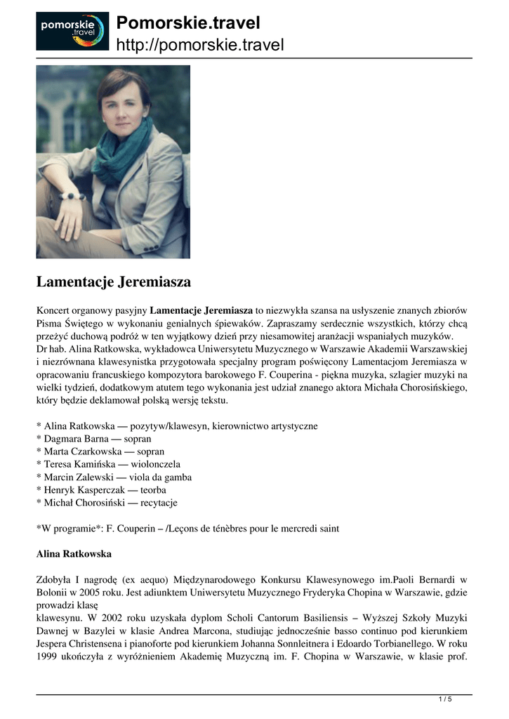 Pomorskie.travel http://pomorskie.travel Lamentacje Jeremiasza Koncert organowy pasyjny Lamentacje Jeremiasza to niezwykła szansa na usłyszenie znanych zbiorów Pisma Świętego w wykonaniu genialnych śpiewaków. Zapraszamy serdecznie wszystkich, którzy chcą przeżyć duchową podróż w ten wyjątkowy dzień przy niesamowitej aranżacji wspaniałych muzyków. Dr hab. Alina Ratkowska, wykładowca Uniwersytetu Muzycznego w Warszawie Akademii Warszawskiej i niezrównana klawesynistka przygotowała specjalny program poświęcony Lamentacjom Jeremiasza w opracowaniu francuskiego kompozytora barokowego F. Couperina - piękna muzyka, szlagier muzyki na wielki tydzień, dodatkowym atutem tego wykonania jest udział znanego aktora Michała Chorosińskiego, który będzie deklamował polską wersję tekstu. * Alina Ratkowska — pozytyw/klawesyn, kierownictwo artystyczne * Dagmara Barna — sopran * Marta Czarkowska — sopran * Teresa Kamińska — wiolonczela * Marcin Zalewski — viola da gamba * Henryk Kasperczak — teorba * Michał Chorosiński — recytacje *W programie*: F. Couperin – /Leçons de ténèbres pour le mercredi saint Alina Ratkowska Zdobyła I nagrodę (ex aequo) Międzynarodowego Konkursu Klawesynowego im.Paoli Bernardi w Bolonii w 2005 roku. Jest adiunktem Uniwersytetu Muzycznego Fryderyka Chopina w Warszawie, gdzie prowadzi klasę klawesynu. W 2002 roku uzyskała dyplom Scholi Cantorum Basiliensis – Wyższej Szkoły Muzyki Dawnej w Bazylei w klasie Andrea Marcona, studiując jednocześnie basso continuo pod kierunkiem Jespera Christensena i pianoforte pod kierunkiem Johanna Sonnleitnera i Edoardo Torbianellego. W roku 1999 ukończyła z wyróżnieniem Akademię Muzyczną im. F. Chopina w Warszawie, w klasie prof. 1/5 Pomorskie.travel http://pomorskie.travel Leszka Kędrackiego. Jest absolwentką studiów podyplomowych na Wydziale Zarządzania i Ekonomii Politechniki Gdańskiej. W 2009 otrzymała stopień doktora sztuki muzycznej przyznany przez Uniwersytet Muzyczny Fryderyka Chopina w Warszawie. W roku 2014 otrzymała stopień doktora habilitowanego przyznany przez Radę Wydziału Wokalno-Instrumentalnego Akademii Muzycznej im. Karola Szymanowskiego w Katowicach. W 2009 i 2013 roku została wyróżniona przez czytelników Gazety Wyborczej nagrodą „Sztorm Roku". W 2008 otrzymała nagrodę Prezydenta Miasta Gdańska dla Młodych Twórców Kultury. Była stypendystką Ministra Kultury i Sztuki, Marszałka Województwa Pomorskiego, Fundacji Kultury i wielu innych zagranicznych fundacji. W 2003 roku uzyskała III nagrodę w Międzynarodowym Konkursie Muzyki Dawnej „Van Vlaanderen”* w Brugii (Belgia), z kierowanym przez siebie zespołem Esperanto. Była także finalistką Konkursów Klawesynowych w Budapeszcie (2000), i Warszawie (1998). Współpracuje z Goldberg Baroque Ensemble, specjalizującym się w wykonawstwie muzyki zachowanej w zbiorach Biblioteki Gdańskiej PAN. Z zespołem tym dokumentuje muzykalia w serii „Muzyczne dziedzictwo Miasta Gdańska” (DUX, Sarton). Dużą część działalności poświęca również wykonawstwu współczesnej muzyki pisanej na klawesyn. W 2010 roku ukazała się jej debiutancka solowa płyta z Wariacjami Goldbergowskimi J. S. Bacha (Sarton), która w 2011 otrzymała dwie nominacje do nagrody fonograficznej „Fryderyk”. W czerwcu 2012 ukazała się jej płyta z trzema koncertami klawesynowymi Johanna Jeremiasa du Graina, zmarłego w 1756 roku gdańskiego kompozytora i organisty, rok później wydawnictwo UMFC opublikowało książkę poświęconą tym kompozycjom. W latach 2011-2014 pracowała jako kierownik artystyczny poznańskiego zespołu "Musica Maxima", a w latach 2002-2006 w Szwajcarii jako chórmistrz w kościołach kantonu Bern i Basel-Landschaft. Alina Ratkowska jest inicjatorem i dyrektorem Festiwalu Goldbergowskiego w Gdańsku. Dagmara Barna Absolwentka Państwowej Wyższej Szkoły Zawodowej w Gorzowie Wielkopolskim (kierunek: pedagogika, specjalność: praca socjalna). Naukę śpiewu solowego rozpoczęła w PSM II st. im. T. Szeligowskiego w Gorzowie Wielkopolskim w klasie mgr Beaty Gramzy. W 2014 roku ukończyła studia magisterskie na Uniwersytecie Muzycznym Fryderyka Chopina w klasie śpiewu solowego prof. Cezarego Szyfmana. Działalność muzyczną rozpoczęła, jako flecistka w gorzowskim Zespole Muzyki Dawnej Preambulum specjalizującym się w wykonawstwie muzyki dawnej. Z zespołem tym koncertowała w całej Polsce oraz za granicą, m. in. w Belgii, Niemczech, Austrii, Bułgarii, Portugalii, zdobywając liczne nagrody w konkursach i na festiwalach. W 2009 i 2012 roku otrzymała Stypendium twórcze i artystyczne miasta Gorzowa Wielkopolskiego. W roku 2011 wraz z Weroniką Grozdew - Kołacińską i zespołem Ars Nova nagrała płytę Renaissance Polish Music z Tabulaturą Warszawskiego Towarzystwa Muzycznego, która otrzymała nominację do nagrody Fryderyk 2011 w dziedzinie Album Roku Muzyka Dawna i Barokowa. W Teatrze Collegium Nobilium w marcu 2012 roku wykonała partię Amphitrite oraz Ariela w operze „Burza” H. Purcella. W kwietniu 2013 roku wcieliła się w tytułową rolę w „Koronacji Poppei” C. Monteverdiego. W grudniu tego samego roku wykonała partię Venus w operze „Venus i Adonis” J. Blow'a w Teatrze Dramatycznym im. A. Węgierki w Białymstoku. W 2014 roku wcieliła się w rolę Paminy w operze „Czarodziejski Flet” W. A. Mozarta w Operze i Filharmonii Podlaskiej w Białymstoku. W 2012 i 2013 roku została zaproszona do uczestnictwa w Europäisches Liedforum w Berlinie oraz 2/5 Pomorskie.travel http://pomorskie.travel Wilnie. W grudniu 2012 roku ukończyła Podyplomowe Międzywydziałowe Studium Pieśni na Uniwersytecie Muzycznym Fryderyka Chopina. W listopadzie 2013 roku została laureatką drugiego miejsca na II Międzynarodowym Konkursie Wokalnym Muzyki Dawnej Cancium Gaudium w Poznaniu. W maju 2014 roku brała udział w Konkursie Królowej Elżbiety w Brukseli, a w sie