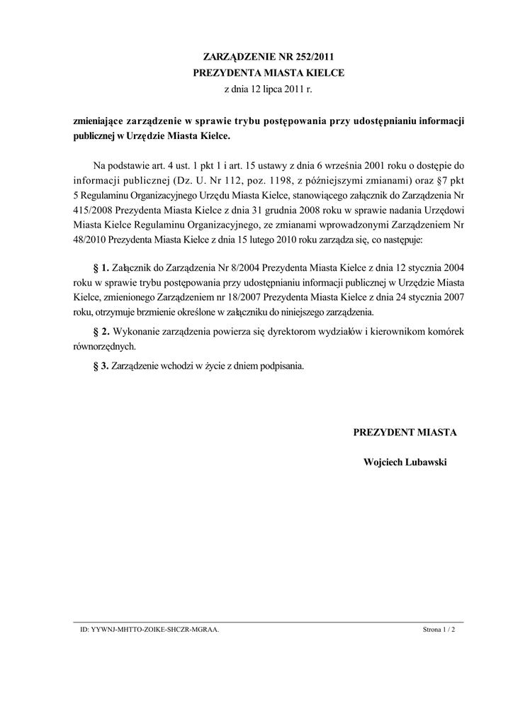 ZARZĄDZENIE NR 252/2011 PREZYDENTA MIASTA KIELCE z dnia 12 lipca 2011 r. zmieniające zarządzenie w sprawie trybu postępowania przy udostępnianiu informacji publicznej w Urzędzie Miasta Kielce. Na podstawie art. 4 ust. 1 pkt 1 i art. 15 ustawy z dnia 6 września 2001 roku o dostępie do informacji publicznej (Dz. U. Nr 112, poz. 1198, z późniejszymi zmianami) oraz §7 pkt 5 Regulaminu Organizacyjnego Urzędu Miasta Kielce, stanowiącego załącznik do Zarządzenia Nr 415/2008 Prezydenta Miasta Kielce z dnia 31 grudnia 2008 roku w sprawie nadania Urzędowi Miasta Kielce Regulaminu Organizacyjnego, ze zmianami wprowadzonymi Zarządzeniem Nr 48/2010 Prezydenta Miasta Kielce z dnia 15 lutego 2010 roku zarządza się, co następuje: § 1. Załącznik do Zarządzenia Nr 8/2004 Prezydenta Miasta Kielce z dnia 12 stycznia 2004 roku w sprawie trybu postępowania przy udostępnianiu informacji publicznej w Urzędzie Miasta Kielce, zmienionego Zarządzeniem nr 18/2007 Prezydenta Miasta Kielce z dnia 24 stycznia 2007 roku, otrzymuje brzmienie określone w załączniku do niniejszego zarządzenia. § 2. Wykonanie zarządzenia powierza się dyrektorom wydziałów i kierownikom komórek równorzędnych. § 3. Zarządzenie wchodzi w życie z dniem podpisania. PREZYDENT MIASTA Wojciech Lubawski Załącznik do Zarządzenia Nr 252/2011 Prezydenta Miasta Kielce z dnia 12 lipca 2011 r. Zalacznik1.doc Tryb postępowania przy udostępnianiu informacji publicznej w Urzędzie Miasta Kielce ID: YYWNJ-MHTTO-ZOIKE-SHCZR-MGRAA. Strona 1 / 2 Wojciech Lubawski Załącznik do Zarządzenia Nr 252/2011 Prezydenta Miasta Kielce z dnia 12 lipca 2011 r. Zalacznik1.doc Tryb postępowania przy udostępnianiu informacji publicznej w Urzędzie Miasta Kielce ID: YYWNJ-MHTTO-ZOIKE-SHCZR-MGRAA. Strona 2 / 2