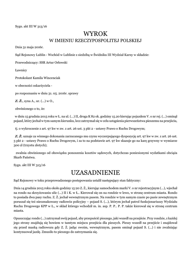 Sygn. akt III W 313/16 WYROK W IMIENIU RZECZYPOSPOLITEJ POLSKIEJ Dnia 31 maja 2016r. Sąd Rejonowy Lublin - Wschód w Lublinie z siedzibą w Świdniku III Wydział Karny w składzie: Przewodniczący: SSR Artur Orłowski Ławnicy Protokolant Kamila Wincenciak w obecności oskarżyciela po rozpoznaniu w dniu 31. 05. 2016r. sprawy Z. Ż., syna A., ur. (...) w O., obwinionego o to, że: w dniu 15 grudnia 2015 roku w Ł. na ul. (...) II, droga K 82 ok. godziny 15.20 kierując pojazdem V. o nr rej. (...) ominął pojazd, który jechał w tym samym kierunku, lecz zatrzymał się w celu ustąpienia pierwszeństwa pieszemu na przejściu, tj. o wykroczenie z art. 97 kw w zw. z art. 26 ust. 3 pkt 2 - ustawy Prawo o Ruchu Drogowym; Z. Ż. uznaje za winnego dokonania zarzucanego mu czynu wyczerpującego dyspozycję art. 97 kw w zw. z art. 26 ust. 3 pkt 2 - ustawy Prawo o Ruchu Drogowym, i za to na podstawie art. 97 kw skazuje go na karę grzywny w wymiarze 300 zł (trzystu złotych); zwalnia obwinionego od obowiązku ponoszenia kosztów sądowych, dotychczas poniesionymi wydatkami obciąża Skarb Państwa. Sygn. akt III W 313/16 UZASADNIENIE Sąd Rejonowy w toku przeprowadzonego postępowania ustalił następujący stan faktyczny: Dnia 14 grudnia 2015 roku około godziny 15:20 Z. Ż., kierując samochodem marki V. o nr rejestracyjnym (...), wjechał na rondo na skrzyżowaniu ulic (...) II i K. w Ł.. Kierował się on na rondzie w lewo, w stronę centrum miasta. Rondo to posiada dwa pasy ruchu. Z. Ż. jechał wewnętrznym pasem. Na rondzie w tym samym czasie po pasie zewnętrznym poruszał się też nieoznakowany radiowóz policyjny – pojazd S. (...), którym jechał patrol funkcjonariuszy Wydziału Ruchu Drogowego KPP w Ł., w skład którego wchodził m. in. asp. P. P.. P. P. także kierował się w stronę centrum miasta. Opuszczając rondo (...) zatrzymał swój pojazd, aby przepuścić pieszego, jaki wszedł na przejście. Przy rondzie, z każdej jego strony znajdują się bowiem w tamtym miejscu przejścia dla pieszych. Pieszy wszedł na przejście i znajdował się przed maską radiowozu gdy Z. Ż. jadąc swoim, wewnętrznym, pasem ominął pojazd S. (...) i nie zwalniając kontynuował jazdę. Zmusiło to pieszego do zatrzymania się. P. P. po zejściu pieszego z jezdni udał się niezwłocznie za samochodem Z. Ż. i zatrzymał go w związku ze stwierdzonym wykroczeniem. Kierowca odmówił jednak przyjęcia mandatu karnego twierdząc, że to radiowóz zasłonił mu pieszego i dlatego nie poczuwa się do winy. Powyższy stan faktyczny Sąd Rejonowy ustalił na podstawie zeznań świadka P. P. (k. 2v, 23v-24) a częściowo wyjaśnień obwinionego Z. Ż. (k. 6, 23-23v). Sąd uwzględnił także i orzekł na podstawie dowodu nieosobowego w postaci notatki urzędowej (k. 1),. Obwiniony Z. Ż. zarówno w toku czynności wyjaśniających, jak i przed Sądem nie przyznał się do dokonania zarzucanego mu czynu. Potwierdził, iż jechał samochodem w przedmiotowym miejscu i czasie. Jednak wyjaśnił, iż nie mógł popełnić wykroczenia, gdyż jechał swoim pasem ruchu, stąd nie może być w jego wypadku mowa o omijaniu. W dalszym toku postępowania argumentował on dodatkowo, że jechał „z boku” (tj. na wysokości) radiowozu i dlatego go nie widział. Nie widział także na przejściu ani nawet przy dojściu do jezdni żadnego pieszego. Przyznał jednocześnie, że policjanci „widocznie chodnik widzieli lepiej niż ja i ta osoba może dopiero dochodziła do przejścia”. Natomiast same pasy na jezdni obwiniony przejeżdżając przez nie widział. W jego ocenie mógł w tej sytuacji bezpiecznie zjechać z ronda. Na wstępie trzeba zauważyć, że w składanych wyjaśnieniach Z. Ż. w dużej mierze nie opisywał faktów, a przedstawiał ich ocenę ze swojego punktu widzenia. Kwestie te zostaną omówione w dalszej części niniejszego uzasadnienia jako nie poddające się ocenie z punktu widzenia wiarygodności, gdyż ta, jak wiadomo, dotyczy relacjonowanych faktów a nie ich interpretacji. Wyjaśniania obwinionego odnoszące się do jego bytności na miejscu i trasy przejazdu Sąd Rejonowy obdarzył wiarą, jako logiczne, nie znajdujące dowodów przeciwnych i niekwestionowane. Nie odnoszą się one jednak w tej części do kwestii realizacji znamion wykroczenia, stanowiąc jedynie jej kontekst. Zdaniem Sądu Rejonowego wyjaśnienia obwinionego w zakresie w jakim twierdzi on, iż nie omijał radiowozu ponieważ jechał równolegle obok niego oraz braku pieszego na przejściu nie zasługują na uwzględnienie. Po pierwsze nie wytrzymują one konfrontacji z zeznaniami świadka P. P.. Po wtóre są one nielogiczne i sprzeczne z zasadami doświadczenia życiowego. Obwiniony miał nie widzieć radiowozu, ponieważ ten nie jechał przed nim ale równolegle do niego, drugim pasem. Jednak nawet w przypadku jazdy dwóch pojazdów równolegle oba one są nawzajem widoczne przez boczne szyby. Dodatkowo trzeba pamiętać, że Z. Ż. jechał przez 3/4 skrzyżowania z ruchem okrężnym, a następnie zjeżdżał z niego opuszczając wewnętrzny, a więc przecinając zewnętrzny pas ruchu. Tym bardziej więc musiał on rozglądać się na boki – wymagały tego elementarne względy bezpieczeństwa. Dodatkowo istnieje sprzeczność wewnętrzna słów obwinionego, który twierdził, że możliwe jest, że pieszy był widziany przez policjantów ale dopiero dochodzący do przejścia. Otóż gdyby tak było, to nic nie stałoby na przeszkodzie, żeby takiego pieszego zobaczył również Z. Ż.. Wszak jadąc na wysokości S. (...), widoczność do przodu w sektorze 180 stopni miał nieograniczoną. Tego rodzaju wyjaśnienia potraktowane więc być muszą jedynie jako przyjęta w celu uniknięcia swojej odpowiedzialności linia obrony i odrzucone, jako nie wytrzymujące konfrontacji, tak z zeznaniami obdarzonego wiarą świadka jak i z zasadami logiki oraz doświadczenia życiowego. Sąd Rejonowy walorem wiary