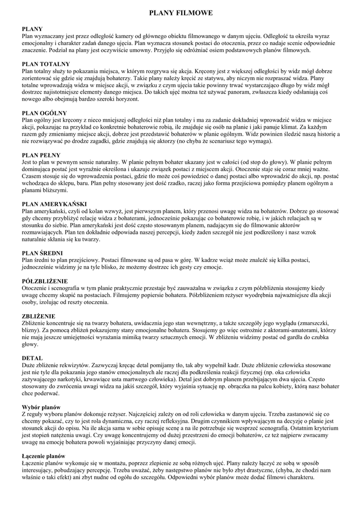 PLANY FILMOWE PLANY Plan wyznaczany jest przez odległość kamery od głównego obiektu filmowanego w danym ujęciu. Odległość ta określa wyraz emocjonalny i charakter zadań danego ujęcia. Plan wyznacza stosunek postaci do otoczenia, przez co nadaje scenie odpowiednie znaczenie. Podział na plany jest oczywiście umowny. Przyjęło się odróżniać osiem podstawowych planów filmowych. PLAN TOTALNY Plan totalny służy to pokazania miejsca, w którym rozgrywa się akcja. Kręcony jest z większej odległości by widz mógł dobrze zorientować się gdzie się znajdują bohaterzy. Takie plany należy kręcić ze statywu, aby niczym nie rozpraszać widza. Plany totalne wprowadzają widza w miejsce akcji, w związku z czym ujęcia takie powinny trwać wystarczająco długo by widz mógł dostrzec najistotniejsze elementy danego miejsca. Do takich ujęć można też używać panoram, zwłaszcza kiedy odsłaniają coś nowego albo obejmują bardzo szeroki horyzont. PLAN OGÓLNY Plan ogólny jest kręcony z nieco mniejszej odległości niż plan totalny i ma za zadanie dokładniej wprowadzić widza w miejsce akcji, pokazując na przykład co konkretnie bohaterowie robią, ile znajduje się osób na planie i jaki panuje klimat. Za każdym razem gdy zmieniamy miejsce akcji, dobrze jest przedstawić bohaterów w planie ogólnym. Widz powinien śledzić naszą historię a nie rozwiązywać po drodze zagadki, gdzie znajdują się aktorzy (no chyba że scenariusz tego wymaga). PLAN PEŁNY Jest to plan w pewnym sensie naturalny. W planie pełnym bohater ukazany jest w całości (od stop do głowy). W planie pełnym dominująca postać jest wyraźnie określona i ukazuje związek postaci z miejscem akcji. Otoczenie staje się coraz mniej ważne. Czasem stosuje się do wprowadzenia postaci, gdzie tło może coś powiedzieć o danej postaci albo wprowadzić do akcji, np. postać wchodząca do sklepu, baru. Plan pełny stosowany jest dość rzadko, raczej jako forma przejściowa pomiędzy planem ogólnym a planami bliższymi. PLAN AMERYKAŃSKI Plan amerykański, czyli od kolan wzwyż, jest pierwszym planem, który przenosi uwagę widza na bohaterów. Dobrze go stosować gdy chcemy przybliżyć relację widza z bohaterami, jednocześnie pokazując co bohaterowie robię, i w jakich relacjach są w stosunku do siebie. Plan amerykański jest dość często stosowanym planem, nadającym się do filmowanie aktorów rozmawiających. Plan ten dokładnie odpowiada naszej percepcji, kiedy żaden szczegół nie jest podkreślony i nasz wzrok naturalnie skłania się ku twarzy. PLAN ŚREDNI Plan średni to plan przejściowy. Postaci filmowane są od pasa w górę. W kadrze wciąż może znaleźć się kilka postaci, jednocześnie widzimy je na tyle blisko, że możemy dostrzec ich gesty czy emocje. PÓŁZBLIŻENIE Otoczenie i scenografia w tym planie praktycznie przestaje być zauważalna w związku z czym półzbliżenia stosujemy kiedy uwagę chcemy skupić na postaciach. Filmujemy popiersie bohatera. Półzbliżeniem reżyser wyodrębnia najważniejsze dla akcji osoby, izolując od reszty otoczenia. ZBLIŻENIE Zbliżenie koncentruje się na twarzy bohatera, uwidacznia jego stan wewnętrzny, a także szczegóły jego wyglądu (zmarszczki, blizny). Za pomocą zbliżeń pokazujemy stany emocjonalne bohatera. Stosujemy go więc ostrożnie z aktorami-amatorami, którzy nie mają jeszcze umiejętności wyrażania mimiką twarzy sztucznych emocji. W zbliżeniu widzimy postać od gardła do czubka głowy. DETAL Duże zbliżenie rekwizytów. Zazwyczaj kręcąc detal pomijamy tło, tak aby wypełnił kadr. Duże zbliżenie człowieka stosowane jest nie tyle dla pokazania jego stanów emocjonalnych ale raczej dla podkreślenia reakcji fizycznej (np. oka człowieka zażywającego narkotyki, krwawiące usta martwego człowieka). Detal jest dobrym planem przebijającym dwa ujęcia. Często stosowany do zwrócenia uwagi widza na jakiś szczegół, który wyjaśnia sytuację np. obrączka na palcu kobiety, którą nasz bohater chce poderwać. Wybór planów Z reguły wyboru planów dokonuje reżyser. Najczęściej zależy on od roli człowieka w danym ujęciu. Trzeba zastanowić się co chcemy pokazać, czy to jest rola dynamiczna, czy raczej refleksyjna. Drugim czynnikiem wpływającym na decyzję o planie jest stosunek akcji do opisu. Na ile akcja sama w sobie opisuję scenę a na ile potrzebuje się wesprzeć scenografią. Ostatnim kryterium jest stopień natężenia uwagi. Czy uwagę koncentrujemy od dużej przestrzeni do emocji bohaterów, cz też najpierw zwracamy uwagę na emocję bohatera powoli wyjaśniając przyczyny danej emocji. Łączenie planów Łączenie planów wykonuje się w montażu, poprzez zlepienie ze sobą różnych ujęć. Plany należy łączyć ze sobą w sposób interesujący, pobudzający percepcję. Trzeba uważać, żeby następstwo planów nie było zbyt drastyczne, (chyba, że chodzi nam właśnie o taki efekt) ani zbyt nudne od ogółu do szczegółu. Odpowiedni wybór planów może dodać filmowi charakteru.
