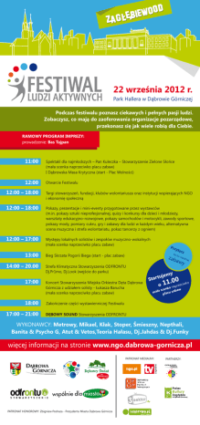 22 września 2012 r. Park Hallera w Dąbrowie Górniczej Podczas festiwalu poznasz ciekawych i pełnych pasji ludzi. Zobaczysz, co mają do zaoferowania organizacje pozarządowe, przekonasz się jak wiele robią dla Ciebie. RAMOWY PROGRAM IMPREZY: prowadzenie: Bas Tajpan 11:00 Spektakl dla najmłodszych – Pan Kuleczka – Stowarzyszenie Zielone Słońce (mała scenka naprzeciwko placu zabaw) I Dąbrowska Masa Krytyczna (start - Plac Wolności) 12:00 Otwarcie Festiwalu 12:00 – 18:00 Targi stowarzyszeń, fundacji, klubów wolontariusza oraz instytucji wspierających NGO i ekonomię społeczną 12:00 – 18:00 Pokazy, prezentacje i mini-eventy przygotowane przez wystawców (m.in. pokazy sztuki nieprofesjonalnej, quizy i konkursy dla dzieci i młodzieży, warsztaty edukacyjno-rozwojowe, pokazy samochodów i motocykli, zawody sportowe, pokazy mody, pomiary cukru, gry i zabawy dla ludzi w każdym wieku, alternatywna scena muzyczna i strefa wolontariatu, pokaz tancerzy z ogniem) 12:00 – 17:00 Występy lokalnych solistów i zespołów muzyczno-wokalnych (mała scenka naprzeciwko placu zabaw) Prz yłą 13:00 14:00 – 20.00 17:00 18:00 17:00 – 21:00 się Bieg Skrzata Pogorii Biega (start - plac zabaw) cz d zab o wspólnej awy Strefa Klimatyczna Stowarzyszenia ODFRONTU Dj.Pr1mo, Dj.Look (wejście do parku) Koncert Stowarzyszenia Miejska Orkiestra Dęta Dąbrowa Górnicza z udziałem solisty - Łukasza Barucha (mała scenka naprzeciwko placu zabaw) y ujem Start 00 o . 1 o 1 a naprzeciwk mała k scen zabaw u plac Zakończenie części wystawienniczej Festiwalu DĘBOWY SOUND Stowarzyszenia ODFRONTU WYKONAWCY: Metrowy, Mikael, Kłak, Stoper, Śmieszny, Nepthali, Banita & Psycho G, Atut & Vetos,Teoria Hałasu, Dj.Jahdas & Dj.Funky więcej informacji na stronie www.ngo.dabrowa-gornicza.pl PATRONAT MEDIALNY: ngo.pl PATRONAT HONOROWY: Zbigniew Podraza - Prezydenta Miasta Dąbrowa Górnicza PARTNERZY: 22 września 2012 r. Park Hallera w Dąbrowie Górniczej PLAN stoisk AKTYWNEGO FESTIWALOWICZA Ale ja Ró ż igi wej Jadw Królo T NAMIO ICZNY SCEN N W EM HA „C LA EN W TR ID UM OW IS ” KO W O- NAMIOT ORGANIZATORA Sp OD O .z N o.o Y . ŚW SP OR TO W A IA T MAŁA SCENA Al eja Ta d eu sz aK oś ciu sz ki SPORT DZIECI I MŁODZIEŻ EKOLOGIA ZDROWIE KULTURA WOLONTARIAT cz Przyłąo wspólnej się d y zabaw