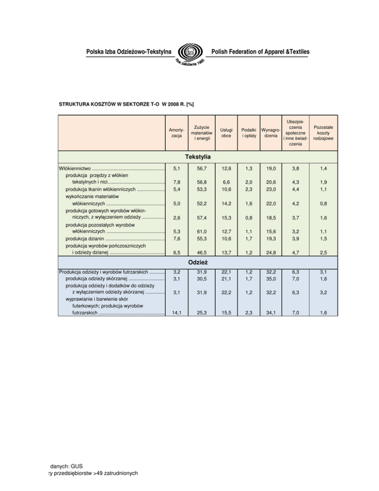 Polska Izba OdzieŜowo-Tekstylna Polish Federation of Apparel &Textiles STRUKTURA KOSZTÓW W SEKTORZE T-O W 2008 R. [%] Amortyzacja ZuŜycie materiałów i energii Usługi obce Podatki i opłaty Ubezpieczenia Wynagrospołeczne dzenia i inne świadczenia Pozostałe koszty rodzajowe Tekstylia Włókiennictwo ....................................................................... 5,1 56,7 12,6 produkcja przędzy z włókien tekstylnych i nici.................................................................................. 7,8 56,8 6,6 produkcja tkanin włókienniczych ...................................... 5,4 53,3 10,6 wykończanie materiałów włókienniczych ........................................................ 5,0 52,2 14,2 produkcja gotowych wyrobów włókinniczych, z wyłączeniem odzieŜy ............................................................ 2,6 57,4 15,3 produkcja pozostałych wyrobów włókienniczych ........................................................ 5,3 61,0 12,7 produkcja dzianin .................................................................. 7,6 55,3 10,6 produkcja wyrobów pończoszniczych i odzieŜy dzianej .................................................6,5 46,5 13,7 1,3 19,0 3,8 1,4 2,0 2,3 20,6 23,0 4,3 4,4 1,9 1,1 1,6 22,0 4,2 0,8 0,8 18,5 3,7 1,6 1,1 1,7 15,6 19,3 3,2 3,9 1,1 1,5 1,2 24,8 4,7 2,5 22,1 21,1 1,2 1,7 32,2 35,0 6,3 7,0 3,1 1,6 22,2 1,2 32,2 6,3 3,2 15,5 2,3 34,1 7,0 1,6 OdzieŜ Produkcja odzieŜy i wyrobów futrzarskich ..................................... 3,2 31,9 produkcja odzieŜy skórzanej ........................................... 3,1 30,5 produkcja odzieŜy i dodatków do odzieŜy z wyłączeniem odzieŜy skórzanej ................... 3,1 31,9 wyprawianie i barwienie skór futerkowych; produkcja wyrobów futrzarskich ............................................................... 14,1 25,3 ródło danych: GUS Dotyczy przedsiębiorstw >49 zatrudnionych