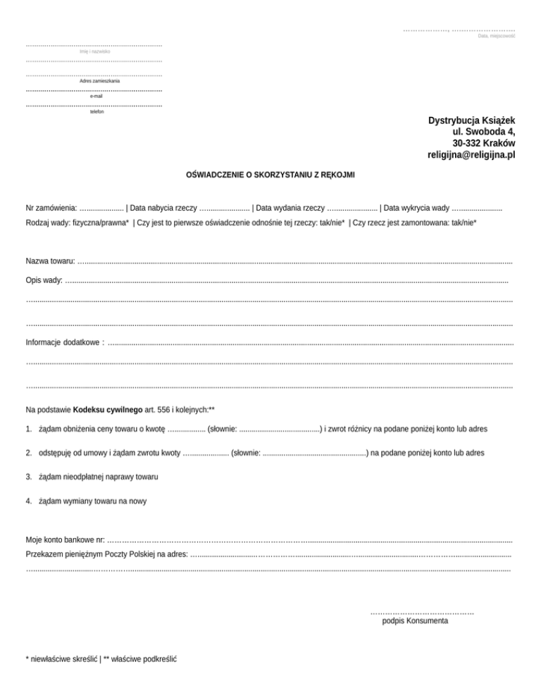………………, ….…………………. Data, miejscowość .................................................................. Imię i nazwisko .................................................................. .................................................................. Adres zamieszkania .................................................................. e-mail .................................................................. telefon Dystrybucja Książek ul. Swoboda 4, 30-332 Kraków [email protected] OŚWIADCZENIE O SKORZYSTANIU Z RĘKOJMI Nr zamówienia: ….................. | Data nabycia rzeczy …..................... | Data wydania rzeczy …..................... | Data wykrycia wady …..................... Rodzaj wady: fizyczna/prawna* | Czy jest to pierwsze oświadczenie odnośnie tej rzeczy: tak/nie* | Czy rzecz jest zamontowana: tak/nie* Nazwa towaru: …............................................................................................................................................................................................................... Opis wady: …................................................................................................................................................................................................................... …........................................................................................................................................................................................................................................ …........................................................................................................................................................................................................................................ Informacje dodatkowe : …................................................................................................................................................................................................. …........................................................................................................................................................................................................................................ …........................................................................................................................................................................................................................................ Na podstawie Kodeksu cywilnego art. 556 i kolejnych:** 1. żądam obniżenia ceny towaru o kwotę …............... (słownie: .......................................) i zwrot różnicy na podane poniżej konto lub adres 2. odstępuję od umowy i żądam zwrotu kwoty …................... (słownie: ..................................................) na podane poniżej konto lub adres 3. żądam nieodpłatnej naprawy towaru 4. żądam wymiany towaru na nowy Moje konto bankowe nr: ………………………………………………………………………................................................................................................... Przekazem pieniężnym Poczty Polskiej na adres: ….............................……………...........................….............................……………........................... ….............................……………........................................................................................................................................................................................ …………………………………… podpis Konsumenta * niewłaściwe skreślić | ** właściwe podkreślić INFORMACJE DOTYCZĄCE OŚWIADCZENIA O SKORZYSTANIU Z RĘKOJMI PRZEZ KONSUMENTA Zgodnie z obowiązującymi przepisami, ponosimy wobec Państwa odpowiedzialność na zasadach określonych w Kodeksie cywilnym za wady fizyczne i prawne. Macie Państwo po wykryciu wady prawo: a. złożyć oświadczenie o żądaniu obniżenia ceny; b. złożyć oświadczenie o odstąpieniu od umowy, ale nie wtedy kiedy wada jest nieistotna; c. żądać wymiany rzeczy na wolną od wad; d. żądać usunięcia wady. W ciągu 14 dni ustosunkujemy się do Państwa oświadczenia lub żądania. Jesteście Państwo zobowiązanie dostarczyć rzecz wadliwą na nasz koszt na adres (Dystrybucja Książek, ul. Swoboda 4, 30-332 Kraków) a jeżeli dostarczenie rzeczy przez Państwo byłoby nadmiernie utrudnione (np. ze względu na rodzaj rzeczy lub sposób jej zamontowania) obowiązani jesteście udostępnić nam rzecz w miejscu, w którym się znajduje. Koszty wymiany lub naprawy ponosi my, za wyjątkiem przypadku, jeżeli rzecz wadliwa została zamontowana. Wtedy zobowiązani jesteście Państwo ponieść część związanych z tym kosztów przewyższających cenę rzeczy. Macie Państwo alternatywnie prawo żądać od nas zapłaty części kosztów demontażu i ponownego zamontowania, ale do wysokości ceny rzeczy sprzedanej. Odpowiadamy z tytułu rękojmi jeśli wada fizyczna zostanie stwierdzona przed upływem dwóch lat od momentu wydania Państwu rzeczy, a jeżeli przedmiotem sprzedaży była rzecz używana roku od momentu jej wydania. Państwa uprawnienie jest ograniczone w czasie do roku, licząc od dnia stwierdzenia wady jednak nie upływa wcześniej niż przed upływem dwóch lat od momentu wydania Wam rzeczy, a jeżeli przedmiotem sprzedaży była rzecz używana przed upływem roku od momentu wydania Wam rzeczy. Wyjątkiem jest sytuacja kiedy określony przez nas lub producenta termin przydatności rzeczy do użycia kończy się po upływie dwóch lat od momentu wydania Wam rzeczy. Odpowiadamy wtedy z tytułu rękojmi za wady fizyczne tej rzeczy stwierdzone przed upływem tego terminu. Odpowiedzialność za wady prawne jest w istocie taka sama, a czas na zgłoszenie biegnie od momenty dowiedzenia się o wadzie, a okresy przedawnienia od uprawomocnienia się orzeczenia w sprawi