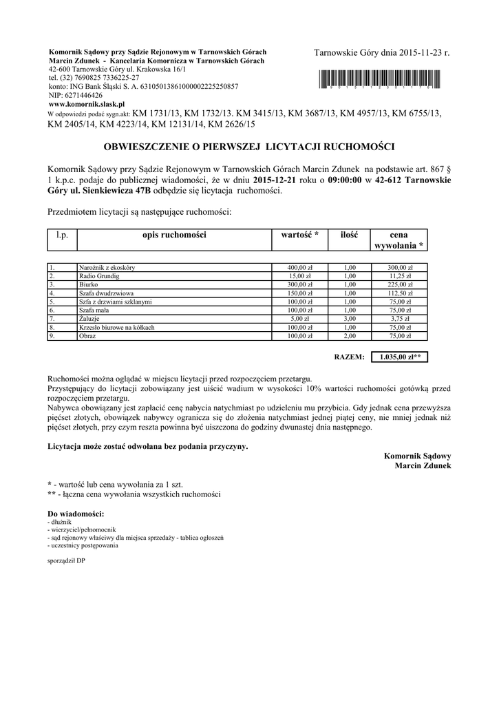 Tarnowskie Góry dnia 2015-11-23 r. Komornik Sądowy przy Sądzie Rejonowym w Tarnowskich Górach Marcin Zdunek - Kancelaria Komornicza w Tarnowskich Górach 42-600 Tarnowskie Góry ul. Krakowska 16/1 tel. (32) 7690825 7336225-27 konto: ING Bank Śląski S. A. 63105013861000002225250857 NIP: 6271446426 www.komornik.slask.pl *9015112301176* W odpowiedzi podać sygn.akt: KM 1731/13, KM 1732/13. KM 3415/13, KM 3687/13, KM 4957/13, KM 6755/13, KM 2405/14, KM 4223/14, KM 12131/14, KM 2626/15 OBWIESZCZENIE O PIERWSZEJ LICYTACJI RUCHOMOŚCI Komornik Sądowy przy Sądzie Rejonowym w Tarnowskich Górach Marcin Zdunek na podstawie art. 867 § 1 k.p.c. podaje do publicznej wiadomości, że w dniu 2015-12-21 roku o 09:00:00 w 42-612 Tarnowskie Góry ul. Sienkiewicza 47B odbędzie się licytacja ruchomości. Przedmiotem licytacji są następujące ruchomości: l.p. 1. 2. 3. 4. 5. 6. 7. 8. 9. opis ruchomości Narożnik z ekoskóry Radio Grundig Biurko Szafa dwudrzwiowa Szfa z drzwiami szklanymi Szafa mała Żaluzje Krzesło biurowe na kółkach Obraz wartość * ilość cena wywołania * 400,00 zł 15,00 zł 300,00 zł 150,00 zł 100,00 zł 100,00 zł 5,00 zł 100,00 zł 100,00 zł 1,00 1,00 1,00 1,00 1,00 1,00 3,00 1,00 2,00 300,00 zł 11,25 zł 225,00 zł 112,50 zł 75,00 zł 75,00 zł 3,75 zł 75,00 zł 75,00 zł RAZEM: 1.035,00 zł** Ruchomości można oglądać w miejscu licytacji przed rozpoczęciem przetargu. Przystępujący do licytacji zobowiązany jest uiścić wadium w wysokości 10% wartości ruchomości gotówką przed rozpoczęciem przetargu. Nabywca obowiązany jest zapłacić cenę nabycia natychmiast po udzieleniu mu przybicia. Gdy jednak cena przewyższa pięćset złotych, obowiązek nabywcy ogranicza się do złożenia natychmiast jednej piątej ceny, nie mniej jednak niż pięćset złotych, przy czym reszta powinna być uiszczona do godziny dwunastej dnia następnego. Licytacja może zostać odwołana bez podania przyczyny. Komornik Sądowy Marcin Zdunek * - wartość lub cena wywołania za 1 szt. ** - łączna cena wywołania wszystkich ruchomości Do wiadomości: - dłużnik - wierzyciel/pełnomocnik - sąd rejonowy właściwy dla miejsca sprzedaży - tablica ogłoszeń - uczestnicy postępowania sporządził DP