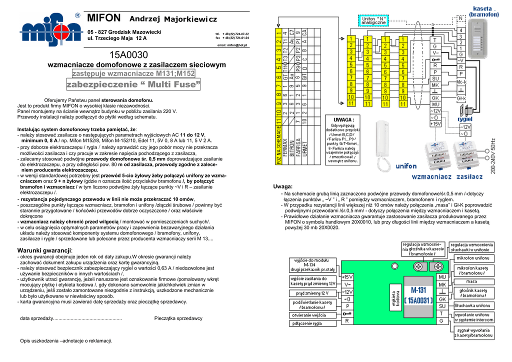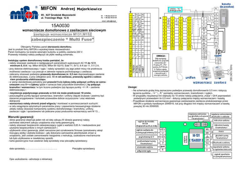 15A0030 wzmacniacze domofonowe z zasilaczem sieciowym zastępuje wzmacniacze M131;M152 zabezpieczenie “ Multi Fuse” Oferujemy Państwu panel sterowania domofonu. Jest to produkt firmy MIFON o wysokiej klasie niezawodności. Panel montujemy na ścianie wewnątrz budynku w pobliŜu zasilania 220 V. Przewody instalacji naleŜy podłączyć do płytki według schematu. Instalując system domofonowy trzeba pamiętać, Ŝe: - naleŜy stosować zasilacze o następujących parametrach wyjściowych AC 11 do 12 V, minimum 0, 8 A / np. Mifon M152/8, Mifon M-152/10, Edel 11, 5V 0, 8 A lub 11, 5 V 2 A. - przy doborze elektrozaczepu / rygla / naleŜy sprawdzić czy jego pobór mocy nie przekracza moŜliwości zasilacza i czy pracuje w zakresie napięcia pochodzącego z zasilacza, - zalecamy stosować podwójne przewody domofonowe śr. 0,5 mm doprowadzające zasilanie do elektrozaczepu, a przy odległości pow. 80 m od zasilacza, przewody zgodne z zaleceniem producenta elektrozaczepu. - w wersji standardowej potrzebny jest przewód 5-cio Ŝyłowy Ŝeby połączyć unifony ze wzmacniaczem oraz 9 + n Ŝyłowy /gdzie n oznacza ilość przycisków bramofonu /, by połączyć bramofon i wzmacniacz / w tym liczono podwójne Ŝyły łączące punkty ~V i R – zasilanie elektrozaczepu /. - rezystancja pojedynczego przewodu w linii nie moŜe przekraczać 10 omów, - poszczególne punkty łączące wzmacniacz, bramofon i unifony /złączki śrubowe / powinny być starannie przygotowane / końcówki przewodów dobrze oczyszczone / oraz właściwie dokręcone - wzmacniacz naleŜy chronić przed wilgocią / montować w pomieszczeniach suchych/. - w celu osiągnięcia optymalnych parametrów pracy i zapewnienia bezawaryjnego działania układu naleŜy stosować komponenty systemu domofonowego / bramofony, unifony, zasilacze i rygle / sprzedawane lub polecane przez producenta wzmacniaczy serii M 13.... Warunki gwarancji: - okres gwarancji obejmuje jeden rok od daty zakupu.W okresie gwarancji naleŜy zachować dokument zakupu urządzenia oraz kartę gwarancyjną. - naleŜy stosować bezpiecznik zabezpieczający rygiel o wartości 0,63 A / niedozwolone jest uŜywanie bezpieczników o innych wartościach /, - uŜytkownik utraci gwarancję, jeŜeli naruszone jest oznakowanie firmowe /pomalowany wkręt mocujący płytkę i etykieta kodowa /, gdy dokonano samowolnie jakichkolwiek zmian w urządzeniu, jeśli zostało zamontowane niezgodnie z instrukcją, uszkodzone mechanicznie lub było uŜytkowane w niewłaściwy sposób. - karta gwarancyjna musi zawierać datę sprzedaŜy oraz pieczątkę sprzedawcy. data sprzedaŜy................................................... Opis uszkodzenia –adnotacje o reklamacji. Pieczątka sprzedawcy Uwaga: - Na schemacie grubą linią zaznaczono podwójne przewody domofonowe/śr.0,5 mm /-dotyczy łączenia punktów „ ~V ” i „ R ” pomiędzy wzmacniaczem, bramofonem i ryglem. - W przypadku rezystancji linii większej niŜ 10 omów naleŜy połączenia „masa” i Gł-K poprowadzić podwójnymi przewodami /śr.0,5 mm/ - dotyczy połączenia między wzmacniaczem i kasetą. - Prawidłowe działanie wzmacniacza gwarantuje zastosowanie zasilacza produkowanego przez MIFON o symbolu handlowym 20X0010, lub przy długości linii między wzmacniaczem a kasetą powyŜej 30 mb 20X0020.