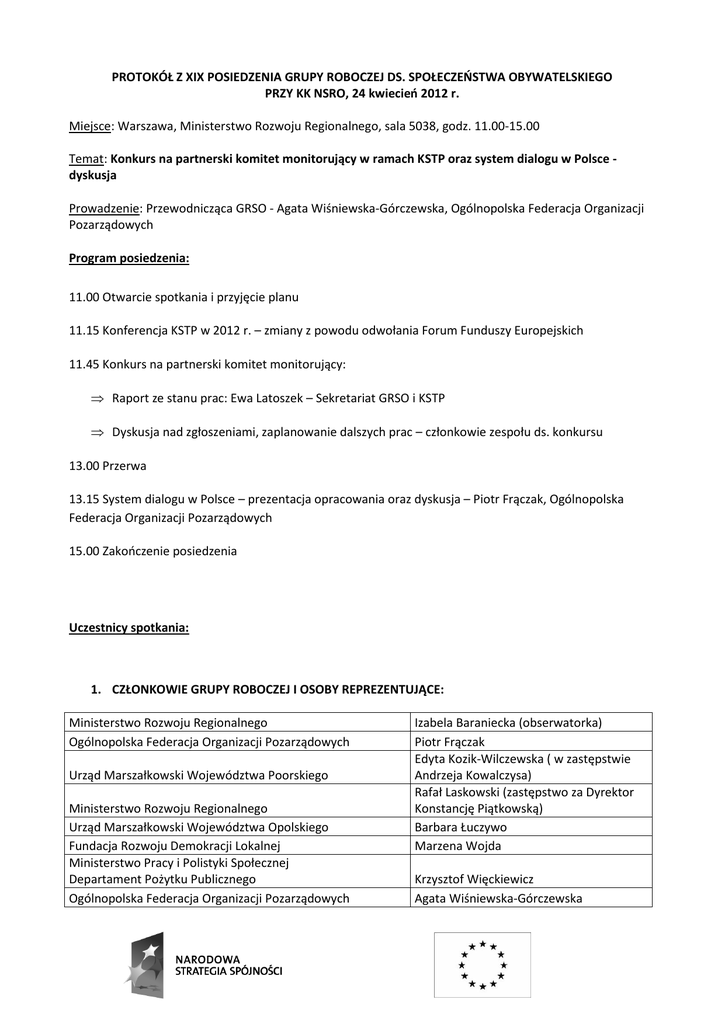 PROTOKÓŁ Z XIX POSIEDZENIA GRUPY ROBOCZEJ DS. SPOŁECZEŃSTWA OBYWATELSKIEGO PRZY KK NSRO, 24 kwiecień 2012 r. Miejsce: Warszawa, Ministerstwo Rozwoju Regionalnego, sala 5038, godz. 11.00-15.00 Temat: Konkurs na partnerski komitet monitorujący w ramach KSTP oraz system dialogu w Polsce dyskusja Prowadzenie: Przewodnicząca GRSO - Agata Wiśniewska-Górczewska, Ogólnopolska Federacja Organizacji Pozarządowych Program posiedzenia: 11.00 Otwarcie spotkania i przyjęcie planu 11.15 Konferencja KSTP w 2012 r. – zmiany z powodu odwołania Forum Funduszy Europejskich 11.45 Konkurs na partnerski komitet monitorujący: Raport ze stanu prac: Ewa Latoszek – Sekretariat GRSO i KSTP Dyskusja nad zgłoszeniami, zaplanowanie dalszych prac – członkowie zespołu ds. konkursu 13.00 Przerwa 13.15 System dialogu w Polsce – prezentacja opracowania oraz dyskusja – Piotr Frączak, Ogólnopolska Federacja Organizacji Pozarządowych 15.00 Zakończenie posiedzenia Uczestnicy spotkania: 1. CZŁONKOWIE GRUPY ROBOCZEJ I OSOBY REPREZENTUJĄCE: Ministerstwo Rozwoju Regionalnego Ogólnopolska Federacja Organizacji Pozarządowych Urząd Marszałkowski Województwa Poorskiego Ministerstwo Rozwoju Regionalnego Urząd Marszałkowski Województwa Opolskiego Fundacja Rozwoju Demokracji Lokalnej Ministerstwo Pracy i Polistyki Społecznej Departament Pożytku Publicznego Ogólnopolska Federacja Organizacji Pozarządowych Izabela Baraniecka (obserwatorka) Piotr Frączak Edyta Kozik-Wilczewska ( w zastępstwie Andrzeja Kowalczysa) Rafał Laskowski (zastępstwo za Dyrektor Konstancję Piątkowską) Barbara Łuczywo Marzena Wojda Krzysztof Więckiewicz Agata Wiśniewska-Górczewska 2. OBSERWATORZY I GOŚCIE: Wiceminister Rozwoju Regionalnego Ministerstwo Rozwoju Regionalnego Departament Informacji, Promocji i Szkoleń Ministerstwo Rozwoju Regionalnego Departament Informacji, Promocji i Szkoleń Ministerstwo Rozwoju Regionalnego Departament Koordynacji Polityki Strukturalnej Ministerstwo Rozwoju Regionalnego Departament Koordynacji Polityki Strukturalnej Ministerstwo Pracy i Polityki Społecznej Marceli Niezgoda Magdalena Dziubek-Grudzińska Edyta Męczyńska Renata Calak Anna Sulińska-Wójcik Tomasz Jałukowicz Protokołowała Ogólnopolska Federacja Organizacji Pozarządowych Ewa Latoszek O godzinie 11:15 Przewodnicząca Grupy roboczej, pani Agata Wiśniewska-Górczewska otworzyła zebranie. Pierwsza część spotkania poświęcona była omówieniu kwestii związanych z Krajową Siecią Tematyczną ds. Partnerstwa. Dyskusja dotyczyła ustalenia konferencji krajowej, która planowana była na 11 maja, jednak z uwagi na odwołane Forum Funduszy Europejskich została zawieszona. Proponowane terminy to październik 2012 – dokładnie okolice 24.10 lub koniec czerwca 2012 (w ramach Krajowego Forum Terytorialnego). Decyzja nie została jeszcze podjęta. Grupa przyjrzała się nadesłanym zgłoszeniom do konkursu na najbardziej partnerski komitet (zgłosiło się 8 komitetów: 4 Komitety Monitorujące Regionalne Programy Operacyjne z następujących województw: dolnośląskiego, kujawsko-pomorskiego, podkarpackiego oraz opolskiego oraz 4 Podkomitety Monitorujące Program Operacyjny Kapitał Ludzki z następujących województw: dolnośląskiego, śląskiego, opolskiego i warmińsko-mazurskiego) i ustaliła, że wszystkie komitety powinny przejść do drugiego etapu, który powinien potrwać do końca czerwca. Roboczy zespół, który zajmuje się konkursem wytypuje potencjalnych zwycięzców i na następnym posiedzeniu Grupy przedstawi swoje typy pozostałym członkom, by wspólnie wyłonić zwycięzcę. Podczas dyskusji doprecyzowano również miejsca pozostałych spotkań regionalnych KSTP w 2012 roku: 1) VIII spotkanie regionalne – połączenie dwóch województw: wielkopolskie i kujawsko-pomorskie – 19-20.09 2) IX spotkanie regionalne – połączenie dwóch województw: warmińsko-mazurskie i podlaskie – 21-22.11 Ostatnim punktem spotkania była dyskusja na temat systemu dialogu w Polsce. W dyskusji uczestniczył gość specjalny, pan Marceli Niezgoda, Wiceminister Rozwoju Regionalnego. Ta część spotkania toczyła się w oparciu o opracowanie przygotowane przez Piotra Frączaka dla Ogólnopolskiej Federacji Organizacji Pozarządowych, a dotyczące systemu realizacji zasady partnerstwa i rekomendacji co do zasad nią rządzących oraz form instytucjonalnych. Celem opracowania było sformułowanie podstawowych pytań mających na celu wypracowanie założeń do systemu dialogu obywatelskiego w Polsce. Tematyka ta będzie w dalszym ciągu przedmiotem zainteresowania Grupy roboczej, zwłaszcza w kontekście planowania polityk publicznych z wykorzystaniem narzędzi dla kolejnego okresu programowania (2014-2020). Ustalenia: 1. Ministerstwo Rozwoju Regionalnego sfinansuje koszty konferencji krajowej KSTP w zakresie: Lp. Rodzaj kosztów 1 Noclegi gości z zagranicy 2 Sala konferencyjna + 2 warsztatowe (jeżeli Finansowanie tak - max 10 osób tak będą potrzebne) 3 Wysyłka zaproszeń do uczestników 4 Materiały konferencyjne (teczki, długopisy itp.) nie tak 5 Tłumaczenie symultaniczne pl-ang. i ang-pl tak 6 Nagrody (statuetki) dla laureatów konkursu nie na partnerski komitet monitorujący 7 Dyplomy dla laureatów konkursu na partnerski komitet monitorujący tak – wydruk dyplomów 8 Catering dla uczestników 9 Zaangażowanie w działania promocyjne konferencji (w tym wsparcie w zaproszeniu gości z zagranicy) tak wsparcie w zaproszeniu prelegentów z zagranicy – uzyskanie podpisu Pani Minister na zaproszeniach 10 Wynagrodzenie dla moderatora 11 Wynagrodzenie dla prelegentów nie nie Załączniki: 1. Zestawienie nadesłanych komitet/podkomitet. 8 zgłoszeń do Konkursu na najbardziej partnerski 2. Robocza wersja systemu dialogu w Polsce – oprac. P. Frączak, OFOP Przewodnicząca Grupy roboczej ds. społeczeństwa obywatelskiego Agata Wiśniewska-Górczewska Protokolantka Ewa Latoszek