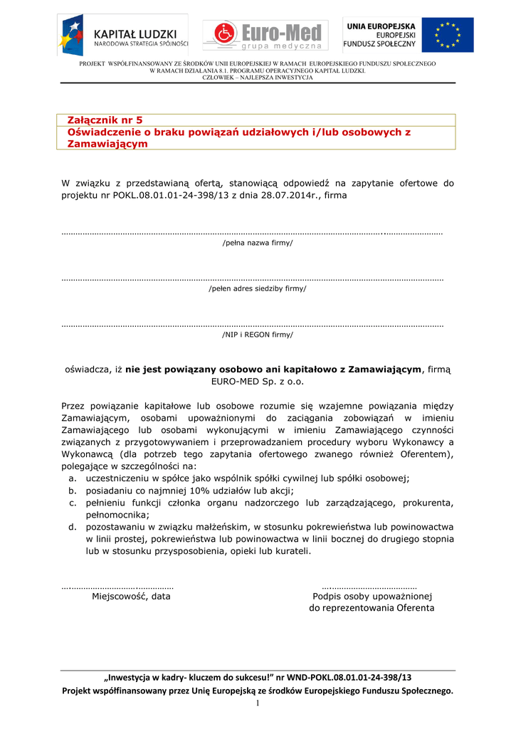 PROJEKT WSPÓŁFINANSOWANY ZE ŚRODKÓW UNII EUROPEJSKIEJ W RAMACH EUROPEJSKIEGO FUNDUSZU SPOŁECZNEGO W RAMACH DZIAŁANIA 8.1. PROGRAMU OPERACYJNEGO KAPITAŁ LUDZKI. CZŁOWIEK – NAJLEPSZA INWESTYCJA Załącznik nr 5 Oświadczenie o braku powiązań udziałowych i/lub osobowych z Zamawiającym W związku z przedstawianą ofertą, stanowiącą odpowiedź na zapytanie ofertowe do projektu nr POKL.08.01.01-24-398/13 z dnia 28.07.2014r., firma ………………………………………………………………………………………………………………………..…………………… /pełna nazwa firmy/ ……………………………………………………………………………………………………………………………………………… /pełen adres siedziby firmy/ ……………………………………………………………………………………………………………………………………………… /NIP i REGON firmy/ oświadcza, iż nie jest powiązany osobowo ani kapitałowo z Zamawiającym, firmą EURO-MED Sp. z o.o. Przez powiązanie kapitałowe lub osobowe rozumie się wzajemne powiązania między Zamawiającym, osobami upoważnionymi do zaciągania zobowiązań w imieniu Zamawiającego lub osobami wykonującymi w imieniu Zamawiającego czynności związanych z przygotowywaniem i przeprowadzaniem procedury wyboru Wykonawcy a Wykonawcą (dla potrzeb tego zapytania ofertowego zwanego również Oferentem), polegające w szczególności na: a. uczestniczeniu w spółce jako wspólnik spółki cywilnej lub spółki osobowej; b. posiadaniu co najmniej 10% udziałów lub akcji; c. pełnieniu funkcji członka organu nadzorczego lub zarządzającego, prokurenta, pełnomocnika; d. pozostawaniu w związku małżeńskim, w stosunku pokrewieństwa lub powinowactwa w linii prostej, pokrewieństwa lub powinowactwa w linii bocznej do drugiego stopnia lub w stosunku przysposobienia, opieki lub kurateli. ….……………………….…………… Miejscowość, data ….……………………………… Podpis osoby upoważnionej do reprezentowania Oferenta „Inwestycja w kadry- kluczem do sukcesu!” nr WND-POKL.08.01.01-24-398/13 Projekt współfinansowany przez Unię Europejską ze środków Europejskiego Funduszu Społecznego. 1