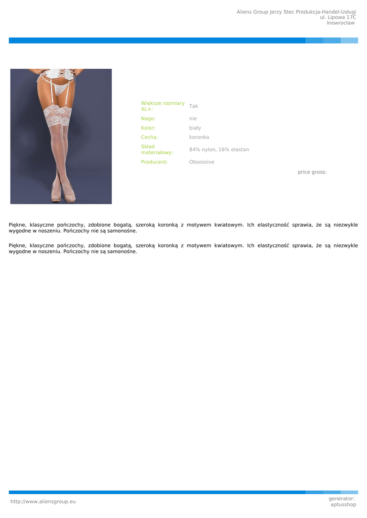 Aliens Group Jerzy Stec Produkcja-Handel-Usługi ul. Lipowa 17C Inowrocław Większe rozmiary Tak XL+: Nago: nie Kolor: biały Cecha: koronka Skład materiałowy: 84% nylon, 16% elastan Producent: Obsessive price gross: Piękne, klasyczne pończochy, zdobione bogatą, szeroką koronką z motywem kwiatowym. Ich elastyczność sprawia, że są niezwykle wygodne w noszeniu. Pończochy nie są samonośne. Piękne, klasyczne pończochy, zdobione bogatą, szeroką koronką z motywem kwiatowym. Ich elastyczność sprawia, że są niezwykle wygodne w noszeniu. Pończochy nie są samonośne. http://www.aliensgroup.eu generator: aptusshop