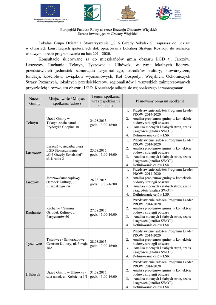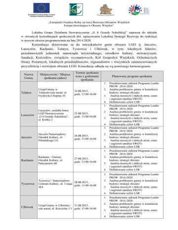 „Europejski Fundusz Rolny na rzecz Rozwoju Obszarów Wiejskich Europa Inwestująca w Obszary Wiejskie” Lokalna Grupa Działania Stowarzyszenie „G 6 Grzędy Sokalskiej” zaprasza do udziału w otwartych konsultacjach społecznych dot. opracowania Lokalnej Strategii Rozwoju do realizacji w nowym okresie programowania na lata 2014-2020. Konsultacje skierowane są do mieszkańców gmin obszaru LGD tj. Jarczów, Łaszczów, Rachanie, Telatyn, Tyszowce i Ulhówek, w tym: lokalnych liderów, przedstawicieli jednostek samorządu terytorialnego, ośrodków kultury, stowarzyszeń, fundacji, Kościołów, związków wyznaniowych, Kół Gospodyń Wiejskich, Ochotniczych Straży Pożarnych, lokalnych przedsiębiorców, regionalistów i wszystkich zainteresowanych przyszłością i rozwojem obszaru LGD. Konsultacje odbędą się wg poniższego harmonogramu: Nazwa Gminy Miejscowość / Miejsce spotkania (adres) Termin spotkania wraz z godzinami spotkania Planowany program spotkania 1. Telatyn Urząd Gminy w Telatynie/sala narad, ul. Fryderyka Chopina 10 24.08.2015, godz. 13:00-16:00 2. 3. 4. 1. Łaszczów Łaszczów, siedziba biura LGD Stowarzyszenie „G 6 Grzędy Sokalskiej”, ul. Krótka 2 25.08.2015, godz. 13:00-16:00 2. 3. 4. 1. Jarczów Jarczów/Samorządowy Ośrodek Kultury, ul. Piłsudskiego 2A 26.08.2015, godz. 13:00-16:00 2. 3. 4. 1. Rachanie Rachanie / Gminny Ośrodek Kultury, ul. Partyzantów 60 27.08.2015, godz. 13:00-16:00 2. 3. 4. 1. Tyszowce Tyszowce / Samorządowe 28.08.2015, Centrum Kultury, ul. 3 maja godz. 13:00-16:00 36A 2. 3. 4. 1. Ulhówek Urząd Gminy w Ulhówku / 31.08.2015, sala narad, ul. Kościelna 1/1 godz. 13:00-16:00 2. 3. 4. Przedstawienie założeń Programu Leader PROW 2014-2020 Analiza problemów gminy w kontekście budowy strategii obszaru Analiza mocnych i słabych stron, szans i zagrożeń (analiza SWOT) Definiowanie celów LSR Przedstawienie założeń Programu Leader PROW 2014-2020 Analiza problemów gminy w kontekście budowy strategii obszaru Analiza mocnych i słabych stron, szans i zagrożeń (analiza SWOT) Definiowanie celów LSR Przedstawienie założeń Programu Leader PROW 2014-2020 Analiza problemów gminy w kontekście budowy strategii obszaru Analiza mocnych i słabych stron, szans i zagrożeń (analiza SWOT) Definiowanie celów LSR Przedstawienie założeń Programu Leader PROW 2014-2020 Analiza problemów gminy w kontekście budowy strategii obszaru Analiza mocnych i słabych stron, szans i zagrożeń (analiza SWOT) Definiowanie celów LSR Przedstawienie założeń Programu Leader PROW 2014-2020 Analiza problemów gminy w kontekście budowy strategii obszaru Analiza mocnych i słabych stron, szans i zagrożeń (analiza SWOT) Definiowanie celów LSR Przedstawienie założeń Programu Leader PROW 2014-2020 Analiza problemów gminy w kontekście budowy strategii obszaru Analiza mocnych i słabych stron, szans i zagrożeń (analiza SWOT) Definiowanie celów LSR