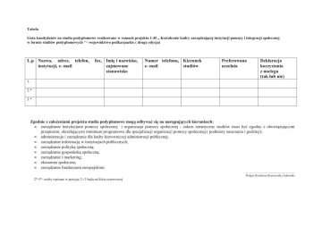 Tabela Lista kandydatów na studia podyplomowe realizowane w ramach projektu 1.45 ,, Kształcenie kadry zarządzającej instytucji pomocy i integracji społecznej w formie studiów podyplomowych ‘’- województwo podkarpackie ( druga edycja) L.p Nazwa, adres, telefon, instytucji, e- mail fax, Imię i nazwisko, zajmowane stanowisko Numer telefonu, Kierunek e- mail studiów Preferowana uczelnia Deklaracja korzystania z noclegu (tak lub nie) 1. 2.* 3.* Zgodnie z założeniami projektu studia podyplomowe mogą odbywać się na następujących kierunkach: • zarządzanie instytucjami pomocy społecznej i organizacja pomocy społecznej - zakres tematyczny studiów musi być zgodny z obowiązującymi przepisami, określającymi minimum programowe dla specjalizacji organizacji pomocy społecznej ( podmioty nauczania i godziny); • administracja i zarządzanie dla kadry kierowniczej administracji publicznej; • zarządzanie informacją w instytucjach publicznych; • zarządzanie polityką społeczną; • zarządzanie gospodarką społeczną; • zarządzanie i marketing; • ekonomia społeczna; • zarządzanie funduszami europejskimi. …………………………………….. Podpis Dyrektora/Kierownika Jednostki 2*-3*- osoby wpisane w pozycje 2 i 3 będą na liście rezerwowej