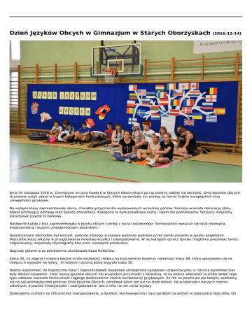 Dzień Języków Obcych w Gimnazjum w Starych Oborzyskach (2016-12-14) Dnia 30 listopada 2016 w Gimnazjum im Jana Pawła II w Starych Oborzyskach po raz kolejny odbyły się obchody Dnia Języków Obcych. Uczniowie wzięli udział w trzech kategoriach konkursowych, które sprawdzały ich wiedzę na temat krajów europejskich oraz umiejętności językowe. Na wstępie klasy zaprezentowały dania, charakterystyczne dla wylosowanych wcześniej państw. Komisja oceniała dekorację stołu, plakat promujący potrawę oraz sposób prezentacji. Kategoria ta była prawdziwą ucztą i rajem dla podniebienia. Wszyscy mogliśmy skosztować pyszne te potrawy. Następnie każda z klas zaprezentowała w języku obcym scenkę z życia codziennego. Gimnazjaliści wykazali się tutaj niezwykłą kreatywnością i dużymi umiejętnościami aktorskimi.. Uwieńczeniem obchodów był koncert, podczas którego uczniowie wykonali wybrane przez siebie piosenki w języku angielskim. Wszystkie klasy włożyły w przygotowania mnóstwo wysiłku i zaangażowania. W tej kategorii oprócz śpiewu mogliśmy podziwiać taniec indywidualny, wspaniałą choreografię klas oraz niezwykłe przebrania. Nagrody główne oraz pocieszenia ufundowała Rada Rodziców. Klasa 3A, za zajęcie I miejsca będzie miała możliwość relaksu na kościańskim basenie, natomiast klasa 3B, która uplasowała się na miejscu II wyjedzie na łyżwy. III miejsce i pyszną pizzę wygrała klasa 3C. Należy wspomnieć, że tegoroczne klasy I zaprezentowały wspaniałe umiejętności językowe i organizacyjne, a różnice punktowe klas były bardzo niewielkie. Choć nauka języków obcych nie wszystkim przychodzi z łatwością, to na pewno większość uczniów dzięki tego typu zabawie zauważa konieczność ciągłego doskonalenia swoich kompetencji językowych. Za rok na pewno po raz kolejny spotkamy się na sali gimnastycznej podczas Dnia Języków Obcych, ponieważ dzień ten już na stałe wpisał się w kalendarz naszych imprez szkolnych, a poziom kreatywności i zaangażowania jest z roku na rok coraz wyższy. Dziękujemy uczniom za 100 procent zaangażowania, a dyrekcji, wychowawcom i nauczycielom za pomoc w organizacji tego dnia. Do zobaczenia za rok. Nauczyciele języków obcych Gimnazjum im. Jana Pawła II w Starych Oborzyskach Dnia 30 listopada 2016 w Gimnazjum im Jana Pawła II w Starych Oborzyskach po raz kolejny odbyły się obchody Dnia Języków Obcych. Uczniowie wzięli udział w trzech kategoriach konkursowych, które sprawdzały ich wiedzę na temat krajów europejskich oraz umiejętności językowe. Na wstępie klasy zaprezentowały dania, charakterystyczne dla wylosowanych wcześniej państw. Komisja oceniała dekorację stołu, plakat promujący potrawę oraz sposób prezentacji. Kategoria ta była prawdziwą ucztą i rajem dla podniebienia. Wszyscy mogliśmy skosztować pyszne te potrawy. Następnie każda z klas zaprezentowała w języku obcym scenkę z życia codziennego. Gimnazjaliści wykazali się tutaj niezwykłą kreatywnością i dużymi umiejętnościami aktorskimi. Uwieńczeniem obchodów był koncert, podczas którego uczniowie wykonali wybrane przez siebie piosenki w języku angielskim. Wszystkie klasy włożyły w przygotowania mnóstwo wysiłku i zaangażowania. W tej kategorii oprócz śpiewu mogliśmy podziwiać taniec indywidualny, wspaniałą choreografię klas oraz niezwykłe przebrania. Nagrody główne oraz pocieszenia ufundowała Rada Rodziców. Klasa 3A, za zajęcie I miejsca będzie miała możliwość relaksu na kościańskim basenie, natomiast klasa 3B, która uplasowała się na miejscu II wyjedzie na łyżwy. III miejsce i pyszną pizzę wygrała klasa 3C. Należy wspomnieć, że tegoroczne klasy I zaprezentowały wspaniałe umiejętności językowe i organizacyjne, a różnice punktowe klas były bardzo niewielkie. Choć nauka języków obcych nie wszystkim przychodzi z łatwością, to na pewno większość uczniów dzięki tego typu zabawie zauważa konieczność ciągłego doskonalenia swoich kompetencji językowych. Za rok na pewno po raz kolejny spotkamy się na sali gimnastycznej podczas Dnia Języków Obcych, ponieważ dzień ten już na stałe wpisał się w kalendarz naszych imprez szkolnych, a poziom kreatywności i zaangażowania jest z roku na rok coraz wyższy. Dziękujemy uczniom za 100 procent zaangażowania, a dyrekcji, wychowawcom i nauczycielom za pomoc w organizacji tego dnia. Do zobaczenia za rok. Nauczyciele języków obcych Gimnazjum im. Jana Pawła II w Starych Oborzyskach Powered by TCPDF (www.tcpdf.org)