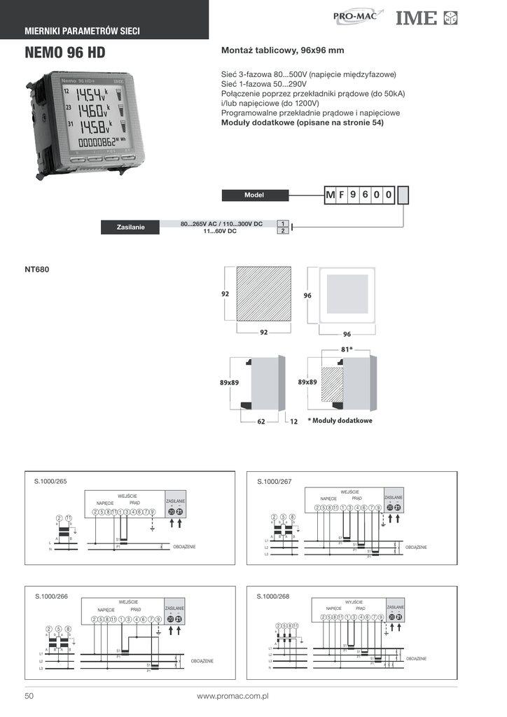 mierniki parametrów sieci nemo 96 HD Montaż tablicowy, 96x96 mm Sieć 3-fazowa 80...500V (napięcie międzyfazowe) Sieć 1-fazowa 50...290V Połączenie poprzez przekładniki prądowe (do 50kA) i/lub napięciowe (do 1200V) Programowalne przekładnie prądowe i napięciowe Moduły dodatkowe (opisane na stronie 54) 9 6 Model 80...265V AC / 110...300V DC 11...60V DC Zasilanie NT680 S.1000/265 S.1000/267 WEJŚCIE WEJŚCIE 11 2 L a b A B 2 5 8 11 1 3 20 21 2 5 8 11 1 3 4 6 7 9 S1 L1 P1 N X 5 2 OBCIĄŻENIE a b a b A B A B S1 P1 X S1 P1 2 5 8 11 1 3 5 2 a b 4 6 S.1000/268 7 9 L2 L3 50 A B A 20 21 4 6 7 9 20 21 2 5 8 11 a b B OBCIĄŻENIE ZASILANIE + – PRĄD 2 5 8 11 1 3 A L1 X WYJŚCIE NAPIĘCIE 8 a X S1 P1 ZASILANIE + – PRĄD NAPIĘCIE 20 21 8 L2 WEJŚCIE 7 9 4 6 L3 S.1000/266 ZASILANIE + – PRĄD NAPIĘCIE ZASILANIE + – PRĄD NAPIĘCIE L1 S1 P1 X S1 X L2 X OBCIĄŻENIE L3 N P1 www.promac.com.pl S1 P1 X S1 P1 X S1 P1 X X X X OBCIĄŻENIE mierniki parametrów sieci nemo 96HD Programowanie Programowanie parametrów: poprzez 4 przyciski na panelu przednim. Dostęp do programowania: chroniony hasłem. Przechowywanie parametrów konfiguracyjnych: pamięć nieulotna (bez baterii). Programowalne parametry WEJŚCIE Układ połączeń: sieć 1-fazowa, 3-fazowa 3- lub 4-przewodowa. Prąd: 1 albo 5A. Przekładnia zewnętrznych przekładników napięciowych: 1…3000 (max. wartość napięcia pierwotnego U1: 300kV). Przekładnia zewnętrznych przekładników prądowych: 1…9999 (max. wartość prądu pierwotnego I1: 50kA/5A albo 10kA/1A). Zasilanie Napięcie znamionowe zasilania Uzas: 80…265V AC. Częstotliwość znamionowa zasilania fn: 50Hz. Częstotliwość pracy: 47…63Hz. Obciążenie znamionowe: ≤ 4VA (bez modułów dodatkowych). Napięcie znamionowe zasilania Uzas: 110…300V DC. Obciążenie znamionowe: ≤ 3,5W (bez modułów dodatkowych). Zabezpieczenie przed zamianą biegunów zasilania. Prąd średni - Moc średnia Okres uśredniania: 5/8/10/15/20/30/60 min. Wyświetlacz Kontrast: cztery wybieralne wartości. Podświetlenie: 0 – 30 – 70 – 100%. Strona własna: wybór wyświetlanych wielkości. Wizualizacja Typ wyświetlacza: LCD podświetlany, podświetlanie wyłączane automatycznie po 20s od ostatniego naciśnięcia klawisza. Liczba punktów wyświetlacza: 10 000 (4 cyfry). Zliczanie energii: licznik 8-cyfrowy (wysokość cyfry: 8mm). Jednostki: automatyczne, uwzględniające zaprogramowane przekładnie prądowe i napięciowe. Dokładność odczytu: automatyczna, wskazująca możliwie największą wartość dziesiętną. Aktualizacja pomiarów: co 1,1s. Możliwość stworzenia własnych stron użytkownika. Pomiar Napięcia: - fazowe i międzyfazowe - wartości minimalne i maksymalne napięć - zawartość THD w napięciach fazowych Prądy: - fazowy i przewodu neutralnego - średni i wartość maksymalna pradu średniego - średnia prądów fazowych (I1+I2+I3/3) - zawartość THD w prądach fazowych Wejście Sieć: 1-fazowa, 3-fazowa 3- lub 4-przewodowa. Napięcie sieci 3-fazowej: 80…500V (międzyfazowe). Napięcie sieci 1-fazowej: 50…290V. Podłączenie przez przekładniki prądowe. Prąd znamionowy In: 5A albo 1A. Wartość maksymalna prądu: 1,2 In. Przeciążenie chwilowe: 20 In/0,5s. Częstotliwość znamionowa fn: 50Hz. Tolerancja: 47…63Hz. Rodzaj pomiaru: wartość skuteczna rzeczywista (true RMS). Zawartość harmonicznych: do 16. Czas rozpoczęcia zliczania energii: < 5s. Obciążenie znamionowe obwodów napięciowych: ≤ 0,5VA (każda faza). Obciążenie znamionowe obwodów prądowych: ≤ 0,5VA (każda faza). Izolacja Kategoria instalacji: III. Stopień zanieczyszczenia: 2. Napięcie znamionowe izolacji: 300V. Test impulsem napięcia 6kV 1,2/50µs 0,5J. Badane obwody: pomiarowy, zasilania. Test napięciem przemiennym o wartości skutecznej 4kV 50Hz/1min. Badane obwody: wszystkie obwody względem masy. Moce: 3-fazowa: czynna, bierna, pozorna - fazowa: czynna, bierna, pozorna - moc średnia: czynna, bierna, pozorna - wartość maksymalna mocy średniej: czynna, bierna, pozorna Kompatybilność elektromagnetyczna Test emisji i odporności zgodnie z PN-EN 62052-11. Energia: - współczynnik mocy fazowy - 3-fazowy - częstotliwość - licznik godzin pracy - energia czynna pobrana (częściowa i całkowita) - energia bierna pobrana (częściowa i całkowita) - energia czynna oddana - energia bierna oddana Obudowa Stopień ochrony (PN-EN 60529): IP54 panel przedni, IP20 zaciski. Warunki środowiskowe Zakres znamionowych temperatury pracy: -5…55°C. Możliwa praca w warunkach tropikalnych. www.promac.com.pl 51 moduły dodatkowe NEMO MD Moduły dodatkowe Umożliwiają rozbudowę i konfigurację miernika wedle potrzeb użytkownika. Do miernika mogą być podłączone maksymalnie 4 moduły. Nemo MD Moduł Kod zamówieniowy Typ interfejsu Standard Maksymalna prędkość transmisji IF96001 IF96002 IF96007 IF96009 IF96013 Komunikacja RS485 Komunikacja RS232 Komunikacja Profibus Komunikacja LonWorks Komunikacja M-BUS JBUS/MODBUS RS232-C EN50170 Transceiver FTT10 EN1434-3 38,4Kb/s 38,4Kb/s 3Mb/s - 9,6Kb/s Nemo MD Moduł IF96003 IF96004 IF96005 IF96006 Typ interfejsu wyjście impulsowe wyjście analogowe wyjście alarmowe pomiar prądu w przewodzie neutralnym Liczba wyjść 2 2 2 - 2 x pojedynczy styk wyłącz/załącz 0...20mA - 4...20mA 2 x pojedynczy styk wyłącz/załącz - Kod zamówieniowy Wyjście Nemo MD Moduł IF96010 IF96011 IF96012 Wejście/Wyjście Wejście/Wyjście Pamięć zapisu wartości energii Pamięć - - > 2Mb Wejście Pojedynczy styk wyłącz/załącz 12 - 24V DC napięciowe - 2 2 - Przekaźnik optoelektroniczny ze stykiem (NO) Przekaźnik optoelektroniczny ze stykiem (NO) RS485 2 2 1 Kod zamówieniowy Typ interfejsu Liczba wejść Wyjście Liczba wyjść 54 www.promac.com.pl moduły dodatkowe C D B A Pozycja Opis Ilość maksymalna A IF96001 Komunikacja RS485 1 • IF96002 Komunikacja RS232 1 IF96003 2 wyjścia impulsowe 2 IF96004 2 wyjścia anal