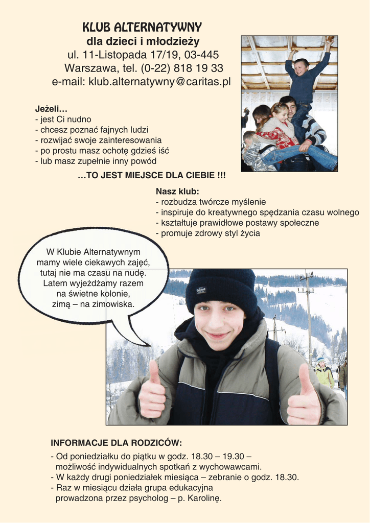 KLUB ALTERNATYWNY dla dzieci i młodzieży ul. 11-Listopada 17/19, 03-445 Warszawa, tel. (0-22) 818 19 33 e-mail: [email protected] Jeżeli… - jest Ci nudno - chcesz poznać fajnych ludzi - rozwijać swoje zainteresowania - po prostu masz ochotę gdzieś iść - lub masz zupełnie inny powód …TO JEST MIEJSCE DLA CIEBIE !!! Nasz klub: - rozbudza twórcze myślenie - inspiruje do kreatywnego spędzania czasu wolnego kształtuje prawidłowe postawy społeczne - ks promuje zdrowy styl życia - pr W Klubie Alternatywnym mamy wiele ciekawych zajęć, tutaj nie ma czasu na nudę. Latem wyjeżdżamy razem na świetne kolonie, zimą – na zimowiska. INFORMACJE DLA RODZICÓW: - Od poniedziałku do piątku w godz. 18.30 – 19.30 – możliwość indywidualnych spotkań z wychowawcami. - W każdy drugi poniedziałek miesiąca – zebranie o godz. 18.30. - Raz w miesiącu działa grupa edukacyjna prowadzona przez psycholog – p. Karolinę. Zajęcia odbywające się w Klubie Alternatywnym: JUDO - poniedziałki i piątki w godz. 16.00-18.00 Prowadzący – mgr Małgorzata Szostało ZAJĘCIA SZACHOWE - wtorki w godz. 16.00-17.00 Prowadzący – mgr Adil Kheldouni KÓŁKO MATEMATYCZNE - poniedziałki w godz. 15.30-17.00 Prowadzący – mgr Adil Kheldouni NAUKA GRY NA GITARZE – wtorki w godz. 16.00-18.00 Prowadzący – wolontariuszka p. Ewa NAUKA GRY NA BĘBNACH – czwartki w godz. 18.00-19.00 Prowadzący – Jacek ZAJĘCIA PLASTYCZNE – wtorki i czwartki w godz. 17.00-19.00 Prowadzący – mgr Waldemar Miaśkiewicz ZAJĘCIA KULINARNE - piątki w godz. 14.00-16.00 Prowadzący – mgr Kamila Srebrzyńska ZAJĘCIA JĘZYKOWE - środy w godz. 17.00-19.00 Prowadzący – mgr Waldemar Miśkiewicz ZAJĘCIA INFORMATYCZNE – poniedziałki i czwartki, godz. 17.00-19.00 Prowadzący – mgr Łukasz Kowalski JĘZYK ANGIELSKI gr. podstawowa – poniedziałki w godz. 16.00-17.00 Prowadzący – mgr Kamila Srebrzyńska ZAJĘCIA KULTUROZNAWCZE – poniedziałki i wtorki w godz. 16.00-18.00 Prowadzący – mgr. Magda Adamska ZAJĘCIA SOCJOTERAPEUTYCZNE - środy w godz. 15.00-18.00 PSYCHOLOG - konsultacje z rodzicami – środyy w godz. 18.00-19.00 Prowadzący – mgr Karolina Konwińska ZAPRASZAMY :)