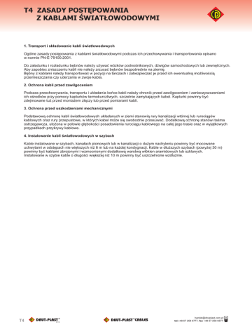 AND PLAS RE C TI W I T4 ZASADY POSTÊPOWANIA Z KABLAMI ŒWIAT£OWODOWYMI 1. Transport i sk³adowanie kabli œwiat³owodowych Ogólne zasady postêpowania z kablami œwiat³owodowymi podczas ich przechowywania i transportowania opisano w normie PN-E-79100:2001. Do za³adunku i roz³adunku bêbnów nale¿y u¿ywaæ wózków podnoœnikowych, dŸwigów samochodowych lub zewnêtrznych. Aby zapobiec zniszczeniu kabli nie nale¿y zrzucaæ bêbnów bezpoœrednio na ziemiê. Bêbny z kablami nale¿y transportowaæ w pozycji na tarczach i zabezpieczaæ je przed ich ewentualn¹ mo¿liwoœci¹ przemieszczania czy uderzania w zwoje kabla. 2. Ochrona kabli przed zawilgoceniem Podczas przechowywania, transportu i uk³adania koñce kabli nale¿y chroniæ przed zawilgoceniem i zanieczyszczeniami ich oœrodków przy pomocy kapturków termokurczliwych, szczelnie zamykaj¹cych kabel. Kapturki powinny byæ zdejmowane tu¿ przed monta¿em z³¹czy lub przed pomiarami kabli. 3. Ochrona przed uszkodzeniami mechanicznymi Podstawow¹ ochronê kabli œwiat³owodowych uk³adanych w ziemi stanowi¹ rury kanalizacji wtórnej lub ruroci¹gów kablowych oraz rury przepustowe, w których kabel mo¿e siê swobodnie przesuwaæ. Dodatkow¹ ochronê stanowi taœma ostrzegawcza, u³o¿ona w po³owie g³êbokoœci posadowienia ruroci¹gu kablowego na ca³ej jego trasie oraz w wyj¹tkowych przypadkach przykrywy kablowe. 4. Instalowanie kabli œwiat³owodowych w szybach Kable instalowane w szybach, kana³ach pionowych lub w kanalizacji o du¿ym nachyleniu powinny byæ mocowane uchwytami w odstêpach nie wiêkszych ni¿ 6 m lub na ka¿dej kondygnacji. Kable w d³u¿szych szybach (powy¿ej 30 m) powinny byæ kablami zbrojonymi i wzmocnionymi dodatkow¹ warstw¹ w³ókien aramidowych lub szklanych. Instalowane w szybie kable o d³ugoœci wiêkszej ni¿ 10 m powinny byæ uszczelnione wzd³u¿nie. T4 V. 7.0 CABLES [email protected] tel.+48 67 258 9777, fax +48 67 258 9577
